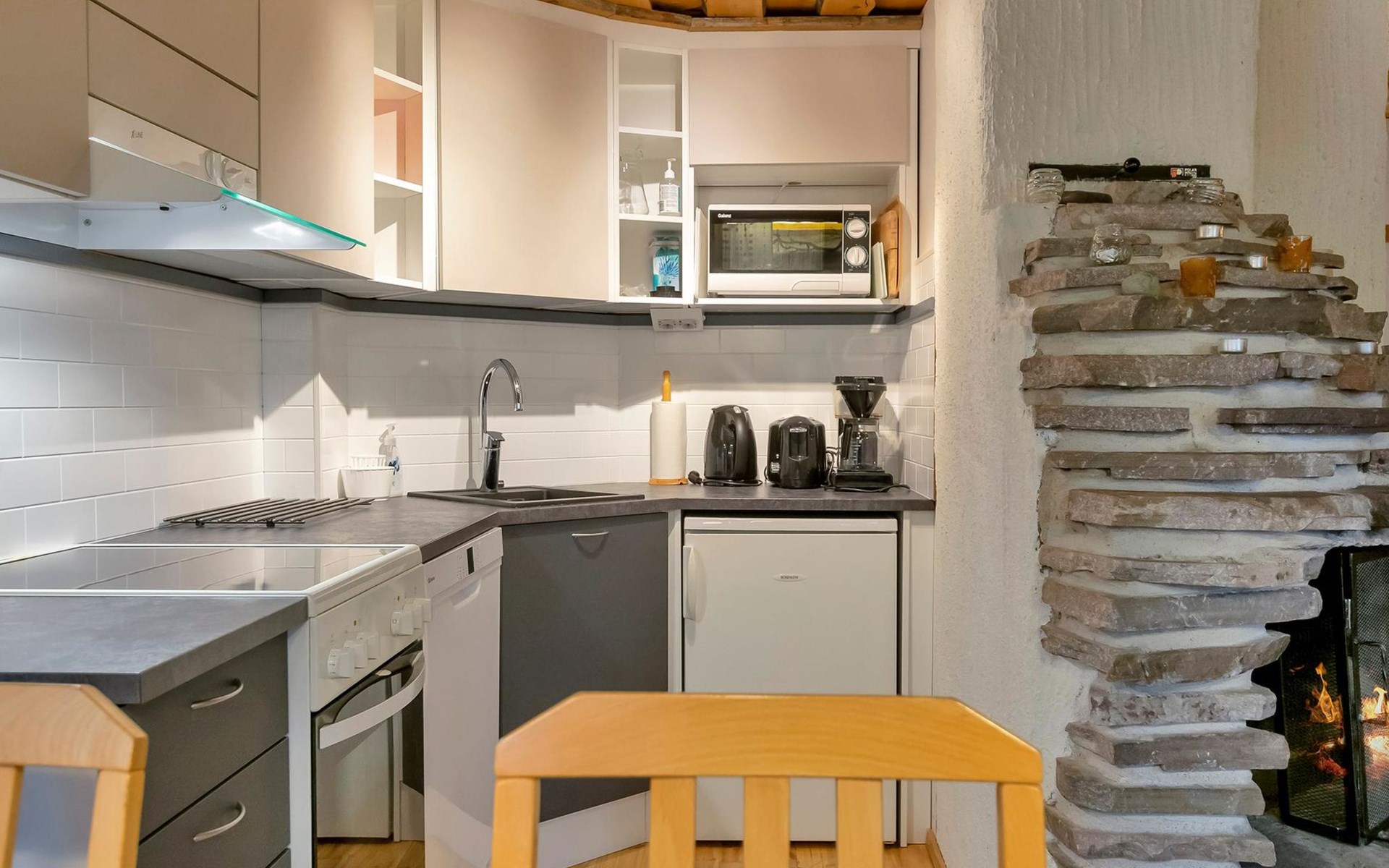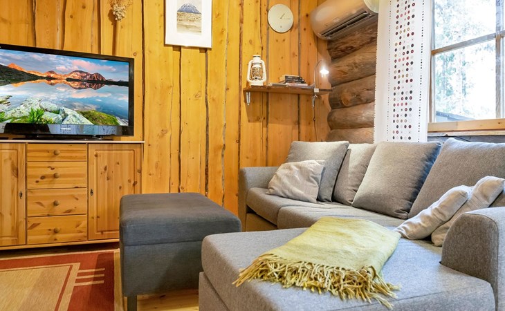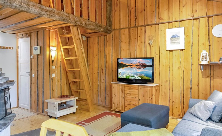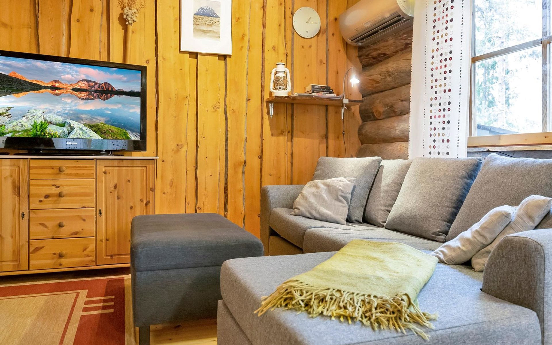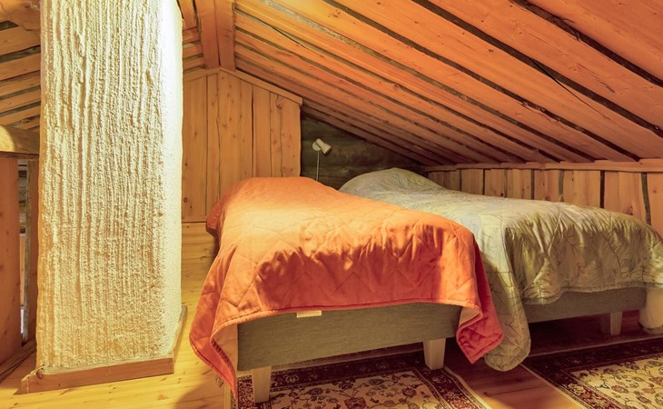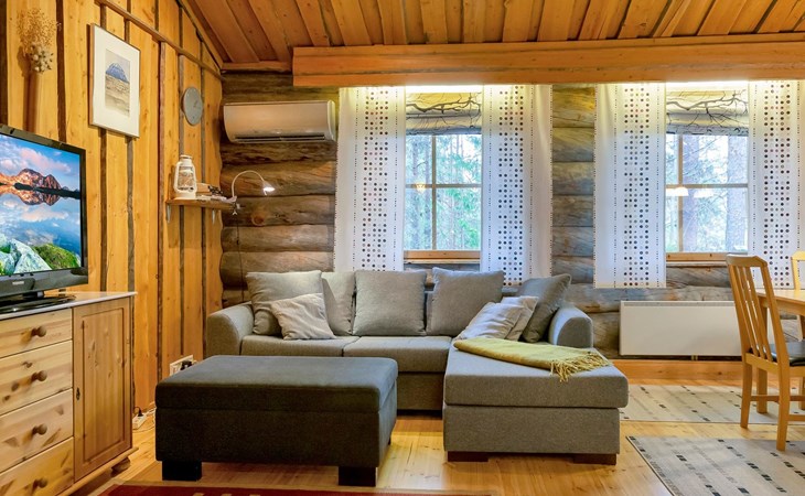 45 km north of Kemijärvi, located in Pyhätunturi Ski resort. Silverlog row house apartment built in 1990. Open concept living room kitchen, small bedroom with 2 beds ( 2x80 cm), sleeping loft (to which steep stairs) with 3 beds, renovated washroom and sauna (elec. stove).