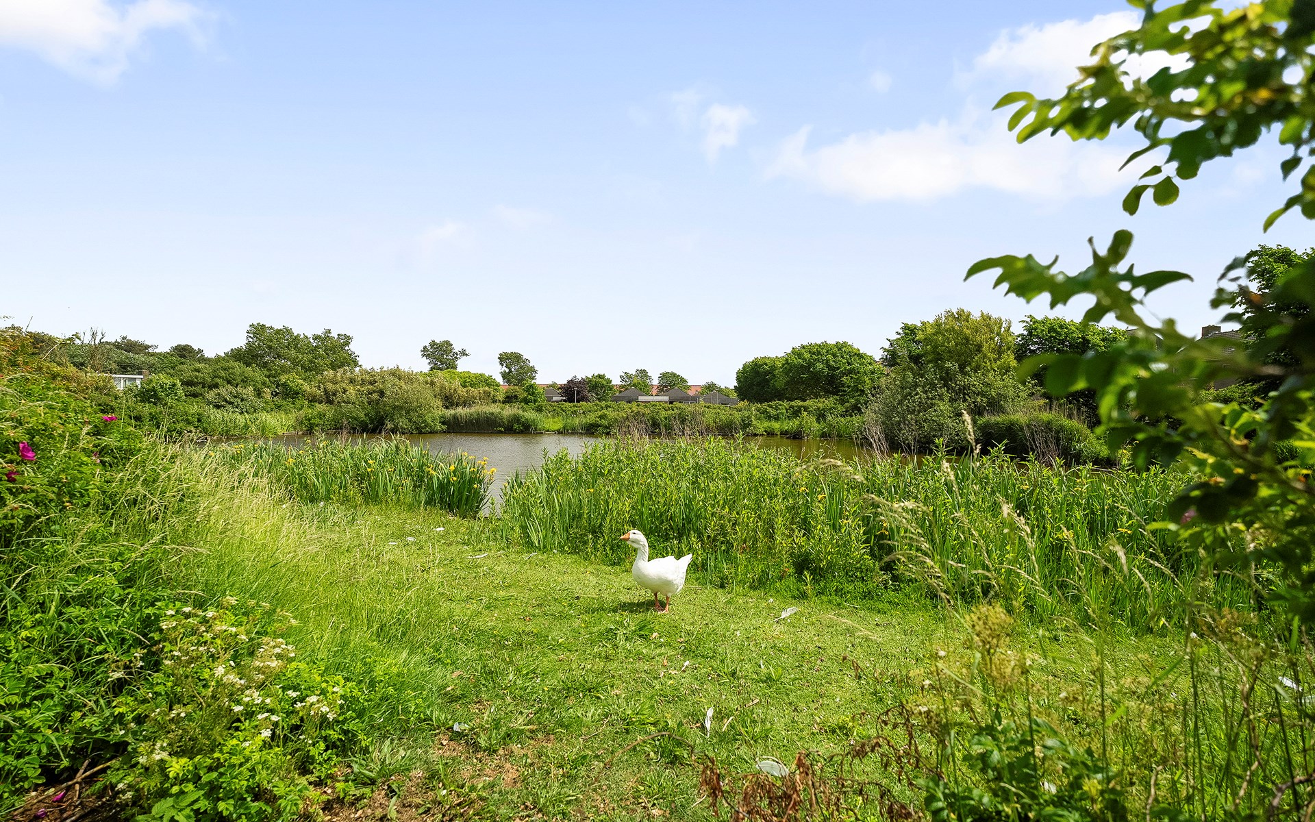 Das sonnige Terrassse bietet einen schönen Blick auf den Ententeich. Im Erdgeschoss finden Sie ein gemütliches Wohnzimmer mit Sofaecke, eine moderne Küche und ein frisch renoviertes Bad.