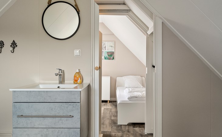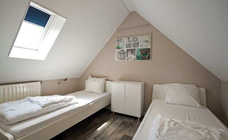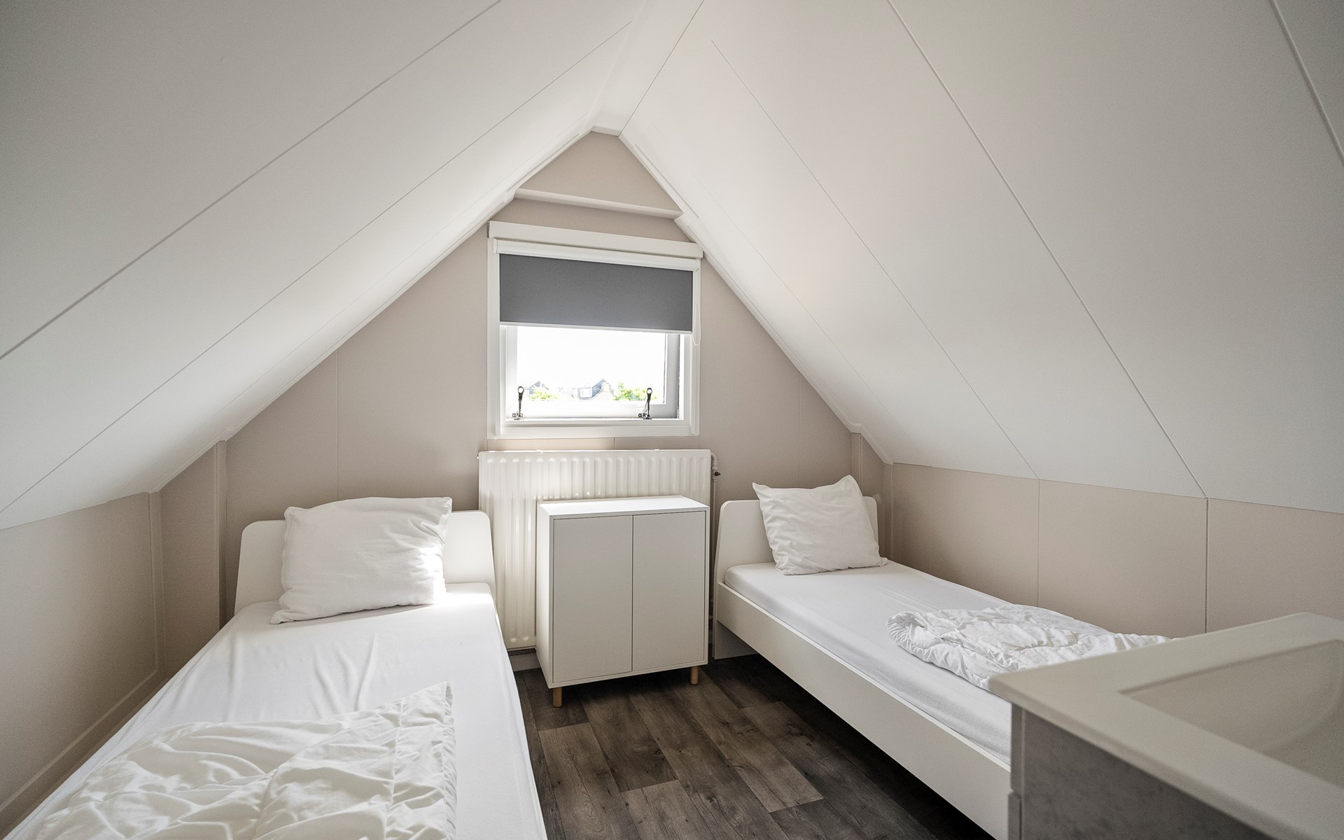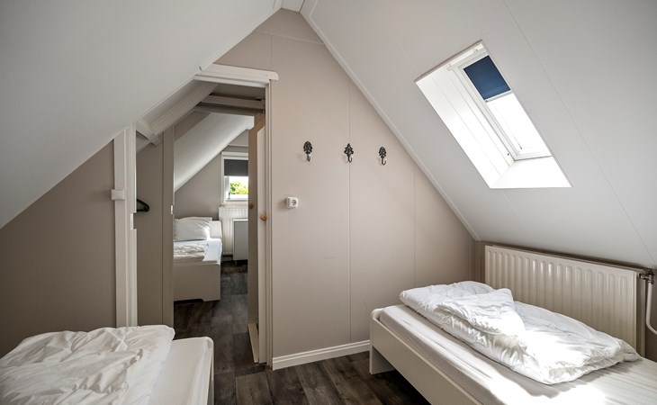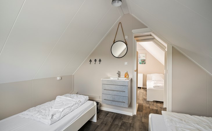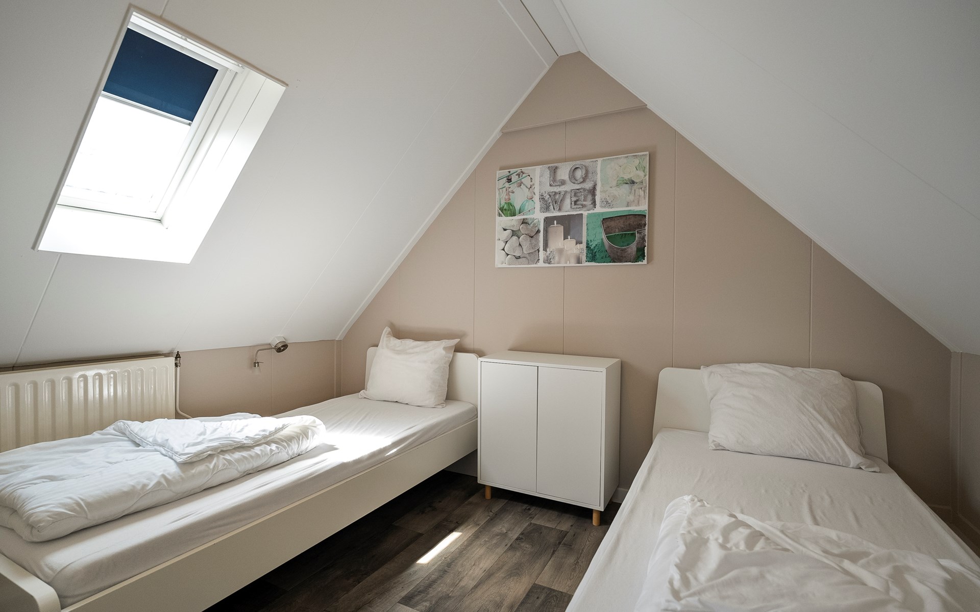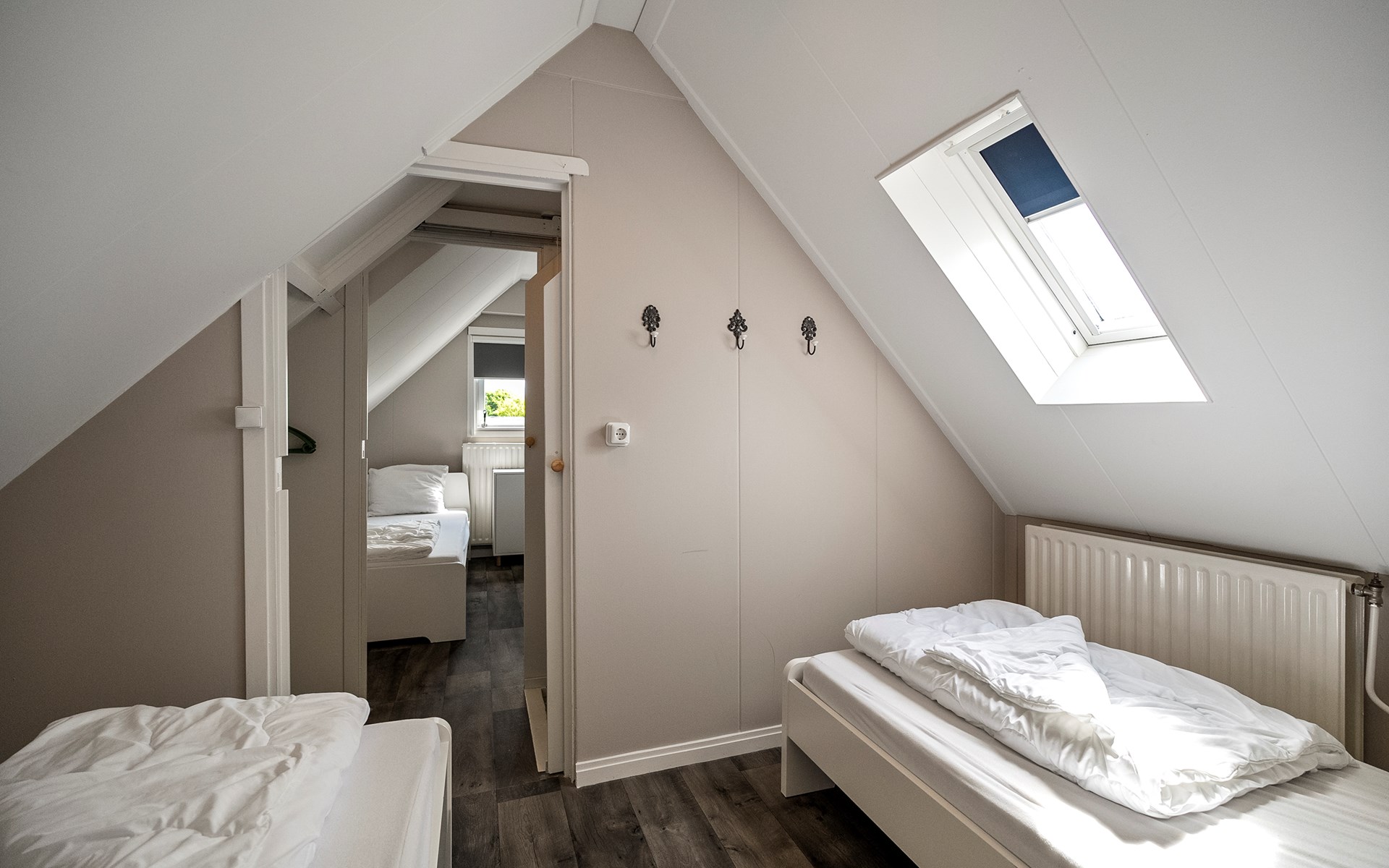Im Obergeschoss gibt es zwei Schlafzimmer mit jeweils Einzelbetten, die sich bei Bedarf zu Doppelbettenzusammenschieben lassen. Perfekt für erholsame Nächte nach einem Strandtag.