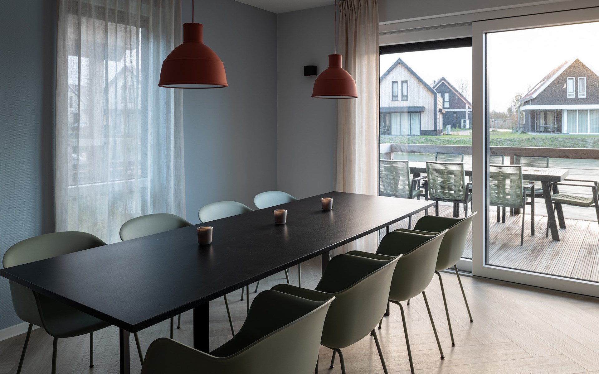Durch das Wohnzimmer gelangen Sie auf die großzügige Terrasse mit einem Lounge-Set und einer Essgarnitur. Diese Terrasse befindet sich über dem See und bietet Ihnen einen schönen Blick auf das Wasser.
