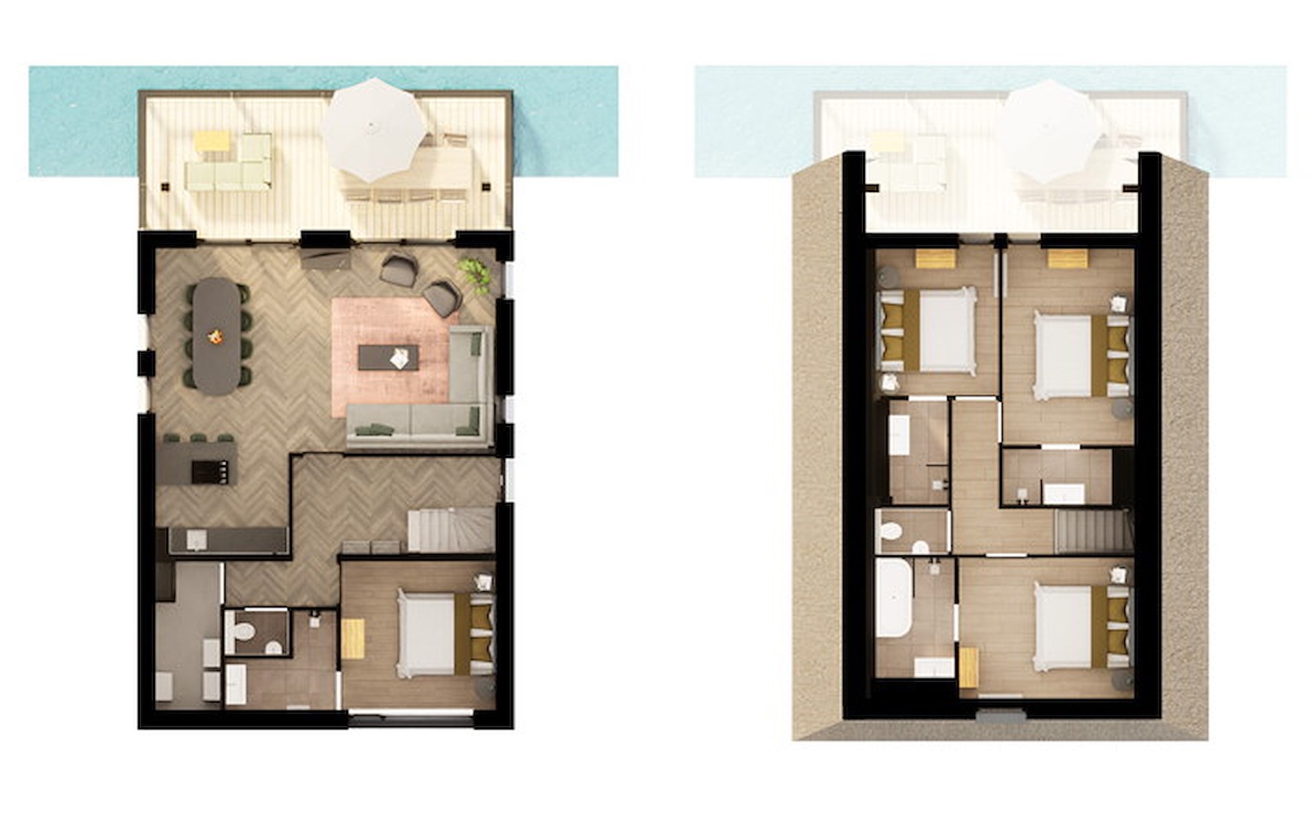 In der ersten Etage gibt es 3 Schlafzimmer mit je 2 Einzelbetten. Jedes Schlafzimmer hat En-Suite-Badezimmer mit Dusche und Waschbecken. Eines der Badezimmer verfügt auch über eine Badewanne. Außerdem gibt es eine separate Toilette in der ersten Etage und eines der Schlafzimmer ist mit einem Smart-TV mit Streaming-Funktion ausgestattet.