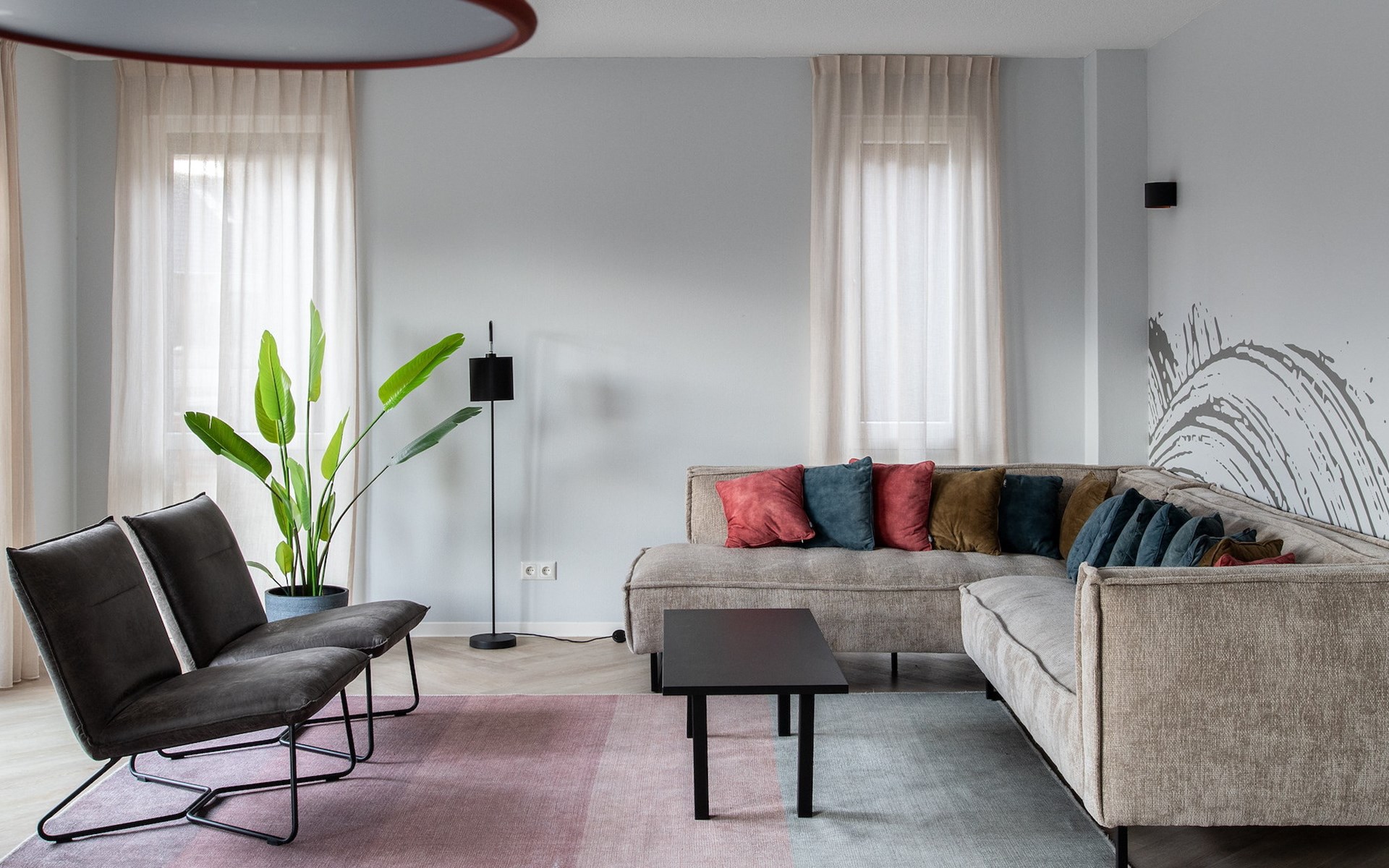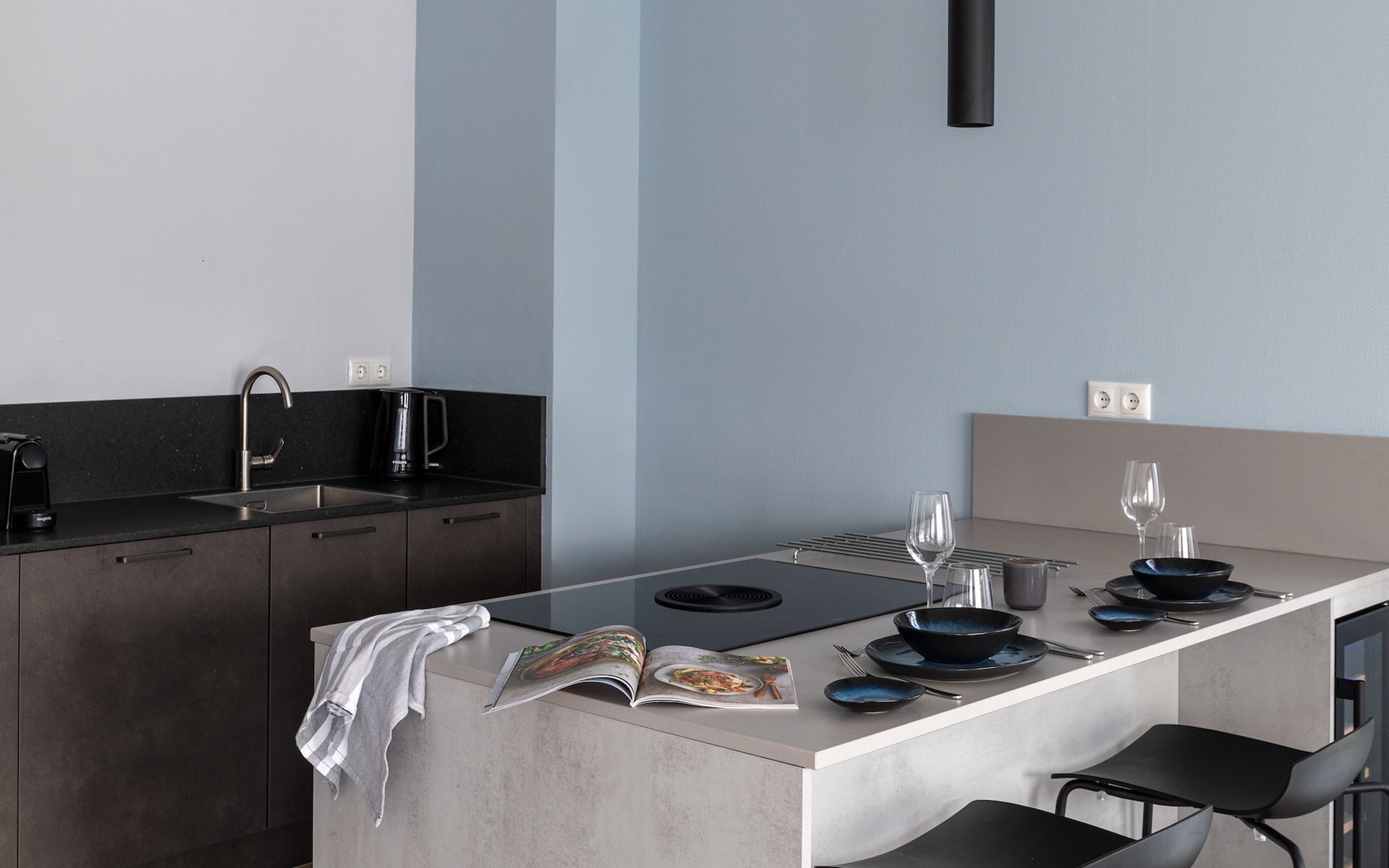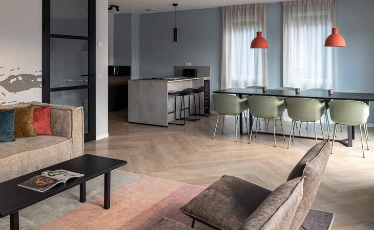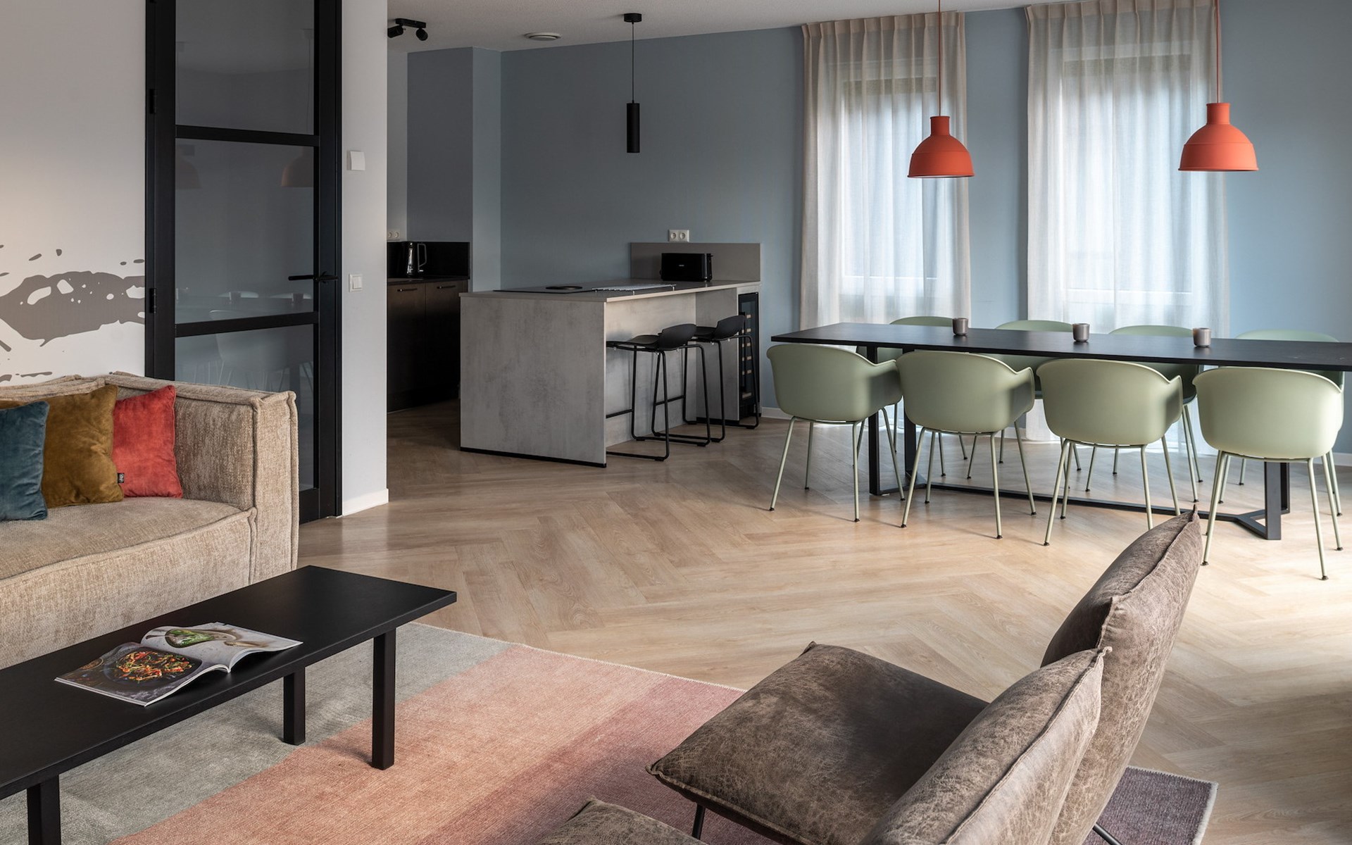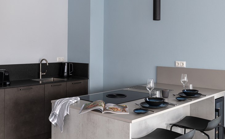 Das großzügige Wohnzimmer verfügt über einen Sitzbereich mit einem Smart-TV mit Streaming-Funktion. Es gibt auch einen Essbereich mit Esstisch. Die moderne, offene Küche verfügt über eine Kochinsel und Luxusgeräte, darunter ein Bora-Kochfeld, ein Kombiofen, ein Geschirrspüler, eine Nespresso-Maschine und ein Weinkühlschrank.