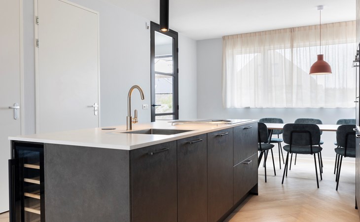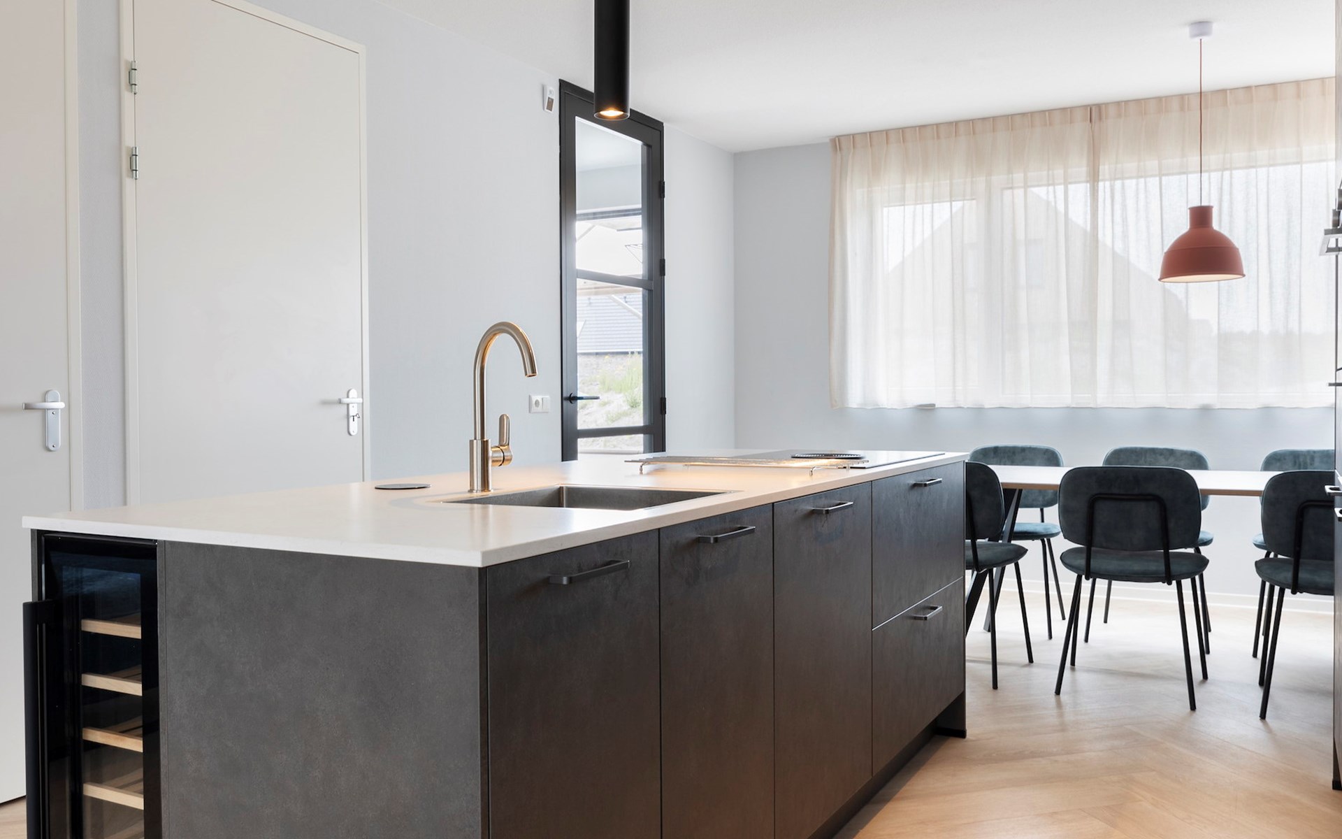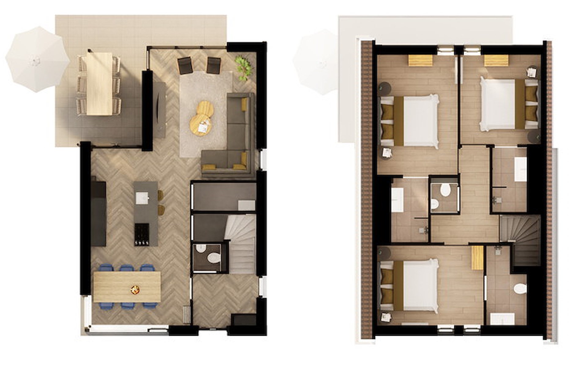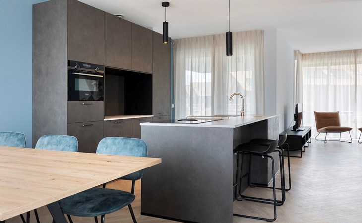Das moderne Wohnzimmer verfügt über einen großen Sitzbereich mit einem Smart-TV mit Streaming-Funktion. Die luxuriöse Küche mit Kochinsel ist komplett ausgestattet und umfasst ein Bora-Kochfeld, einen Kühlschrank mit Gefrierfach, einen Geschirrspüler, eine Nespresso-Maschine und einen Weinkühlschrank. Neben der offenen Küche befindet sich der Essbereich mit einem Esstisch. Außerdem gibt es eine separate Toilette im Erdgeschoss.