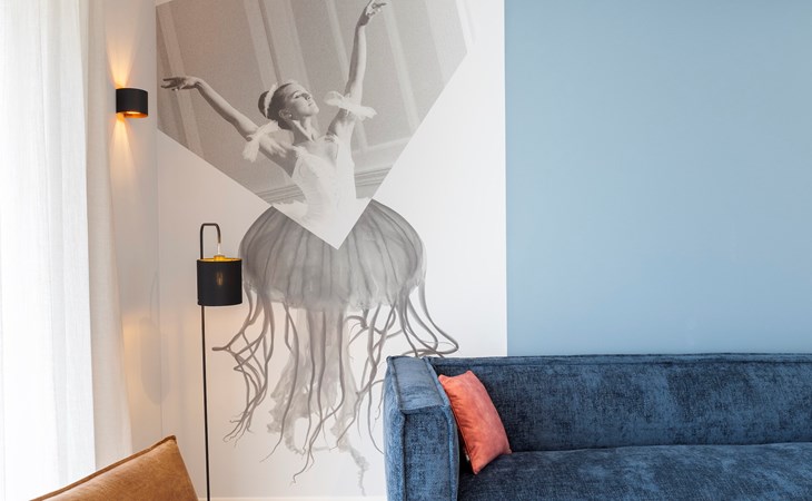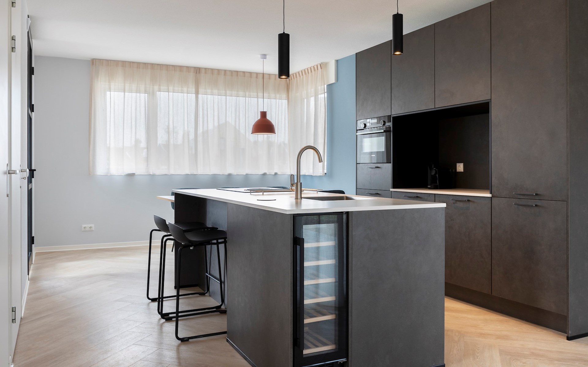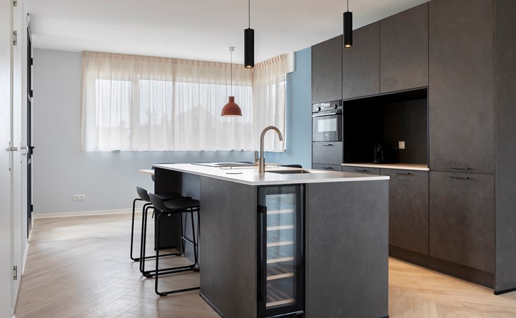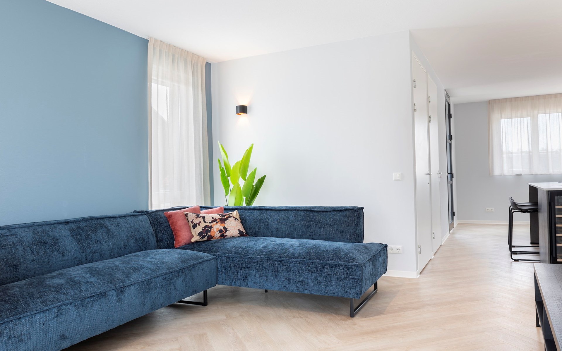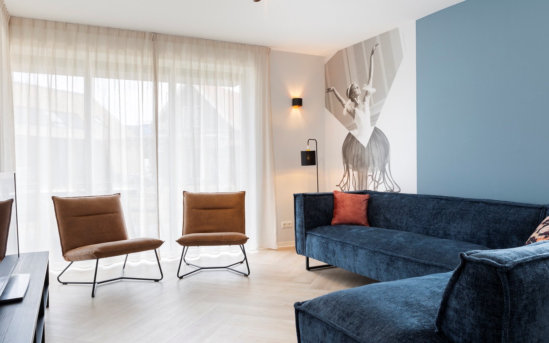 Das moderne Wohnzimmer verfügt über einen großen Sitzbereich mit einem Smart-TV mit Streaming-Funktion. Die luxuriöse Küche mit Kochinsel ist komplett ausgestattet und umfasst ein Bora-Kochfeld, einen Kühlschrank mit Gefrierfach, einen Geschirrspüler, eine Nespresso-Maschine und einen Weinkühlschrank. Neben der offenen Küche befindet sich der Essbereich mit einem Esstisch. Außerdem gibt es eine separate Toilette im Erdgeschoss.
