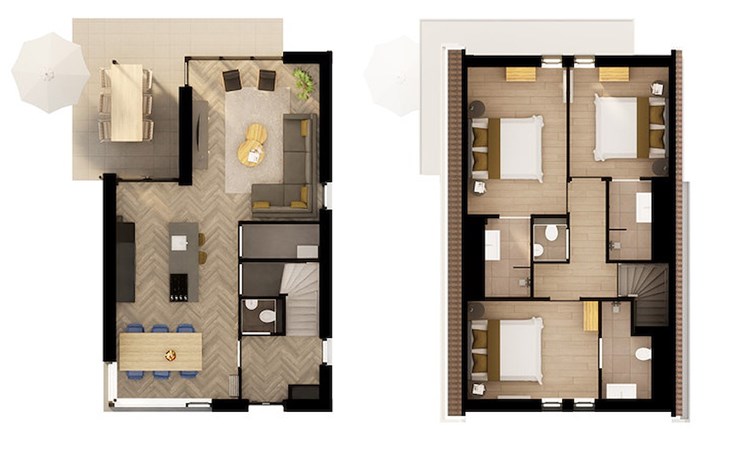 In der ersten Etage gibt es 3 Schlafzimmer mit je 2 Einzelbetten, von denen eines über einen Smart-TV mit Streaming-Funktion verfügt. Alle 3 Schlafzimmer haben ein En-Suite-Badezimmer mit Dusche und Waschbecken, eines davon auch mit Toilette. Außerdem gibt es eine separate Toilette in der ersten Etage.