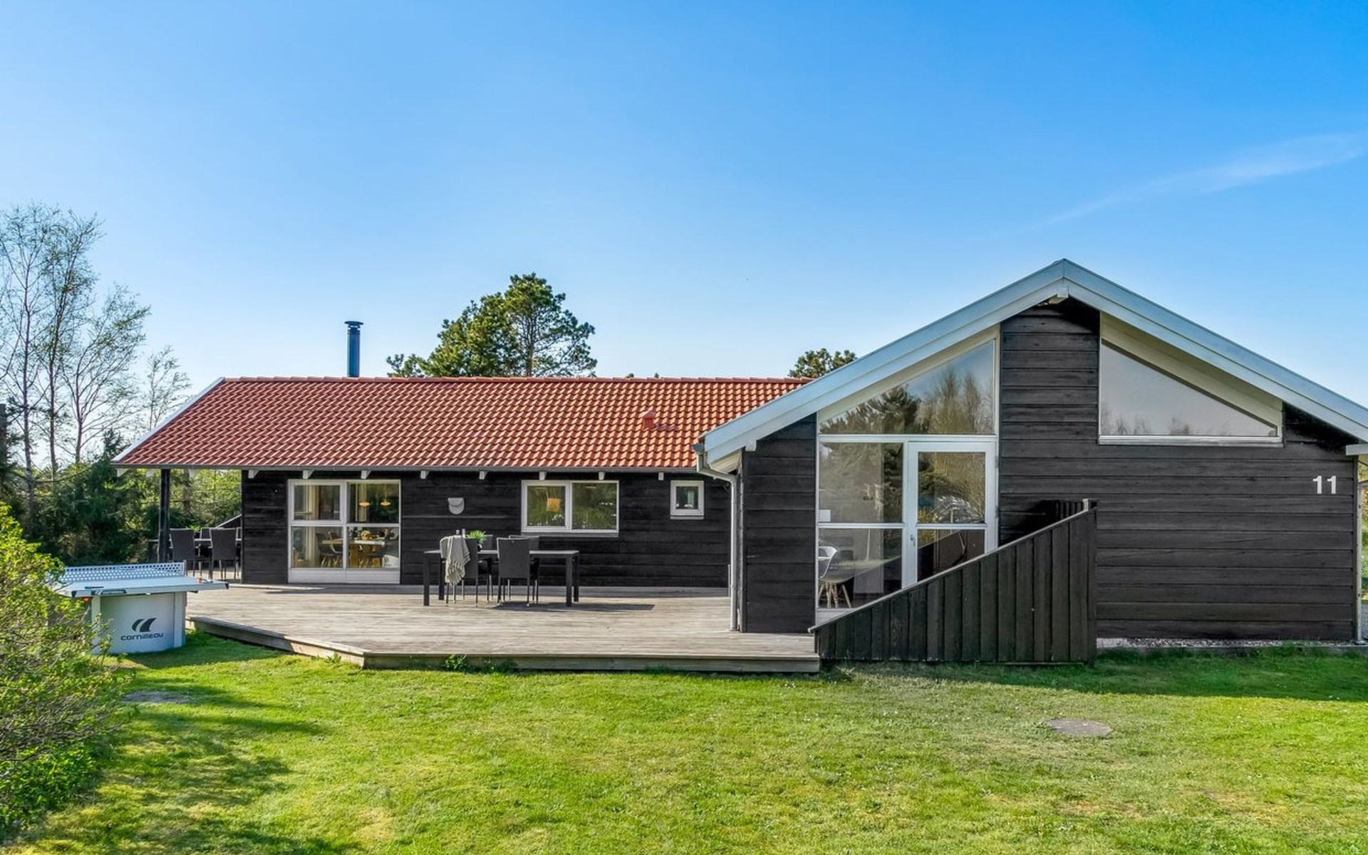 Einfamilienhaus, Baujahr 2003. 700 m vom Meer. Zur Alleinbenutzung: Grundstück 1'366 m2, gepflegter Garten, Hallenbad (3 x 5 m, 15 m2, 130 - 130 cm tief). Grill, Kinderspielplatz (Schaukel). Im Hause: Sauna, Trampolin, Waschmaschine, Wäschetrockner. Parkplatz beim Haus. E-Ladestation. Lebensmittelgeschäft 1.5 km. Golfplatz 1.2 km. Der Besitzer akzeptiert keine Jugendgruppen.