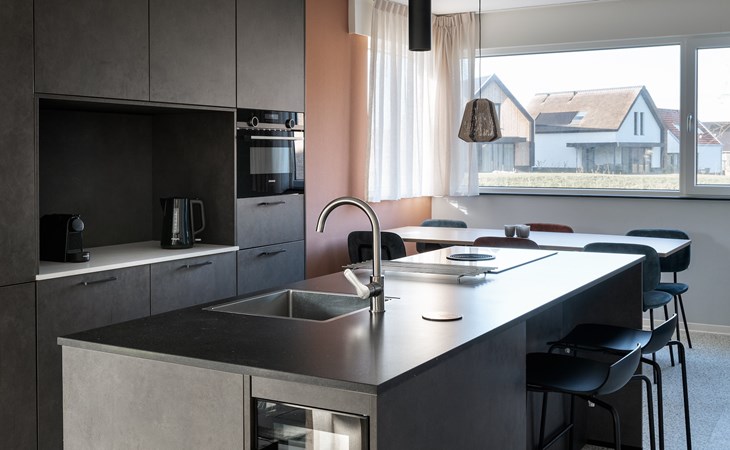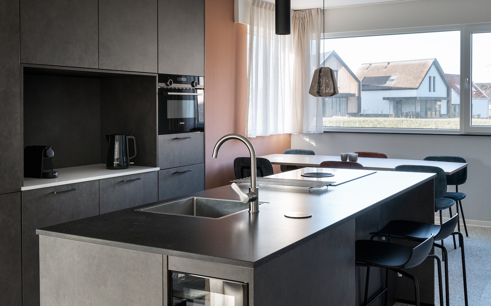 Das große Wohnzimmer ist modern eingerichtet und verfügt über einen Smart-TV mit Streaming-Funktion. Die offene Küche hat einen gemütlichen Essbereich und ist mit einer Kochinsel und Luxusgeräten ausgestattet. Dazu gehören ein Bora-Kochfeld, ein Kombiofen, ein Geschirrspüler, eine Nespresso-Maschine und ein Weinkühlschrank. Es gibt auch eine separate Toilette im Erdgeschoss.