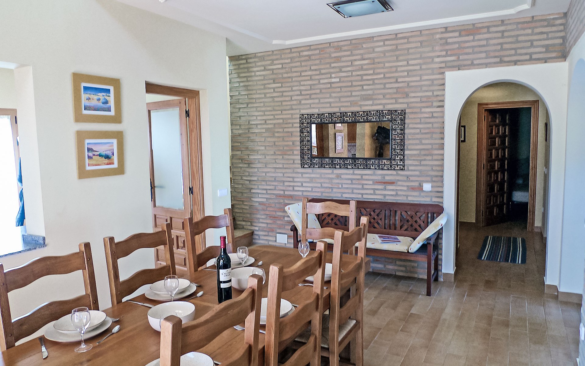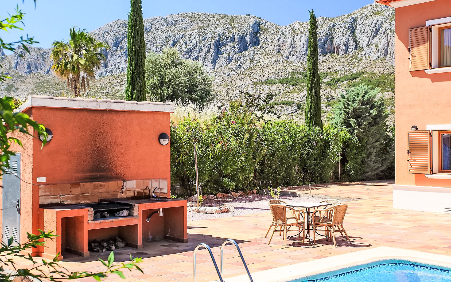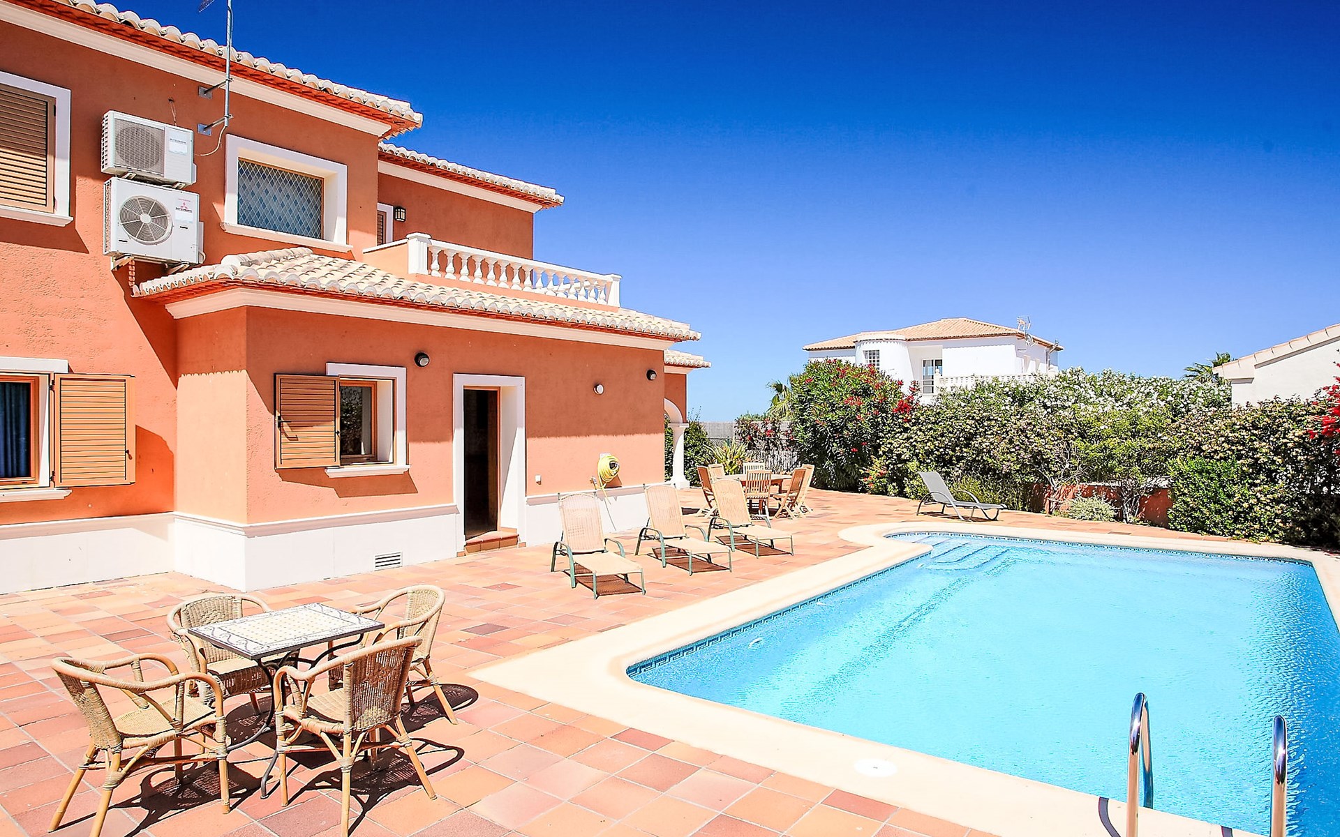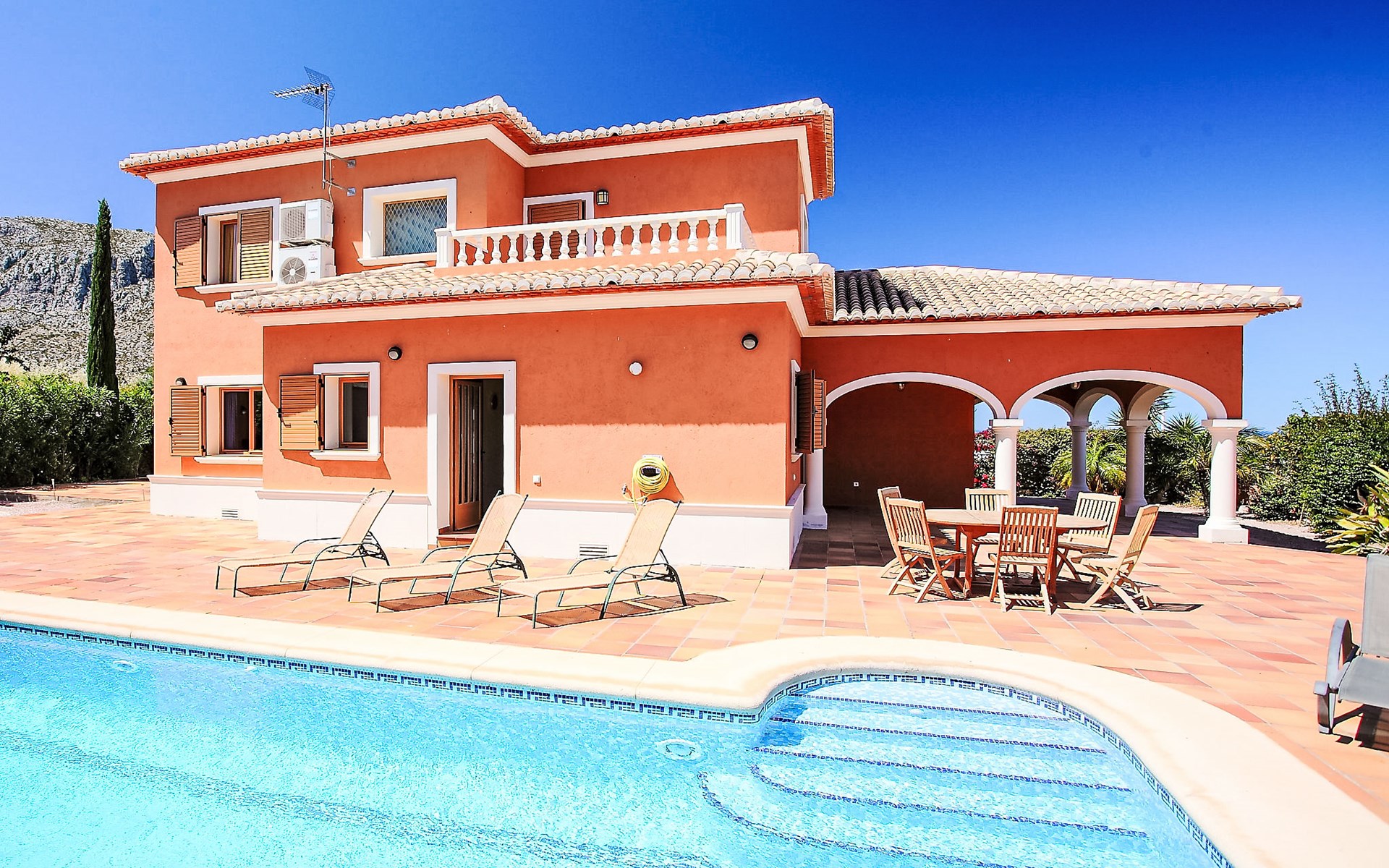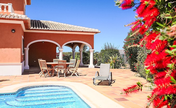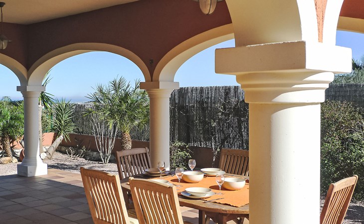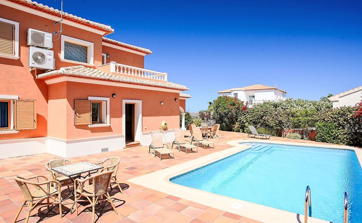 Grosse, komfortable Villa "Corona", auf 2 Stockwerken, Baujahr 2004. Im Ortsteil Monte Corona, Beniarbeig, 15 km vom Zentrum von Dénia, auf einem Hügel, 7 km vom Meer. Zur Alleinbenutzung: Grundstück 900 m2 (eingezäunt), Pflanzen, Schwimmbad eckig (10 x 4 m, 90 - 200 cm tief, saisonale Verfügbarkeit: 01.Jan. - 31.Dez.) mit Innentreppe. Aussendusche, Terrasse, Grill, Parkplatz beim Haus. Einkaufsgeschäft 1 km, Restaurant 1 km, Bar 1 km, Café 1 km, Bushaltestelle 1.2 km, Bahnstation 1.4 km, Fähre 1.5 km, Sandstrand 7 km. Der Besitzer akzeptiert keine Jugendgruppen.
