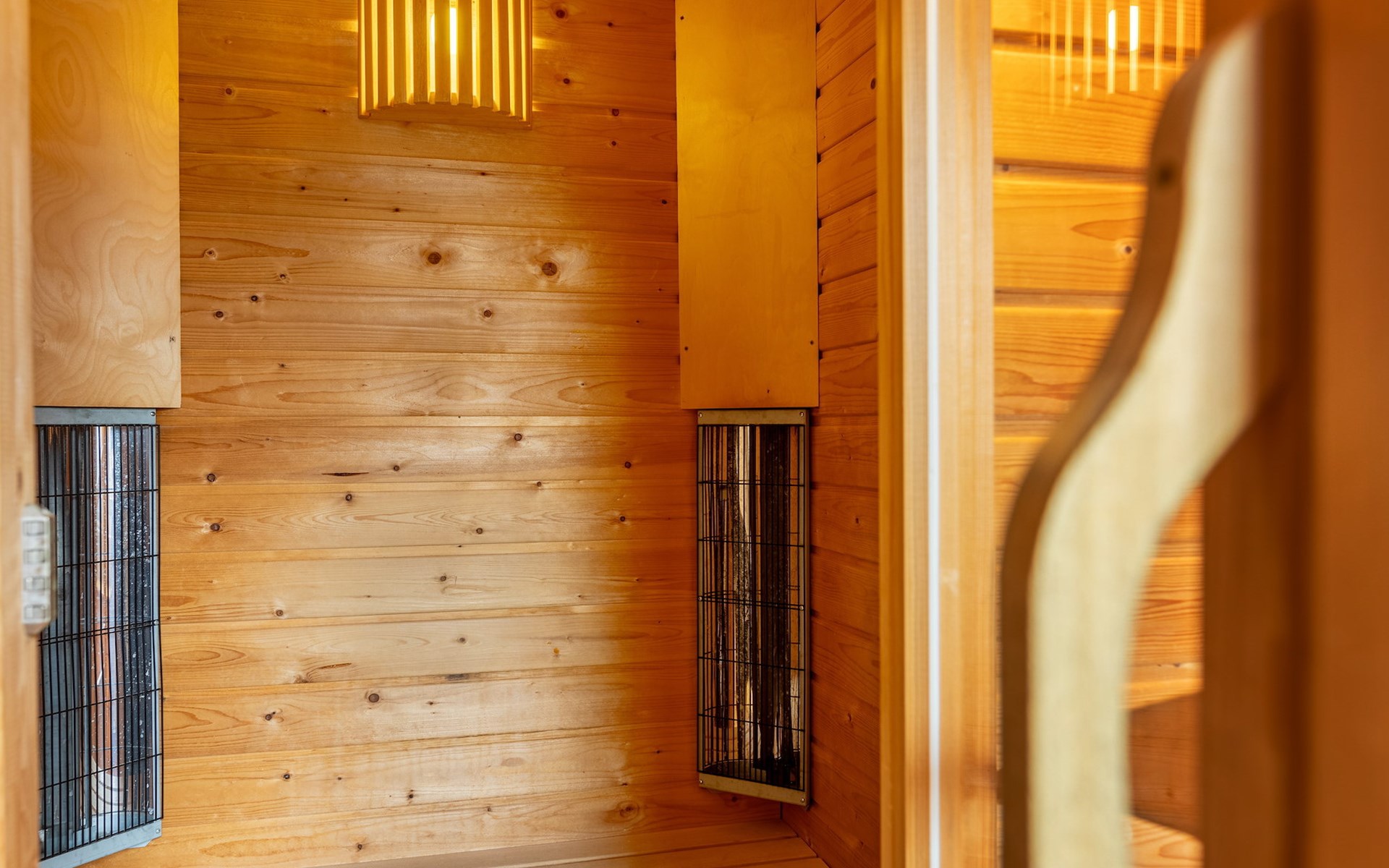 Im ersten Stock gibt es 2 Schlafzimmer und 1 Badezimmer. Beide Schlafzimmer haben 2 Einzel-Boxspringbetten. Das Badezimmer hat eine Badewanne, eine Sonnendusche und ein Waschbecken. Außerdem gibt es eine traditionelle finnische Sauna für vier Personen oder eine Infrarotsauna für zwei Personen. Es gibt auch eine separate Toilette im ersten Stock.