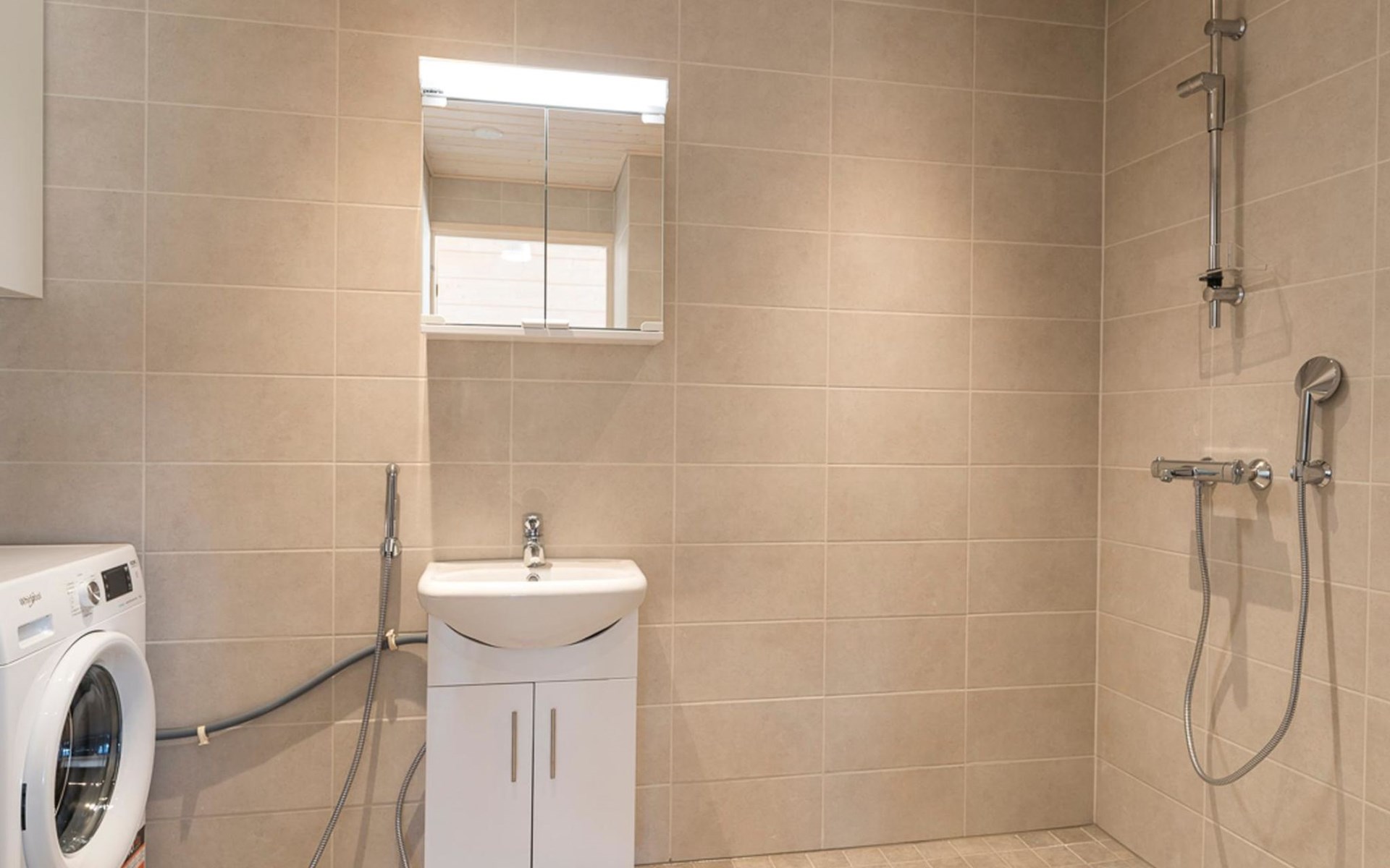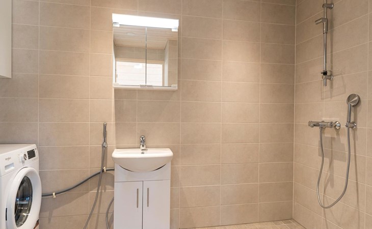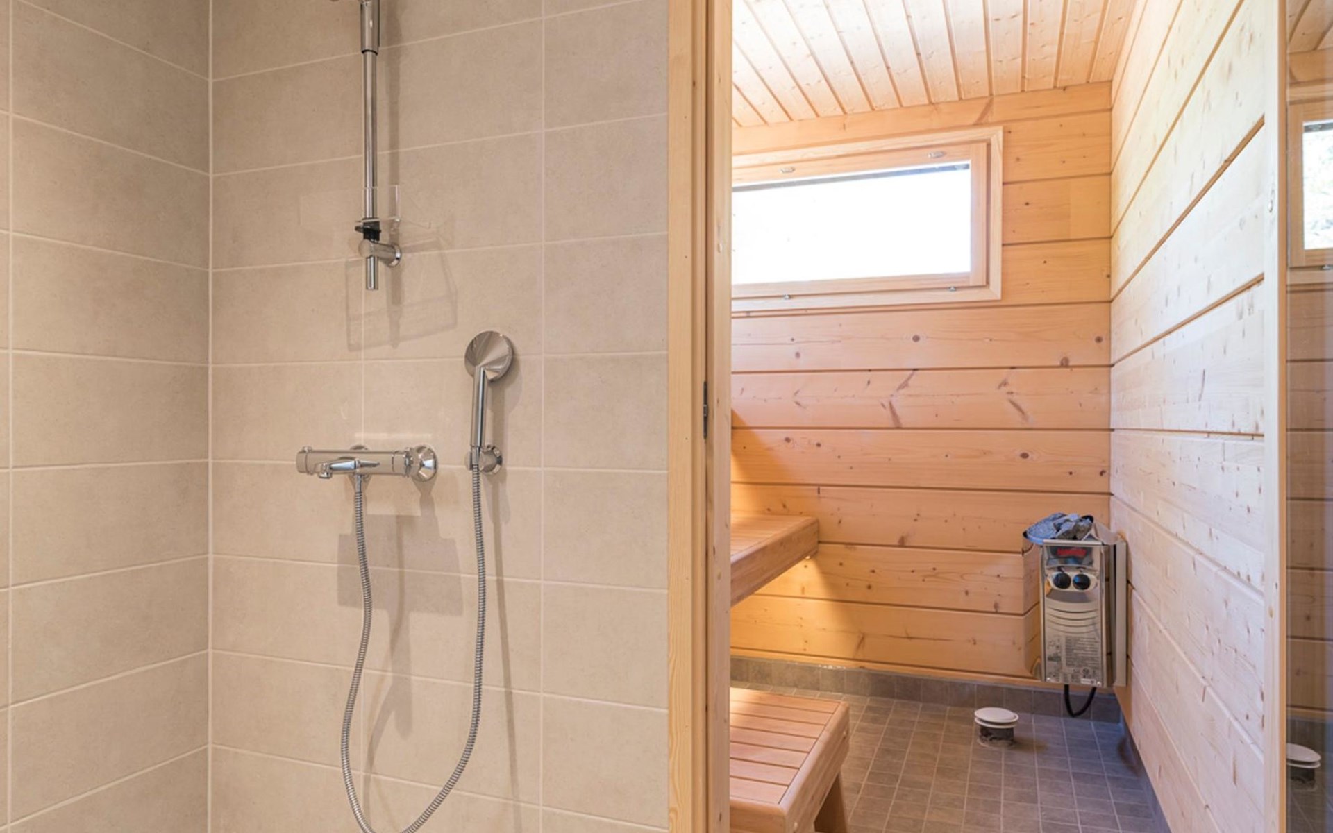 Sauna ja pesuhuone/wc. Rannan puolella on katettu terassi.