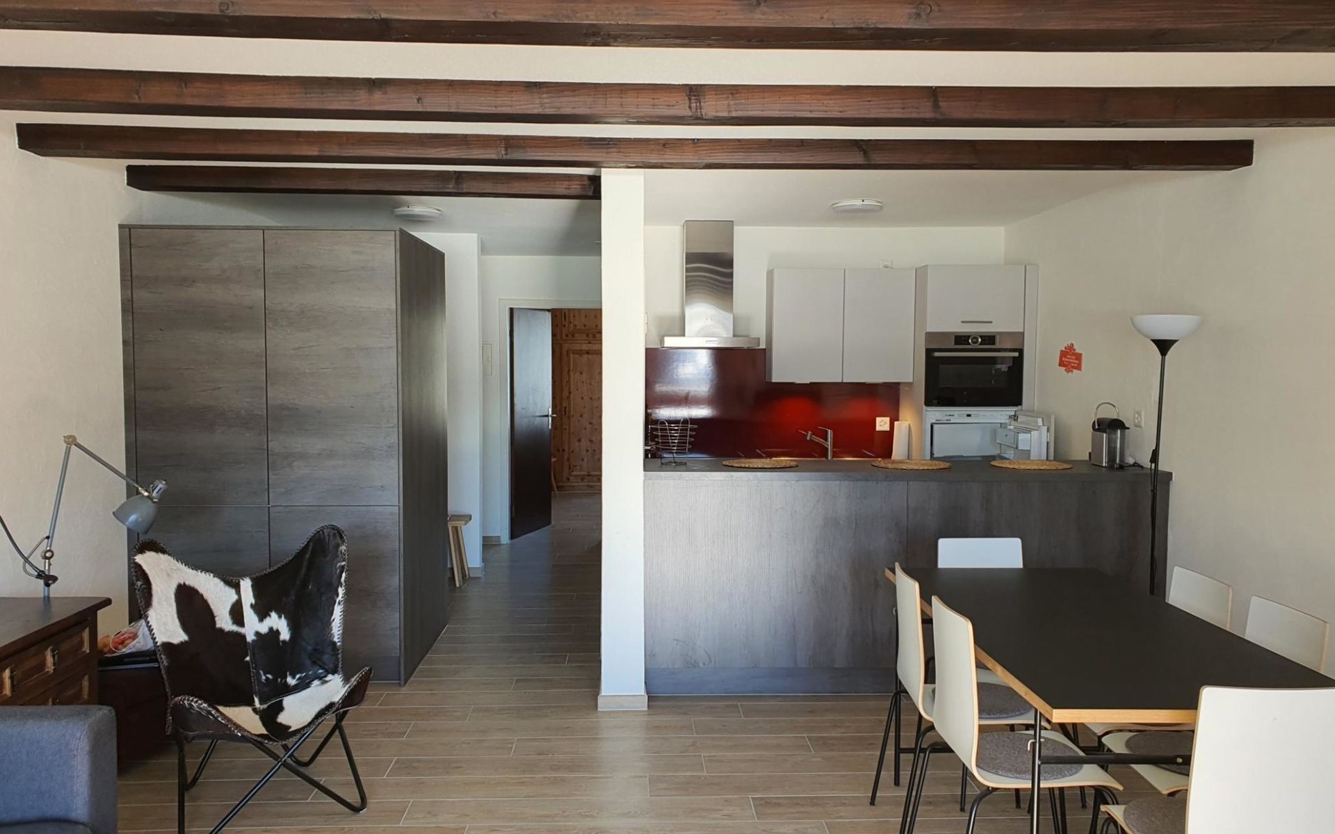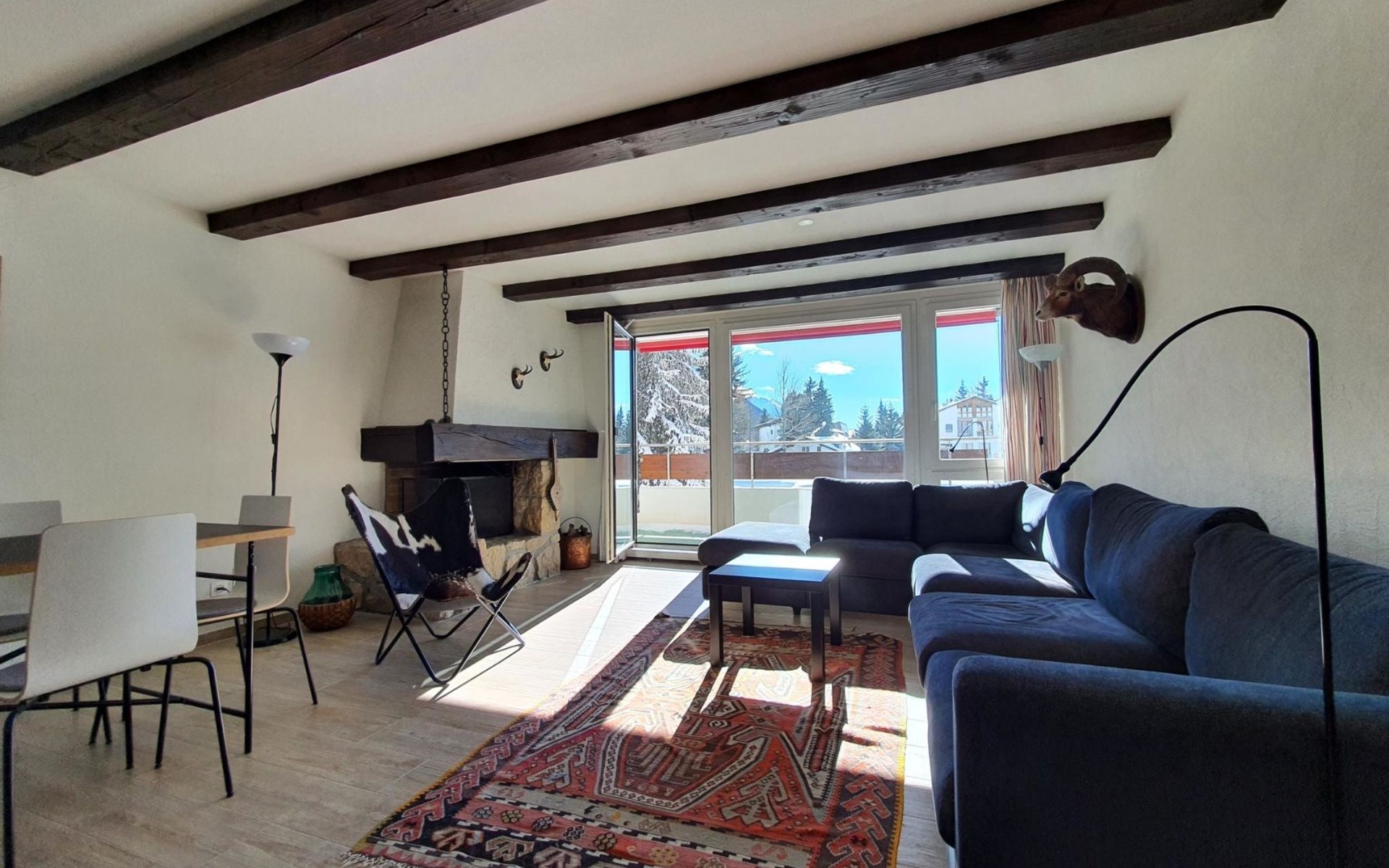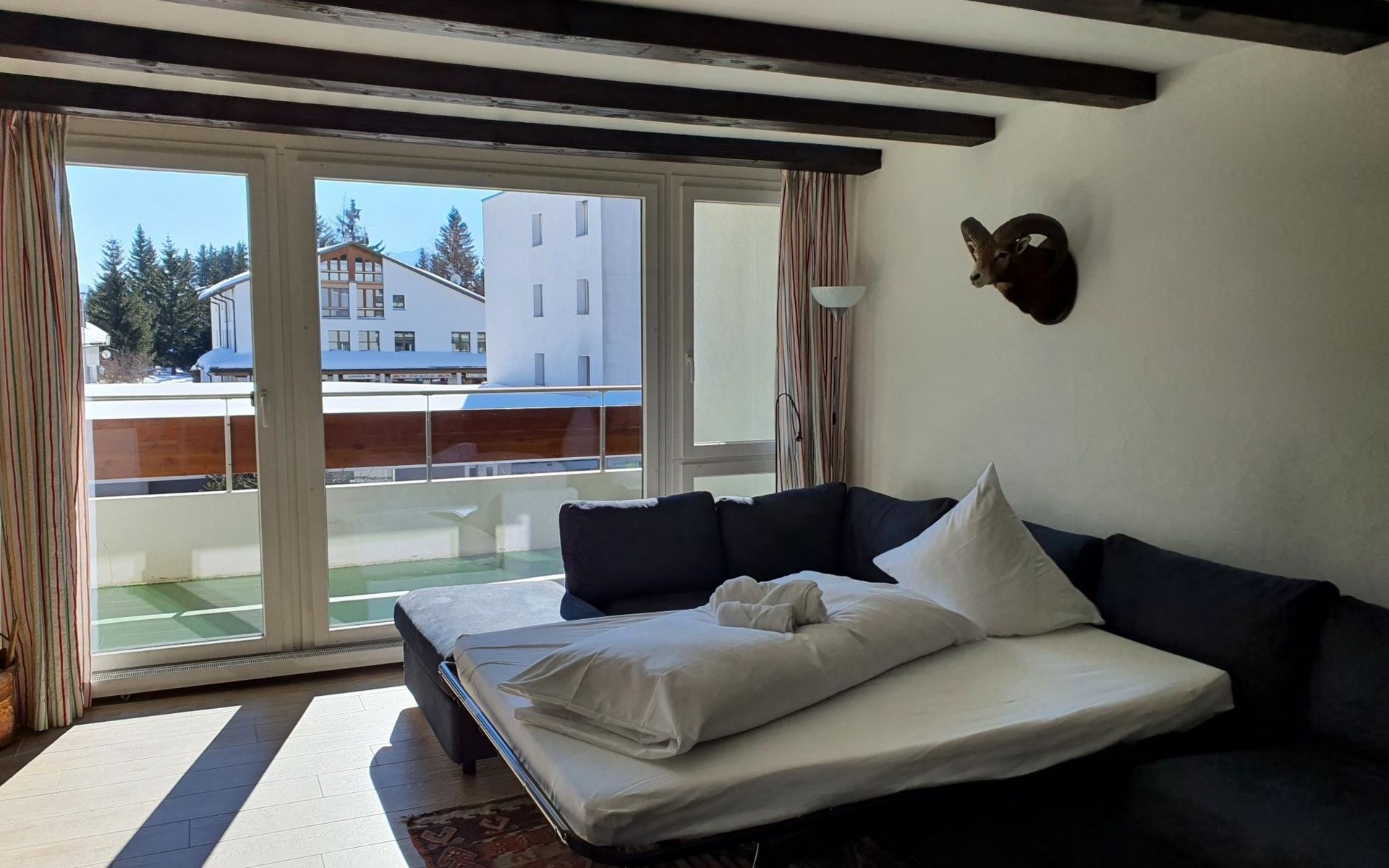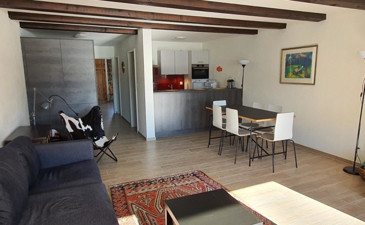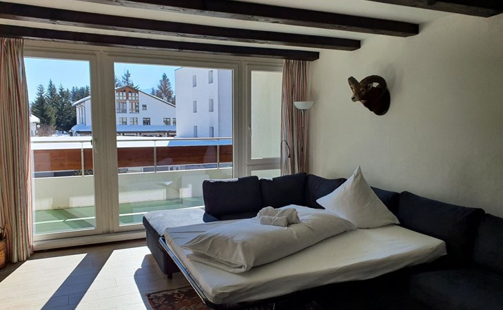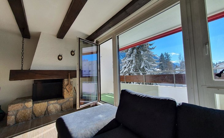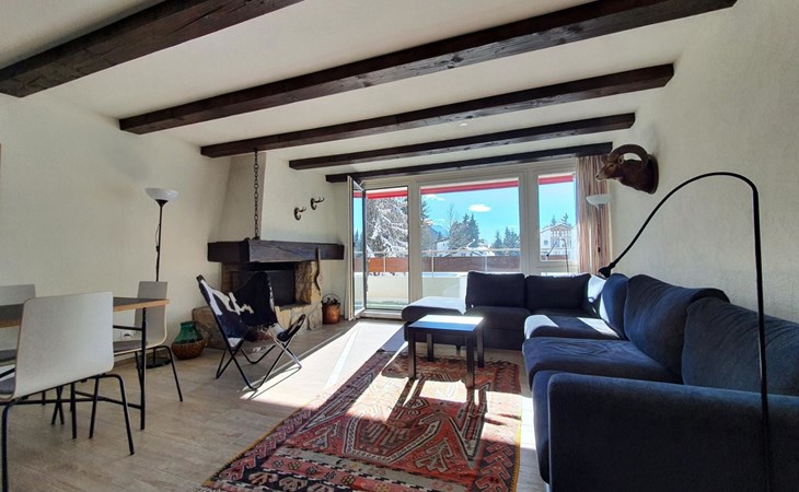 Im modernisierten Apartment werden Sie sich wohl fühlen: Die Südausrichtung und die bodentiefen Fenster gestalten das grosszügige Wohnzimmer hell und freundlich. Zum Verweilen lädt die gemütliche Sofaecke (einfach in ein Doppelbett mit Liegefläche 140x200 cm zu verwandeln) vor dem Cheminée ein. Die moderne Küche ist mit allem Komfort ausgestattet. Neben den beiden Arvenholzbetten hat es im separaten Schlafzimmer ausreichend Platz z.B. für ein Kinderbett.