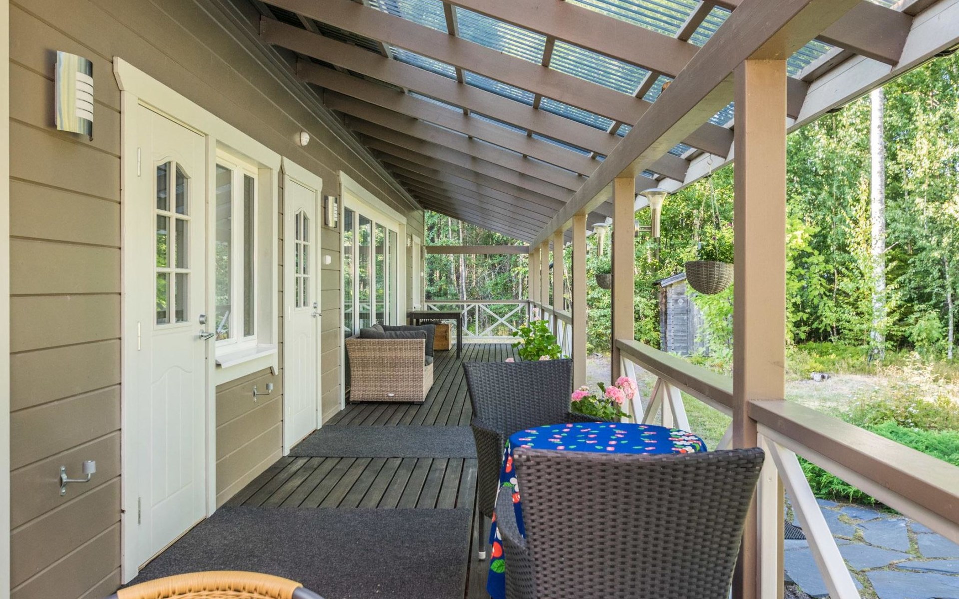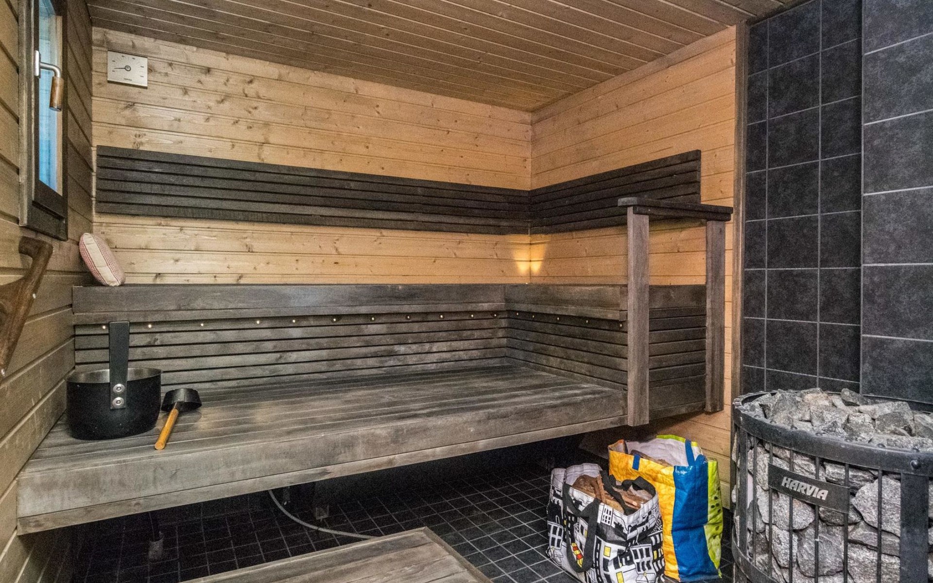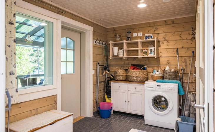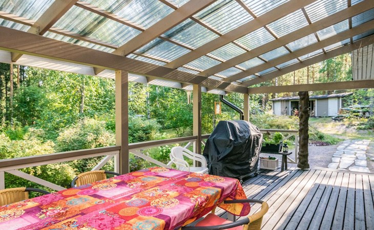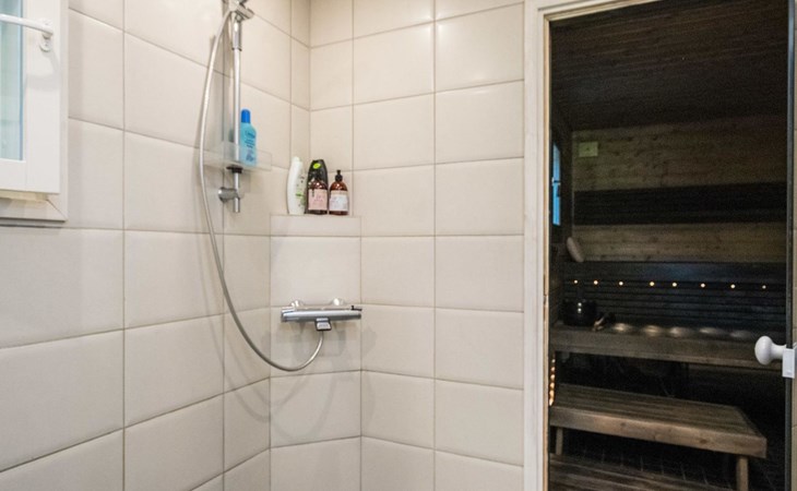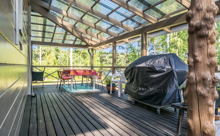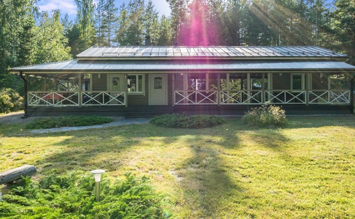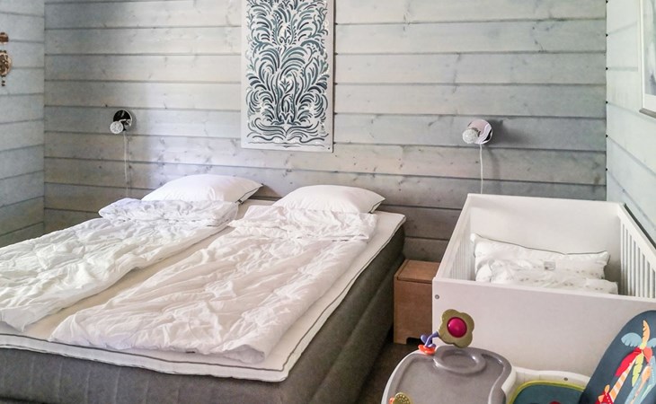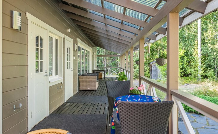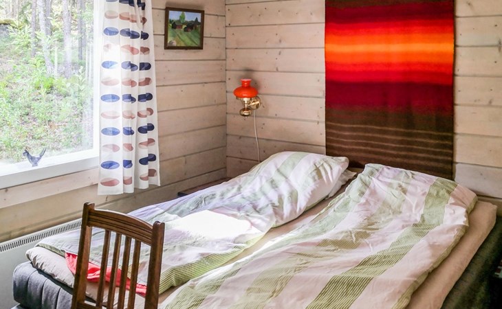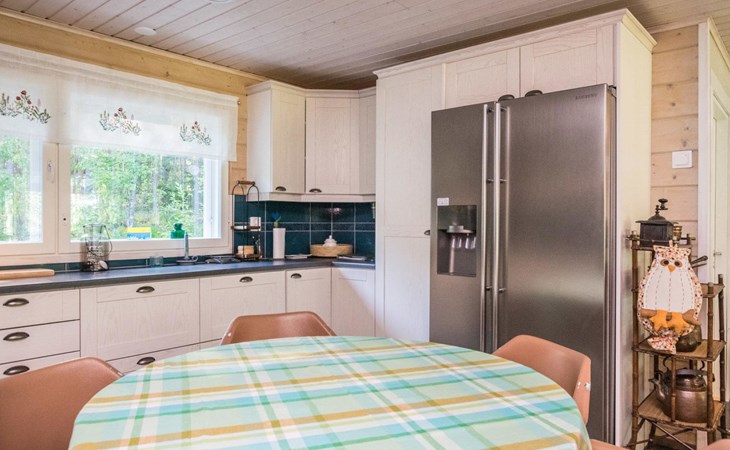 Wood-built villa, completely renovated in 2014, living room/kitchen with spreadable bed for two, double bed and cot in the bedroom (12 m²), double bed in the another bedroom (9 m²), separate WC, dressing room, washroom and wood-burning sauna stove in the sauna.