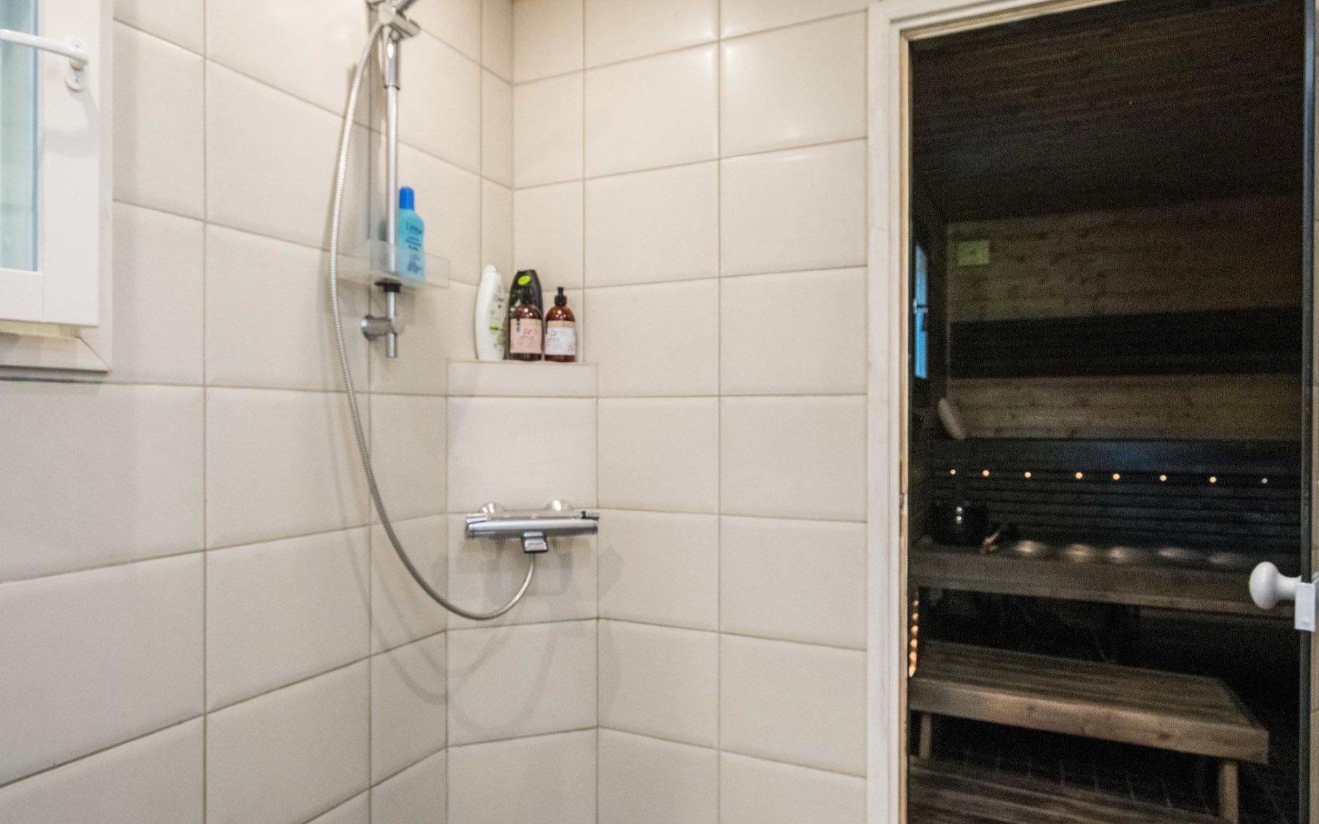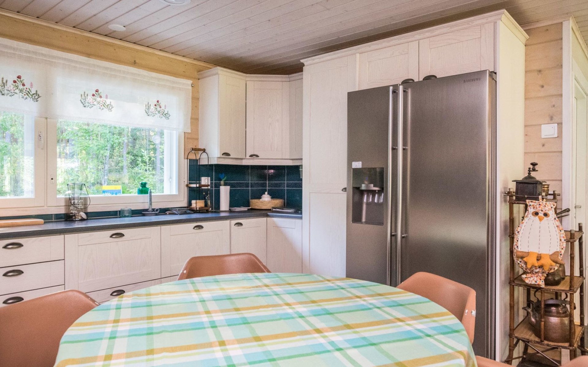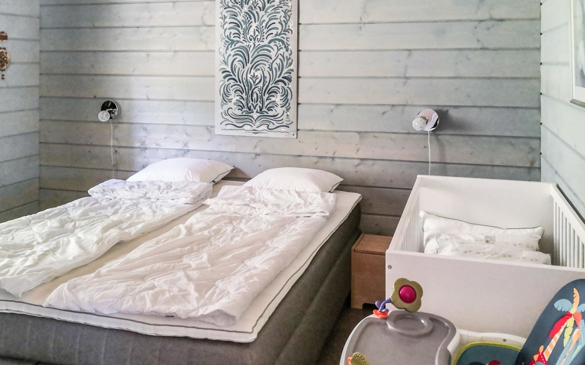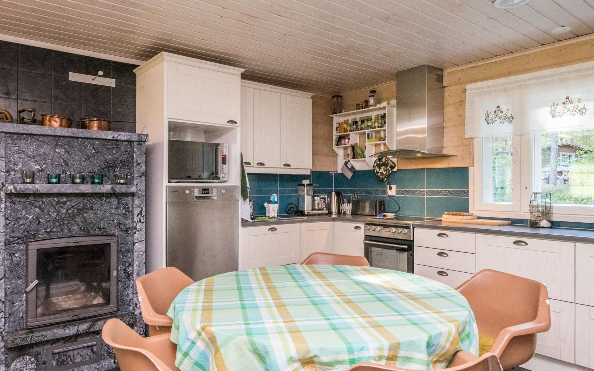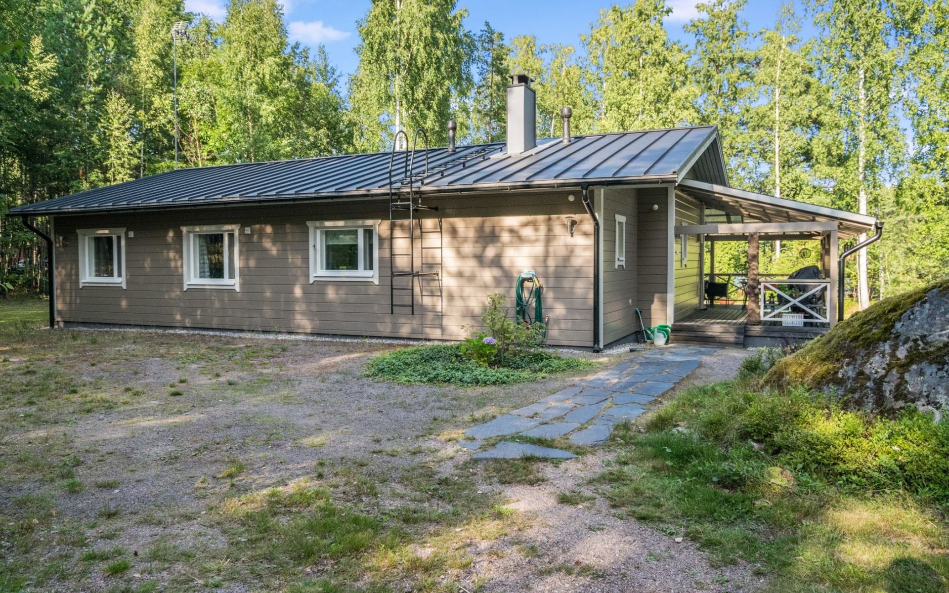 Wood-built villa, completely renovated in 2014, living room/kitchen with spreadable bed for two, double bed and cot in the bedroom (12 m²), double bed in the another bedroom (9 m²), separate WC, dressing room, washroom and wood-burning sauna stove in the sauna.