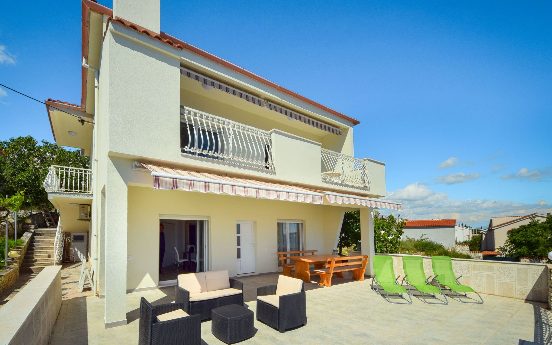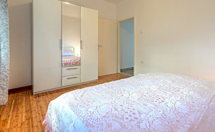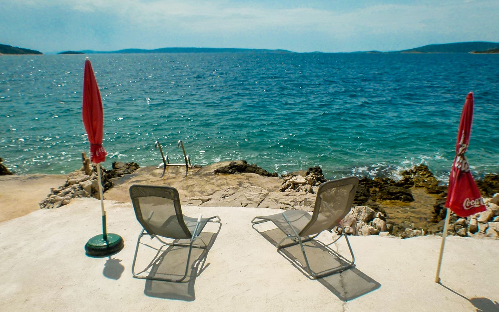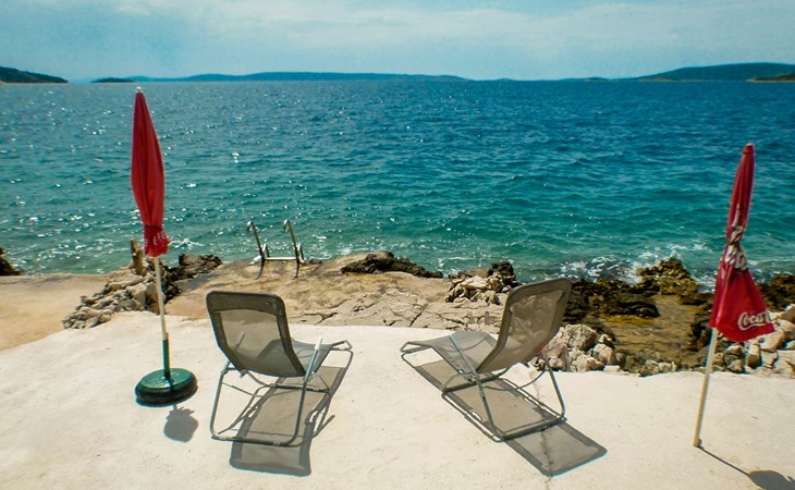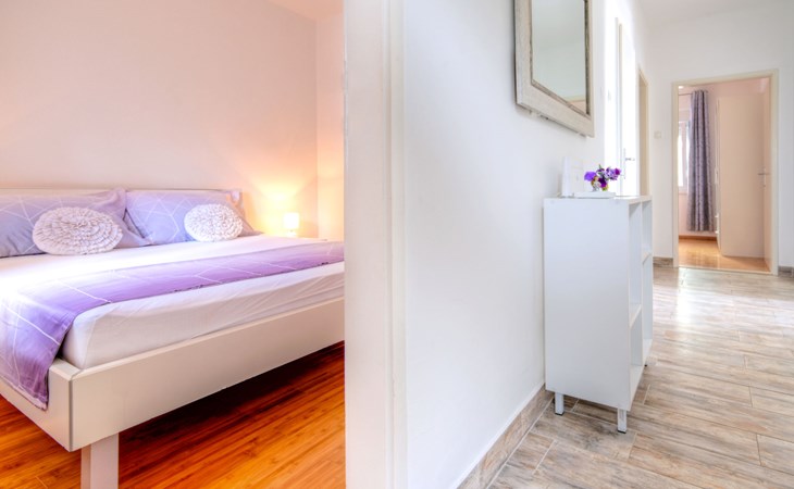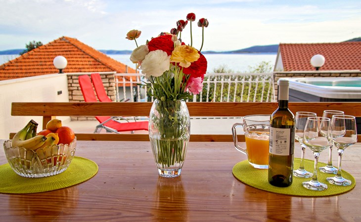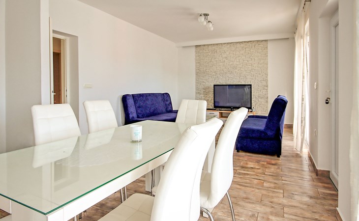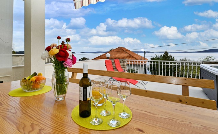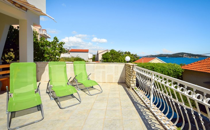 Seget Vranjica, 5 km von Trogir: Dreifamilienhaus "Tešija". Ruhige, sonnige Lage, 30 m vom Meer, 30 m vom Strand, in einer Sackgasse, Richtung Süden. Zur Alleinbenutzung: Aussendusche, Grill, Parkplatz beim Haus auf dem Grundstück, Einzelgarage. Einkaufsgeschäft, Restaurant 300 m, Bushaltestelle 1.5 km, Felsstrand, betonierter Strand 30 m. Bitte beachten: Flugplatz 12 km vom Haus.