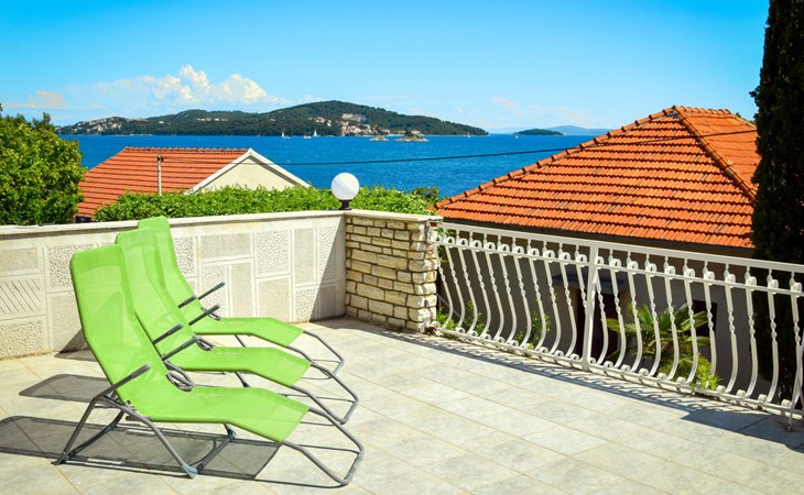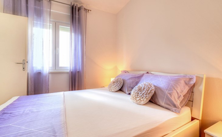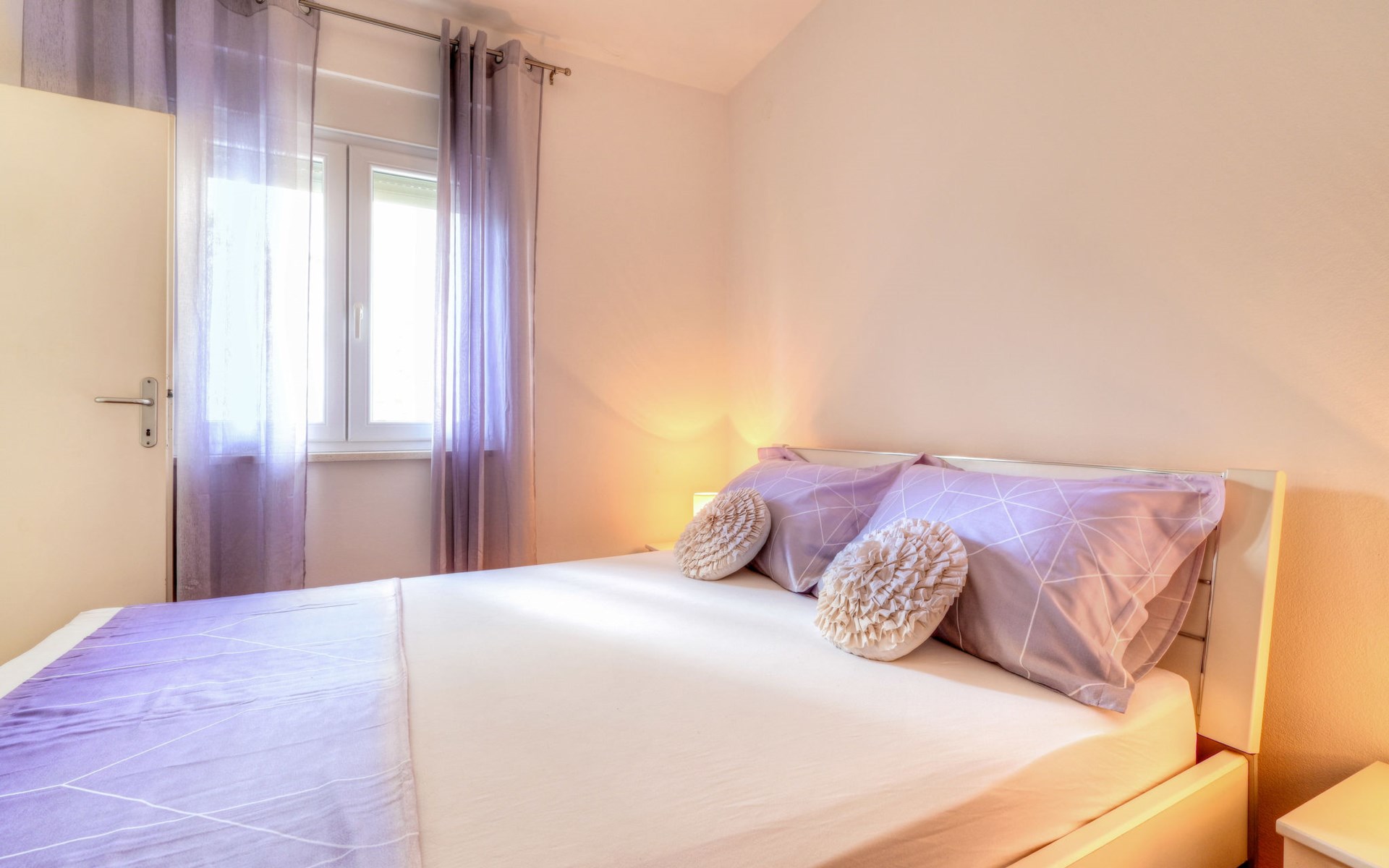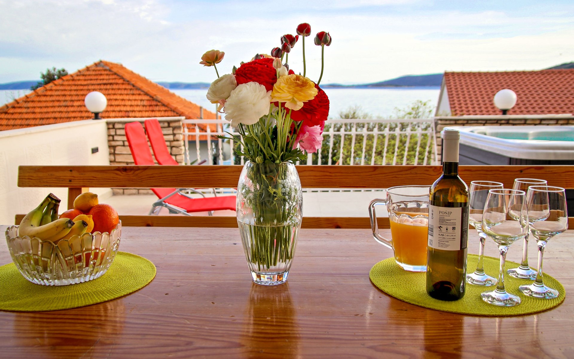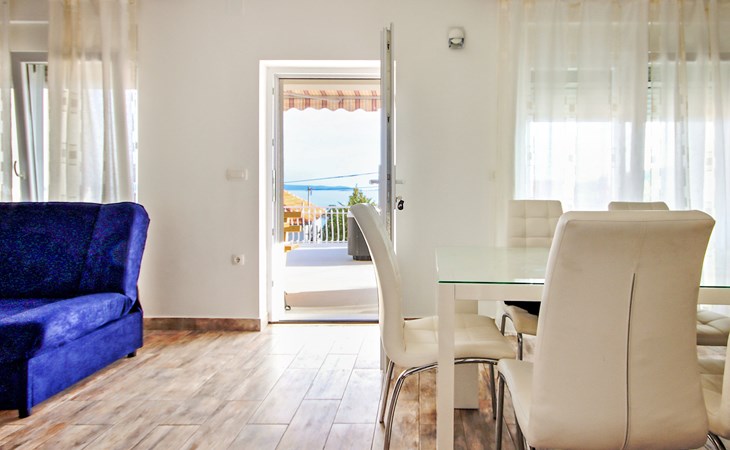 Seget Vranjica, 5 km von Trogir: Dreifamilienhaus "Tešija". Ruhige, sonnige Lage, 30 m vom Meer, 30 m vom Strand, in einer Sackgasse, Richtung Süden. Zur Alleinbenutzung: Aussendusche, Grill, Parkplatz beim Haus auf dem Grundstück, Einzelgarage. Einkaufsgeschäft, Restaurant 300 m, Bushaltestelle 1.5 km, Felsstrand, betonierter Strand 30 m. Bitte beachten: Flugplatz 12 km vom Haus.