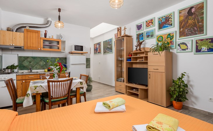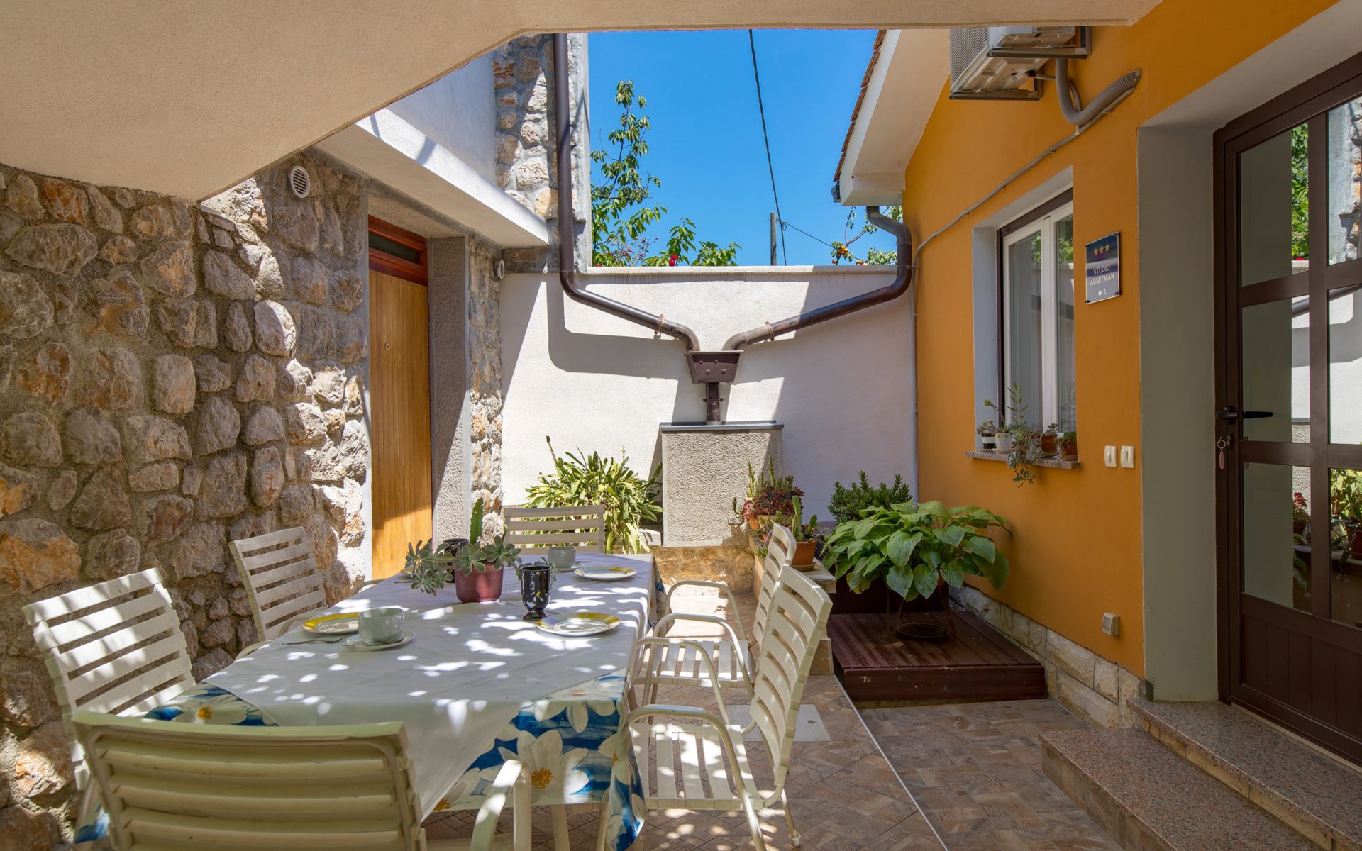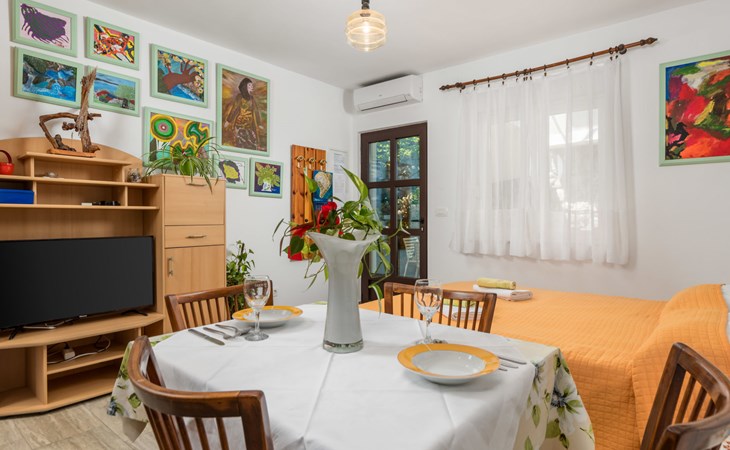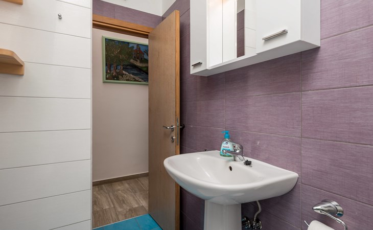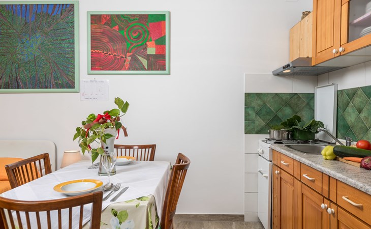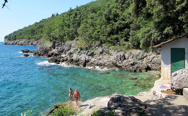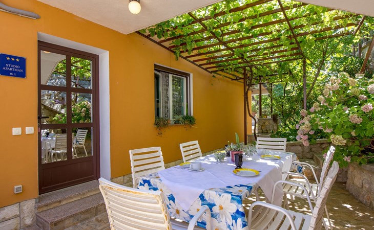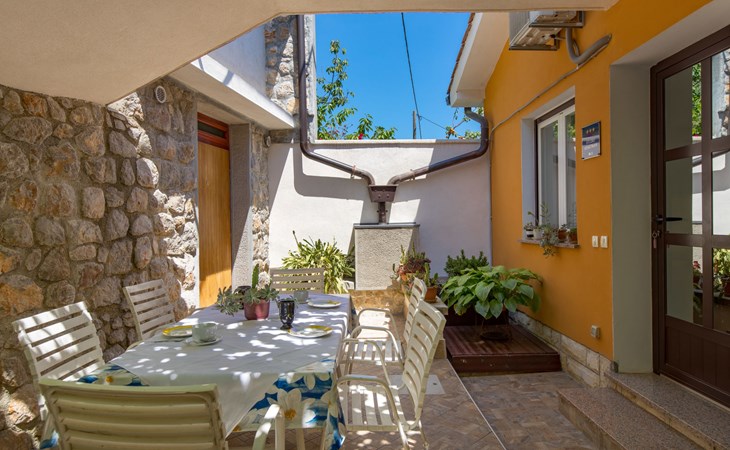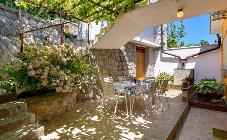Mehrfamilienhaus "Sandalj". Im Weiler Kraj, 2.5 km vom Zentrum von Mošćenička Draga, 2.5 km vom Zentrum von Medveja, am Hang, 200 m vom Meer, 200 m vom Strand, Strasse zu überqueren. Zur Mitbenutzung: Grundstück mit Pflanzen und Bäumen. Terrasse, Gartenmöbel, Grill. Im Hause: Internetzugang. Parkplatz auf dem Grundstück. Einkaufsgeschäft 2.5 km, Bushaltestelle 30 m, Kieselstrand, Felsstrand 200 m. Bitte beachten: private Bootsanlegestelle (extra) auf Anfrage. Der Besitzer wohnt im selben Haus. Steiler Fussweg und Stufen zum Strand. Der Vermieter betreibt im Untergeschoss eine Autowerkstatt.