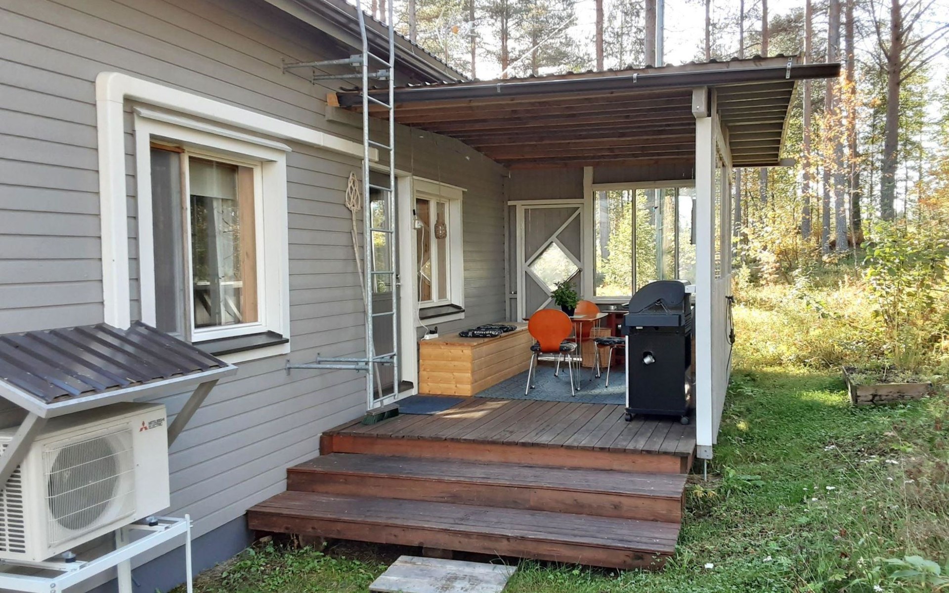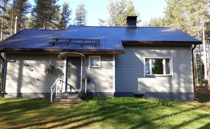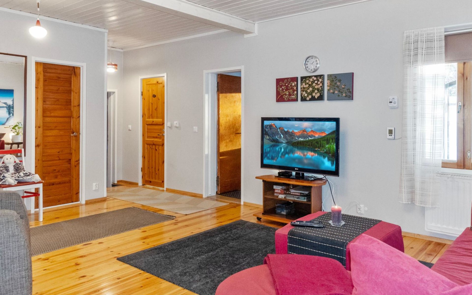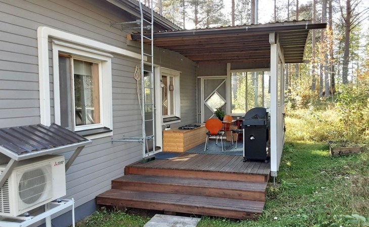 Wooden house, originally built in 1962, renovated and renewed in 2012. Living room/kitchen with sofa bed and separate 80 cm bed, bedroom with 2 motorized beds, second bedroom with 120 cm wide bed. Sauna, washroom, separate WC, cellar (access from inside the house) and a covered and partially glazed terrace.