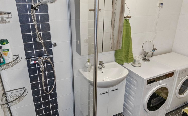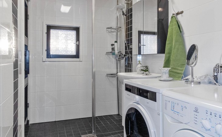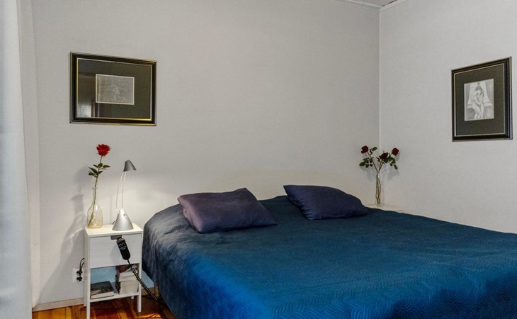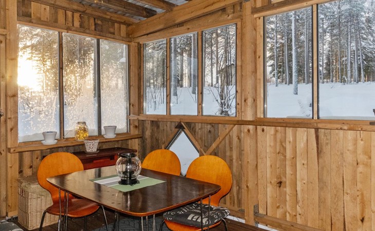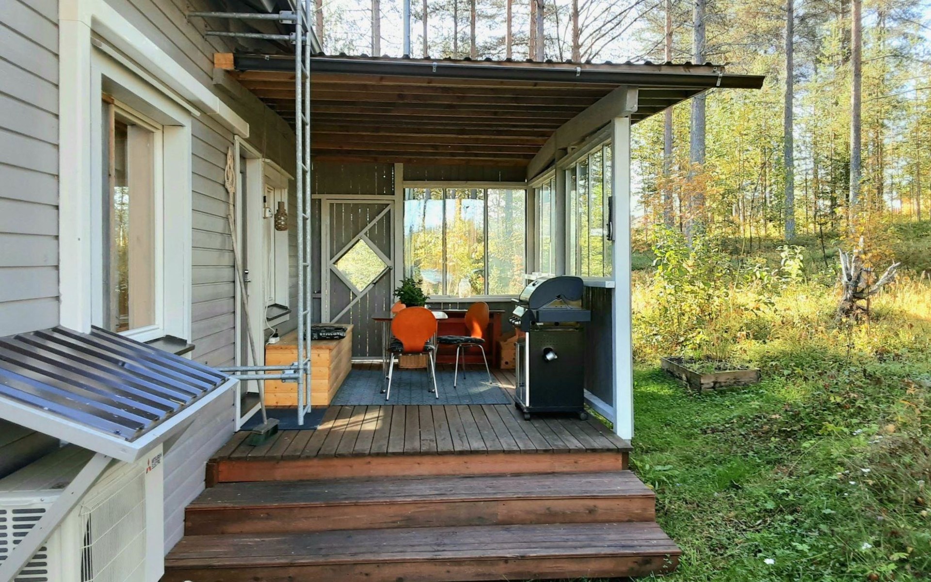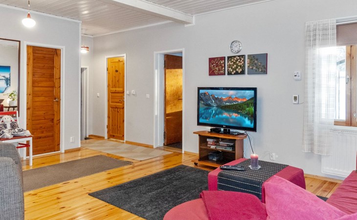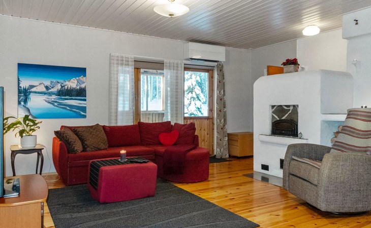 Wooden house, originally built in 1962, renovated and renewed in 2012. Living room/kitchen with sofa bed and separate 80 cm bed, bedroom with 2 motorized beds, second bedroom with 120 cm wide bed. Sauna, washroom, separate WC, cellar (access from inside the house) and a covered and partially glazed terrace.