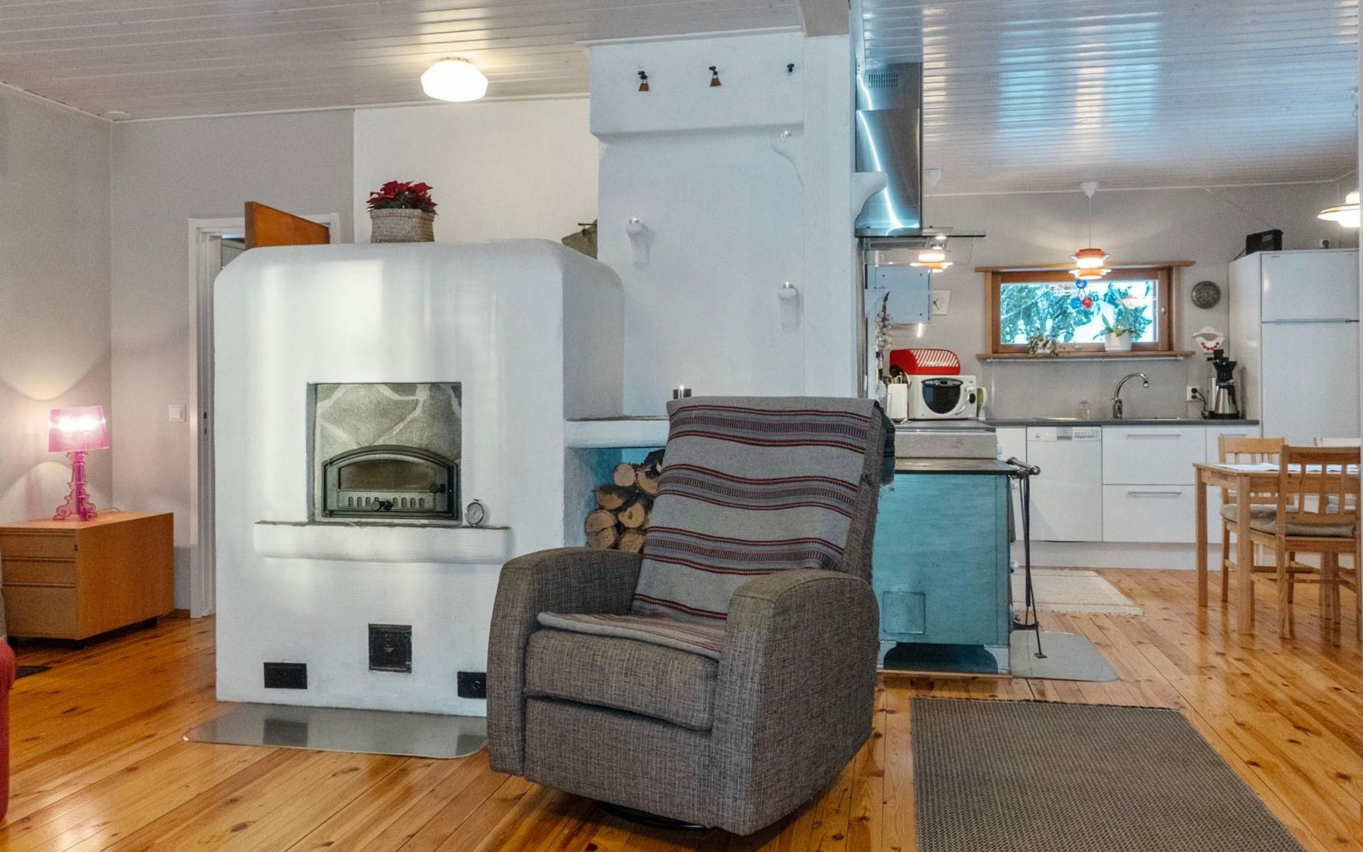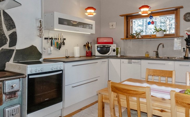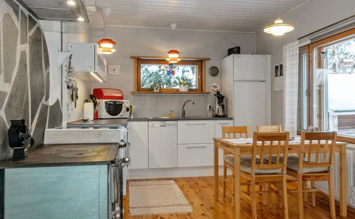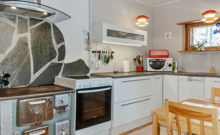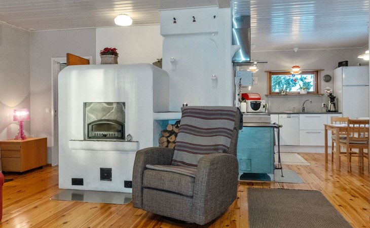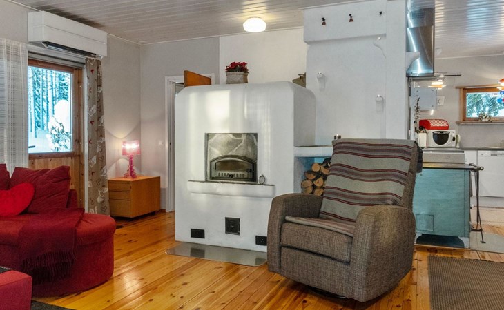 The cabin is heated primarily with electric radiators and an air source heat pump. A wood-burning baking oven and a wood stove are secondary and mainly sources of heat that bring comfort.