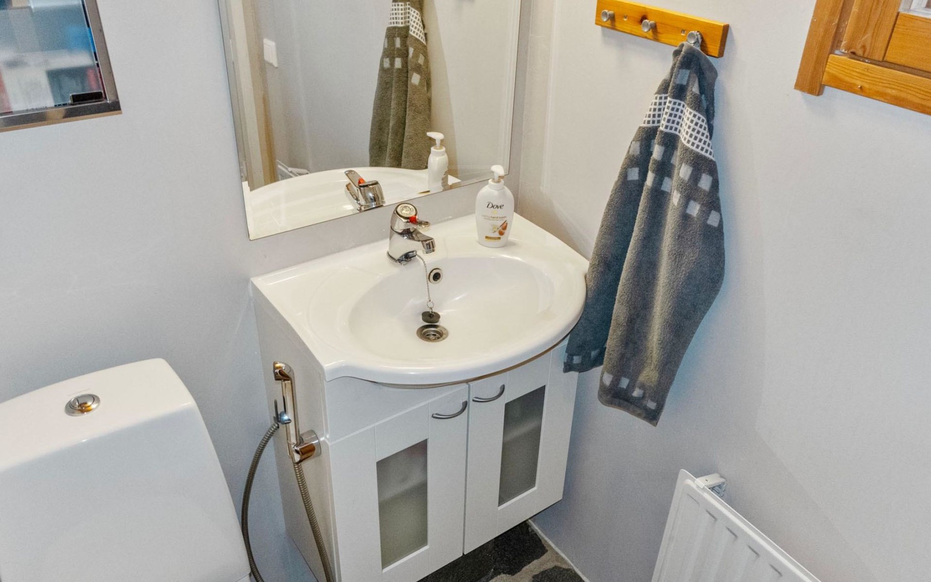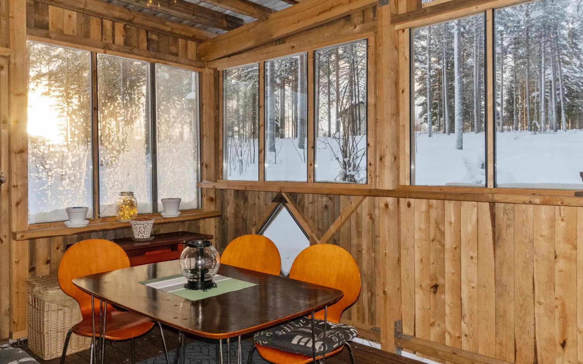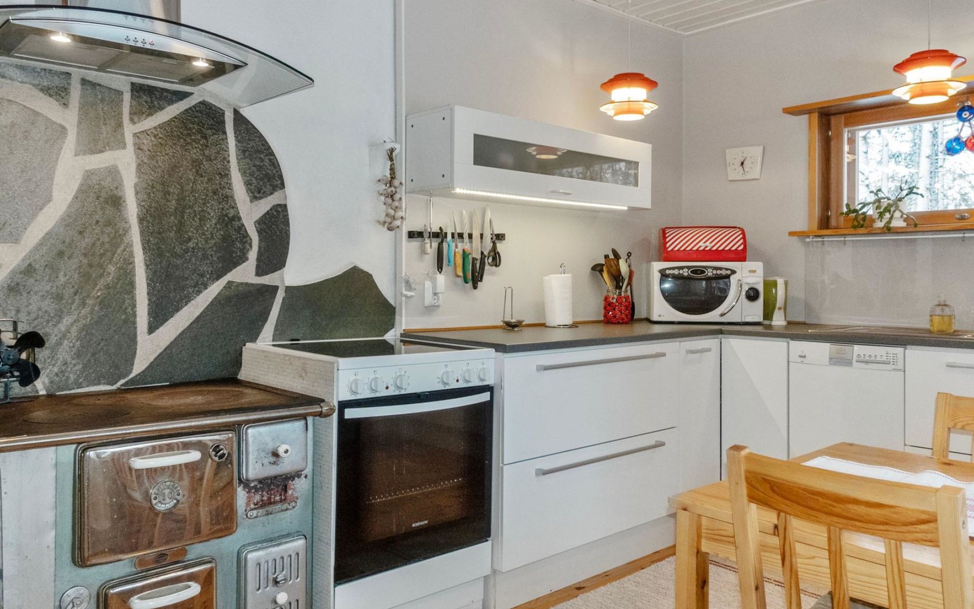 The cabin is heated primarily with electric radiators and an air source heat pump. A wood-burning baking oven and a wood stove are secondary and mainly sources of heat that bring comfort.