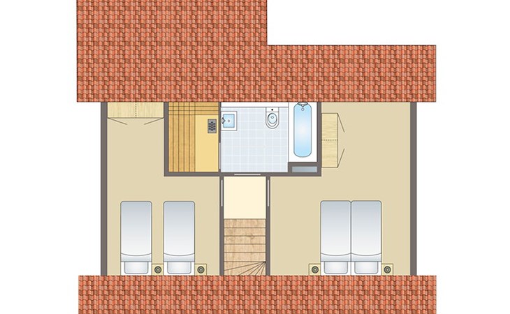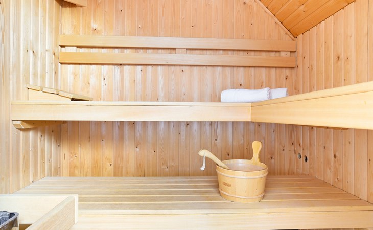 In der ersten Etage befinden sich 2 Schlafzimmer mit jeweils 2 Einzel-Boxspringbetten. Ebenfalls in der ersten Etage befindet sich ein Badezimmer mit einer Badewanne mit Dusche, einem Waschbecken und einer Toilette. Für das ultimative Urlaubsgefühl können Sie die private Sauna nutzen.