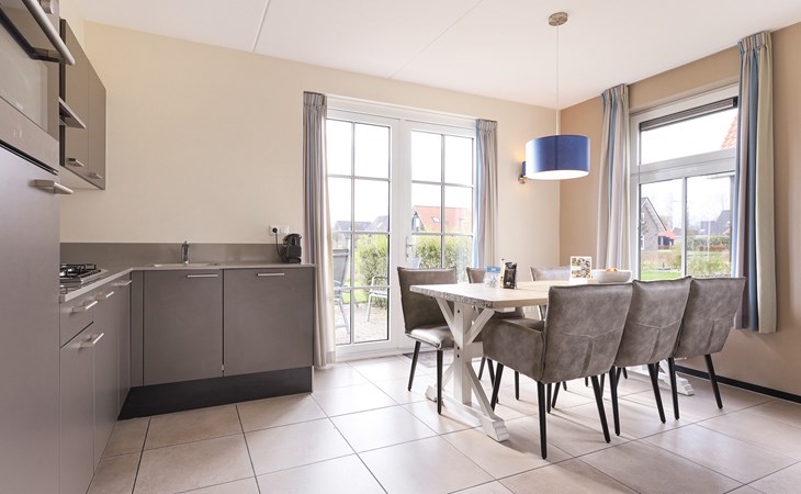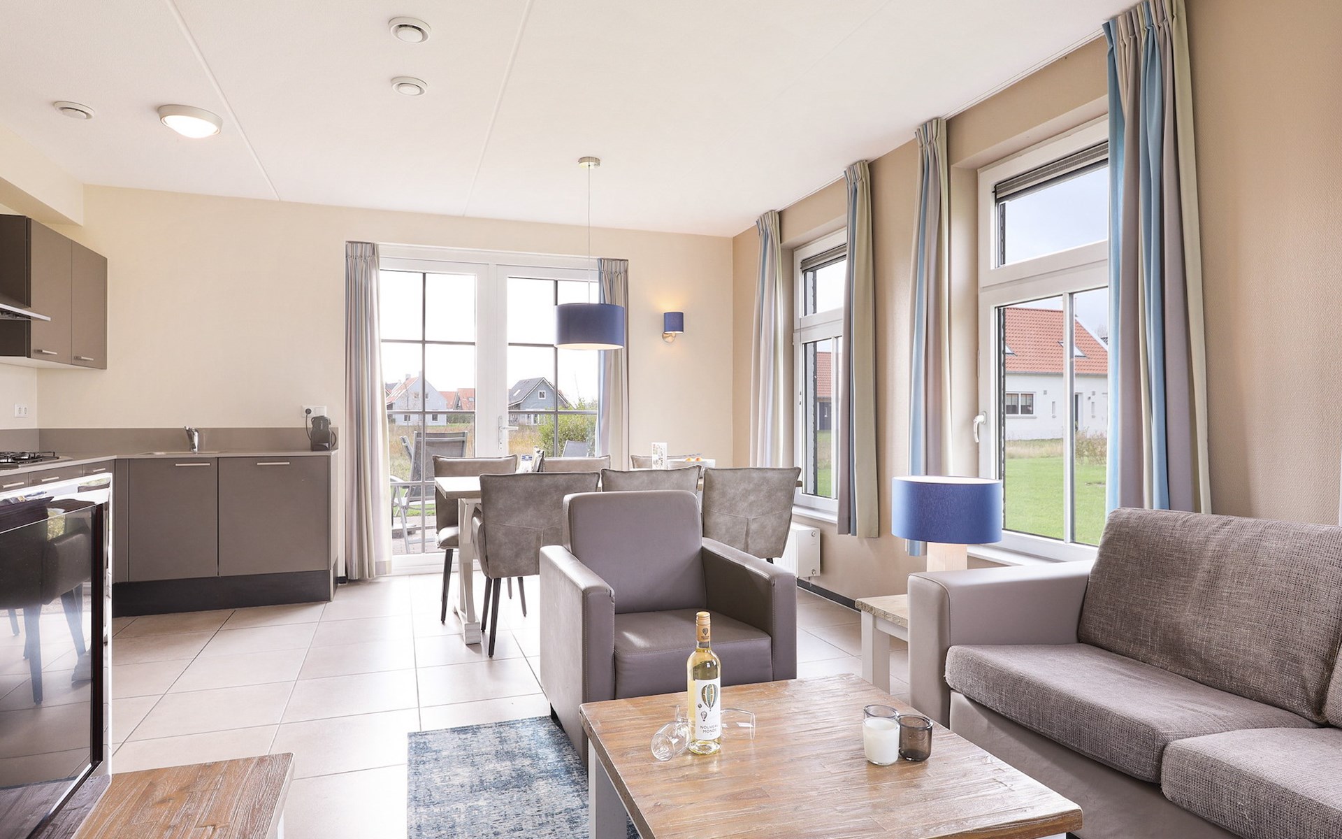Dieses Ferienhaus verfügt über ein gemütliches Wohn-/Esszimmer mit TV und Essecke. Die offene Küche ist komplett ausgestattet und verfügt über einen Kombi-Backofen, eine Geschirrspülmaschine und eine Nespresso-Maschine. Außerdem gibt es im Erdgeschoss 1 Schlafzimmer mit 2 Einzel-Boxspringbetten, die als Doppelbett aufgestellt sind, und einem Fernseher. Das En-Suite-Badezimmer hat eine Sonnendusche und ein Waschbecken. Außerdem gibt es einen Abstellraum mit Waschmaschinen-/Trocknerkombination sowie eine separate Toilette im Erdgeschoss.