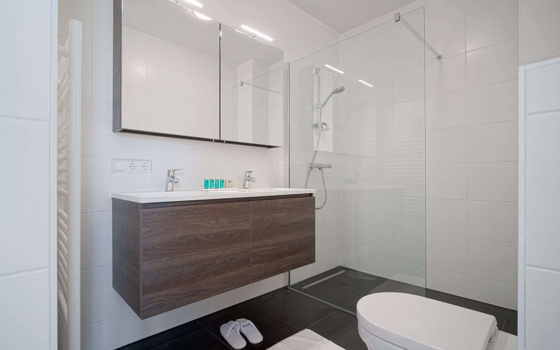Es gibt 2 Schlafzimmer, jedes mit zwei Einzelbetten und einem En-Suite-Badezimmer. Ein En-Suite-Badezimmer hat eine begehbare Dusche, ein Doppelwaschbecken und eine Toilette. Das andere Badezimmer hat eine Dusche und ein Waschbecken. Es gibt auch eine separate Toilette.