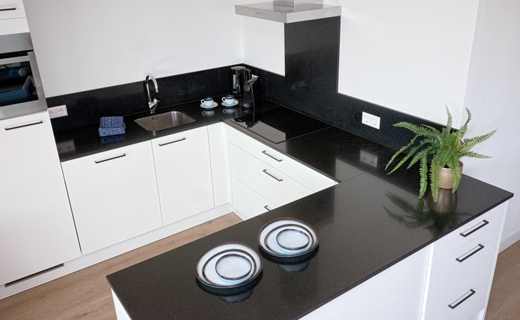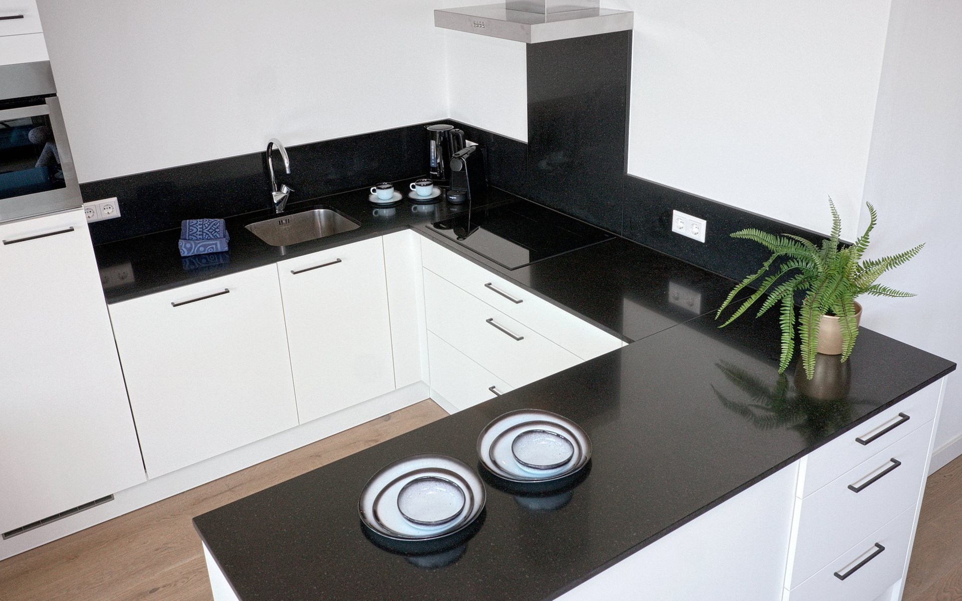 Die Ferienwohnung ist modern eingerichtet und verfügt über ein großzügiges Wohnzimmer mit einer Essecke und einer Sitzecke, die mit einem Smart-TV mit Streaming-Funktion ausgestattet ist. Die offene Küche ist komplett ausgestattet und verfügt über eine Kühl-Gefrier-Kombination, einen Kombi-Backofen, eine Nespresso-Maschine und eine Geschirrspülmaschine.