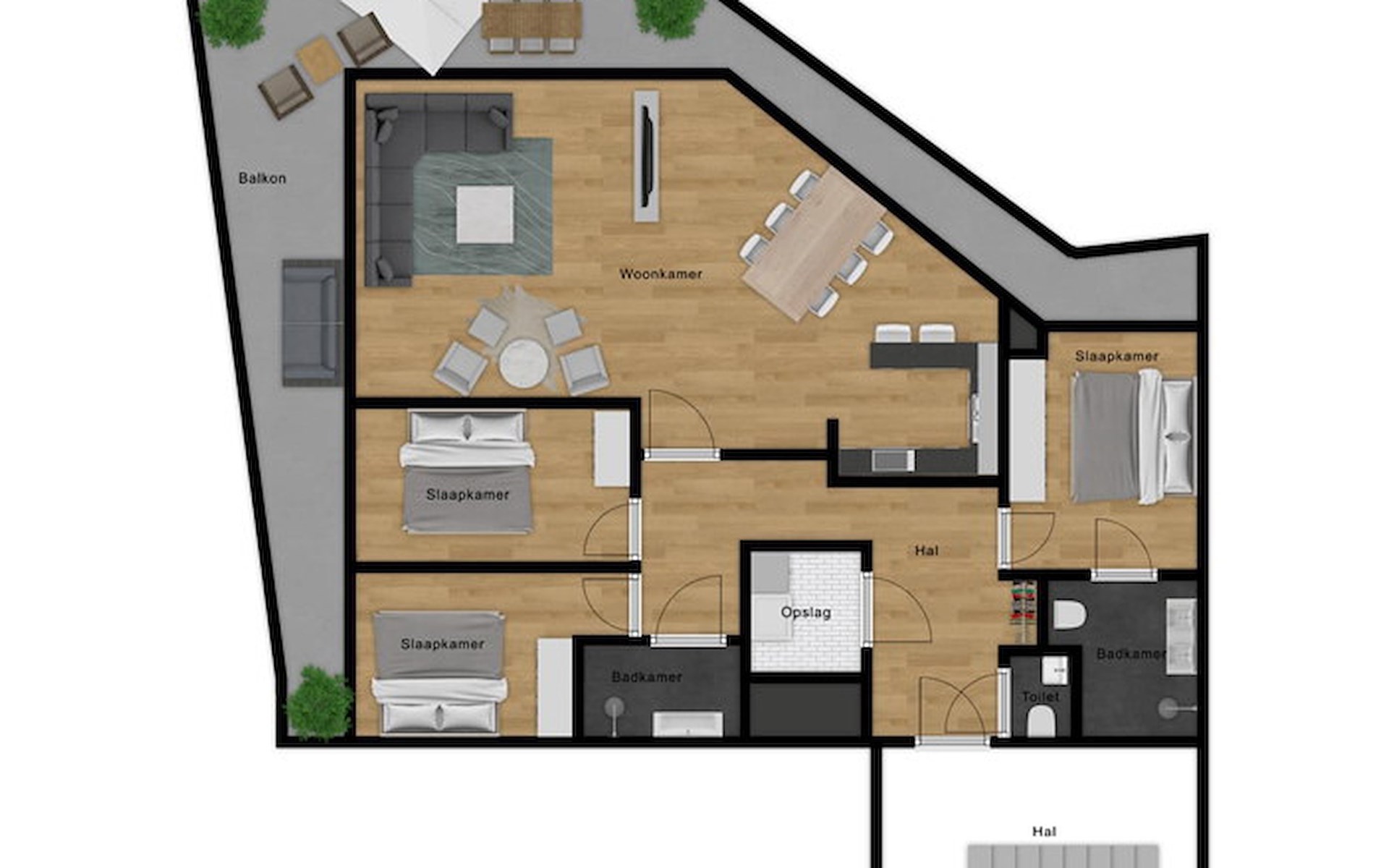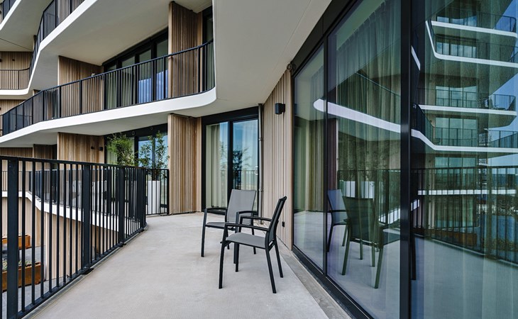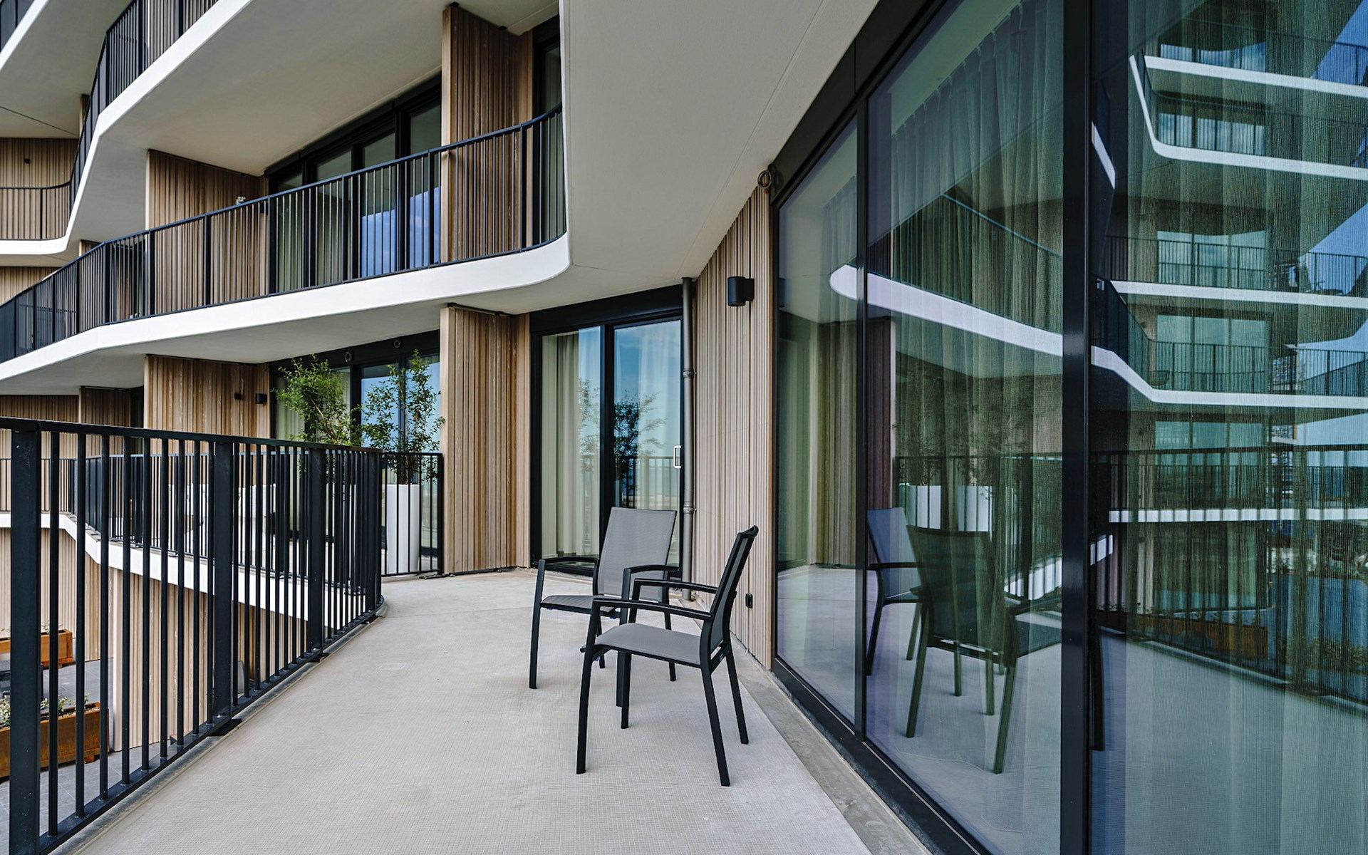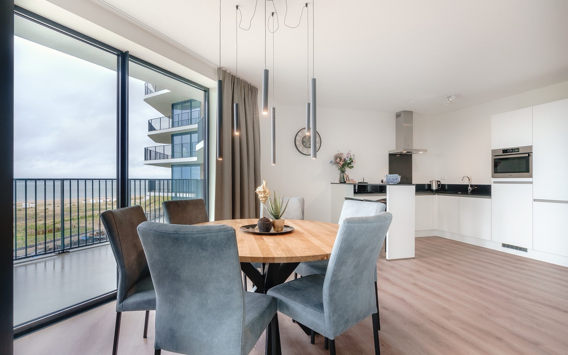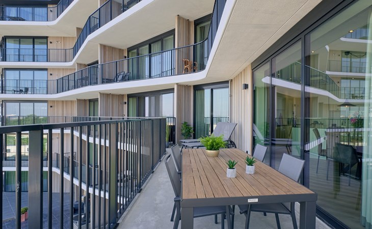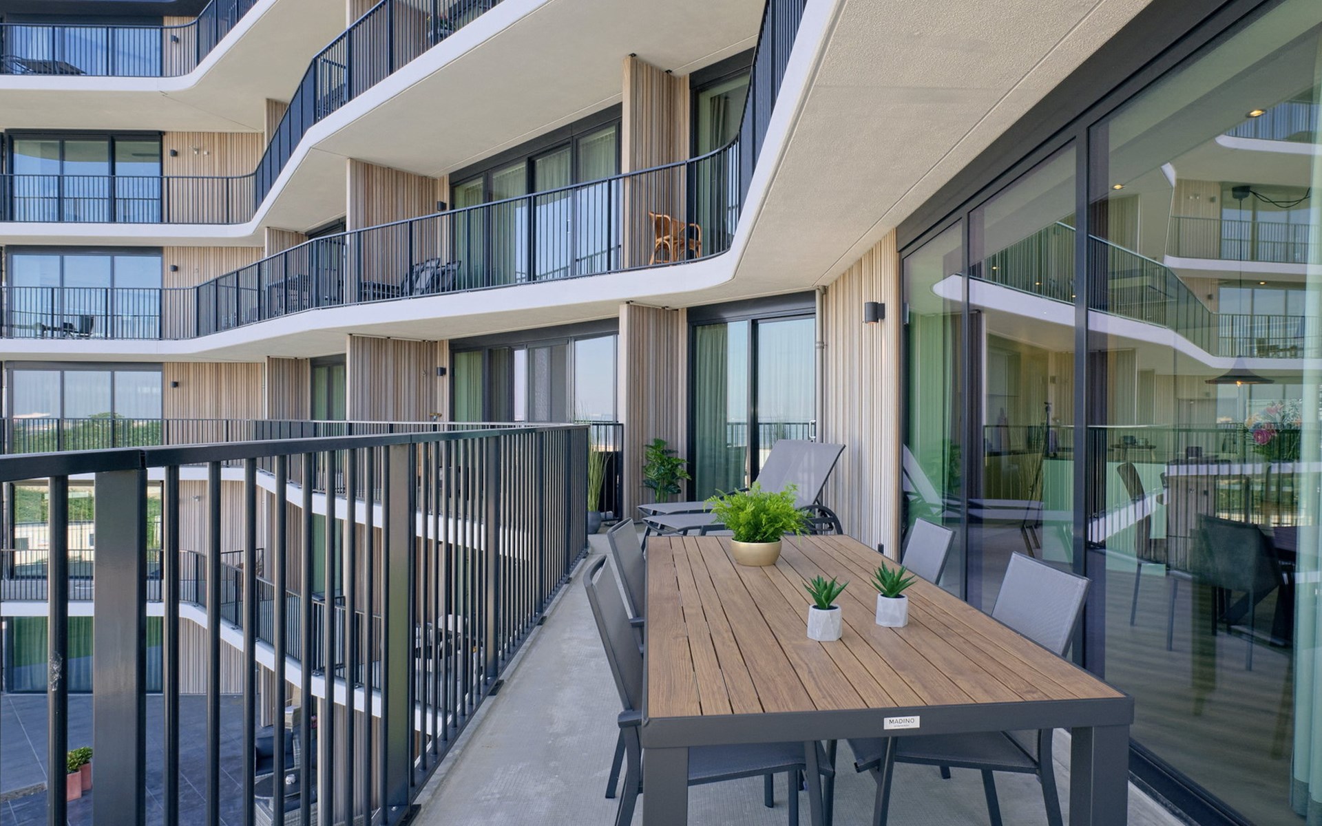 Vom Wohnzimmer und allen Schlafzimmern haben Sie Zugang zum möblierten Balkon, der sich seitlich der Ferienwohnung erstreckt. Der Balkon ist mit Gartenmöbeln ausgestattet, wo Sie es sich mit der ganzen Gesellschaft gemütlich machen können. Vom Balkon aus haben Sie Aussicht auf die Westerschelde, die Nordsee und die Dünen.