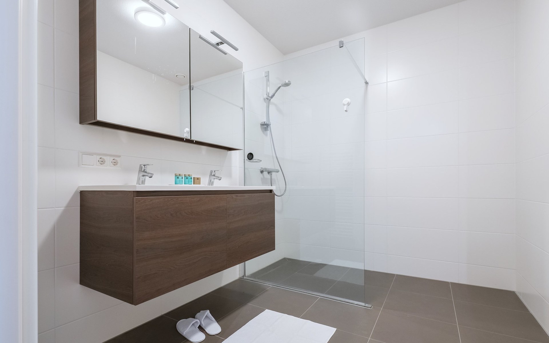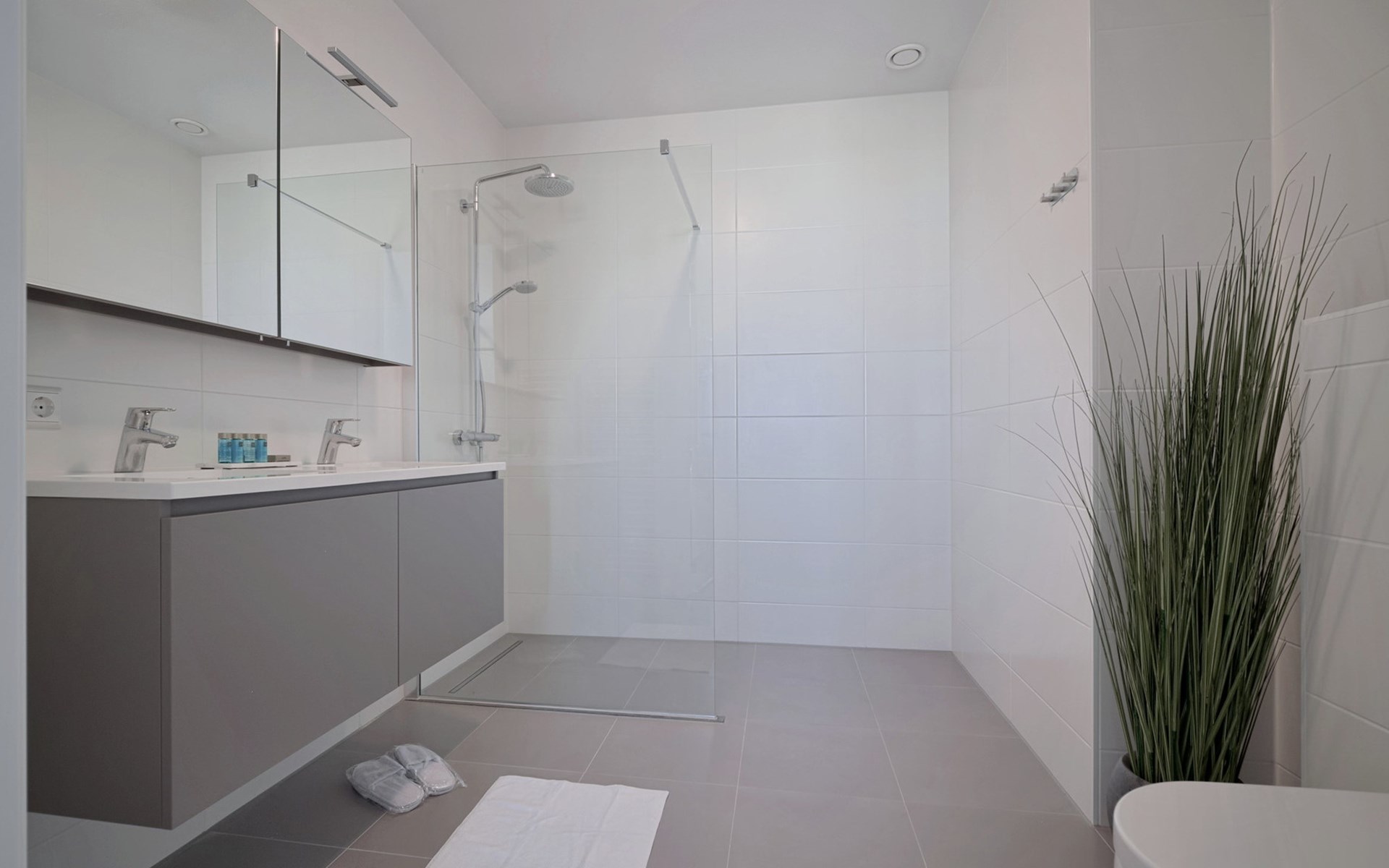 Es gibt 3 Schlafzimmer in der Ferienwohnung, jedes mit zwei Einzelbetten, eines davon hat ein En-Suite-Badezimmer mit begehbarer Dusche, Doppelwaschbecken und Toilette. Das zweite Badezimmer ist mit einer begehbaren Dusche und einem Doppelwaschbecken ausgestattet. Es gibt ebenfalls eine separate Toilette.