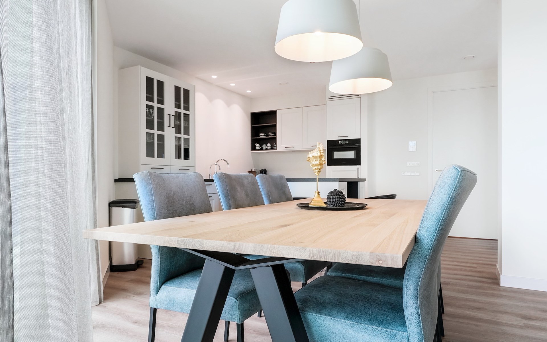 Das großzügige Wohnzimmer bietet eine bequeme Sitzecke mit einem Smart-TV, auf dem Sie Inhalte streamen können. Daneben befindet sich der Essbereich und eine offene Küche mit Luxusgeräten. Hier stehen Ihnen unter anderem eine Kühl-Gefrierkombination, ein Kombi-Backofen, eine Nespresso-Maschine und eine Geschirrspülmaschine zur Verfügung.