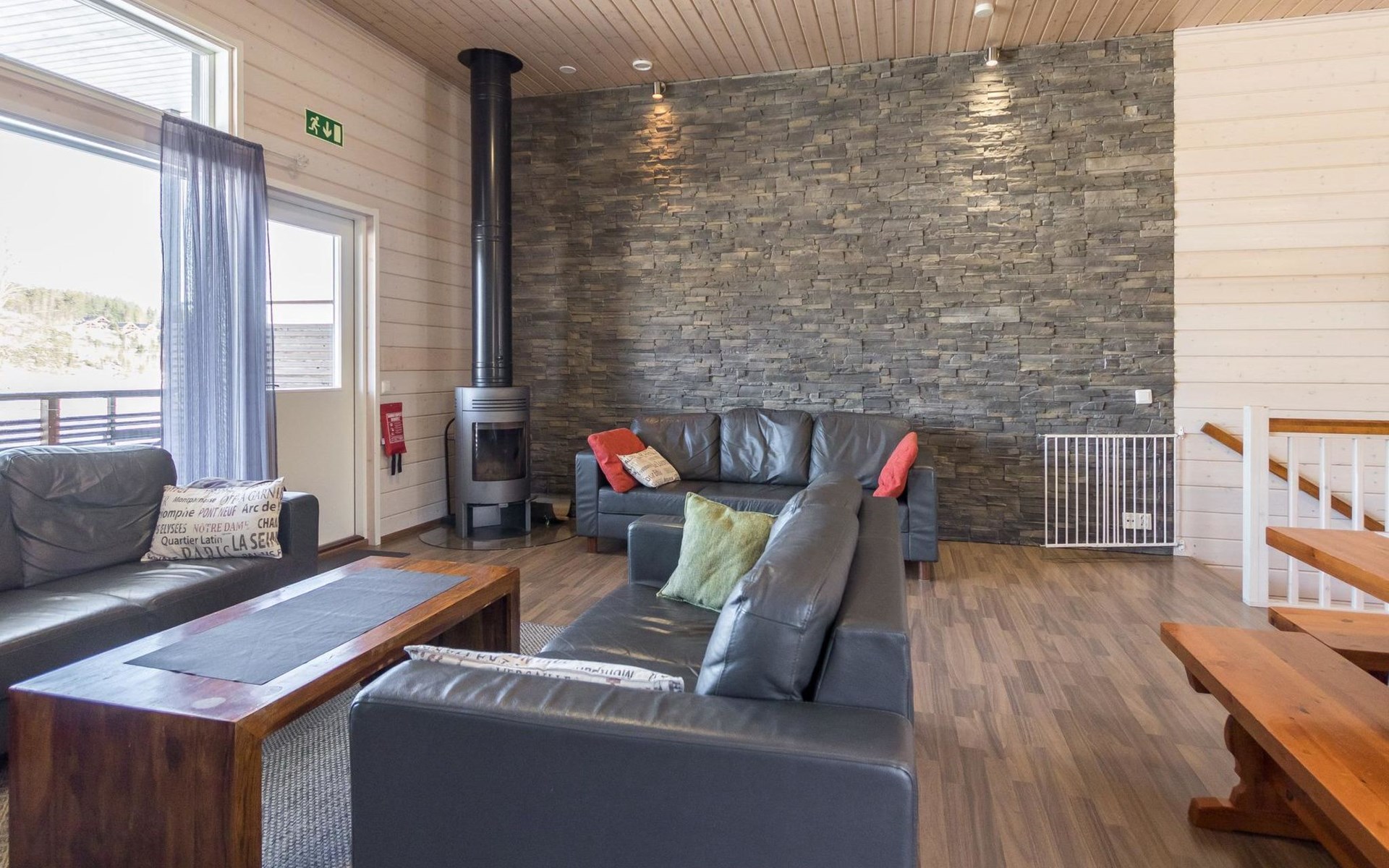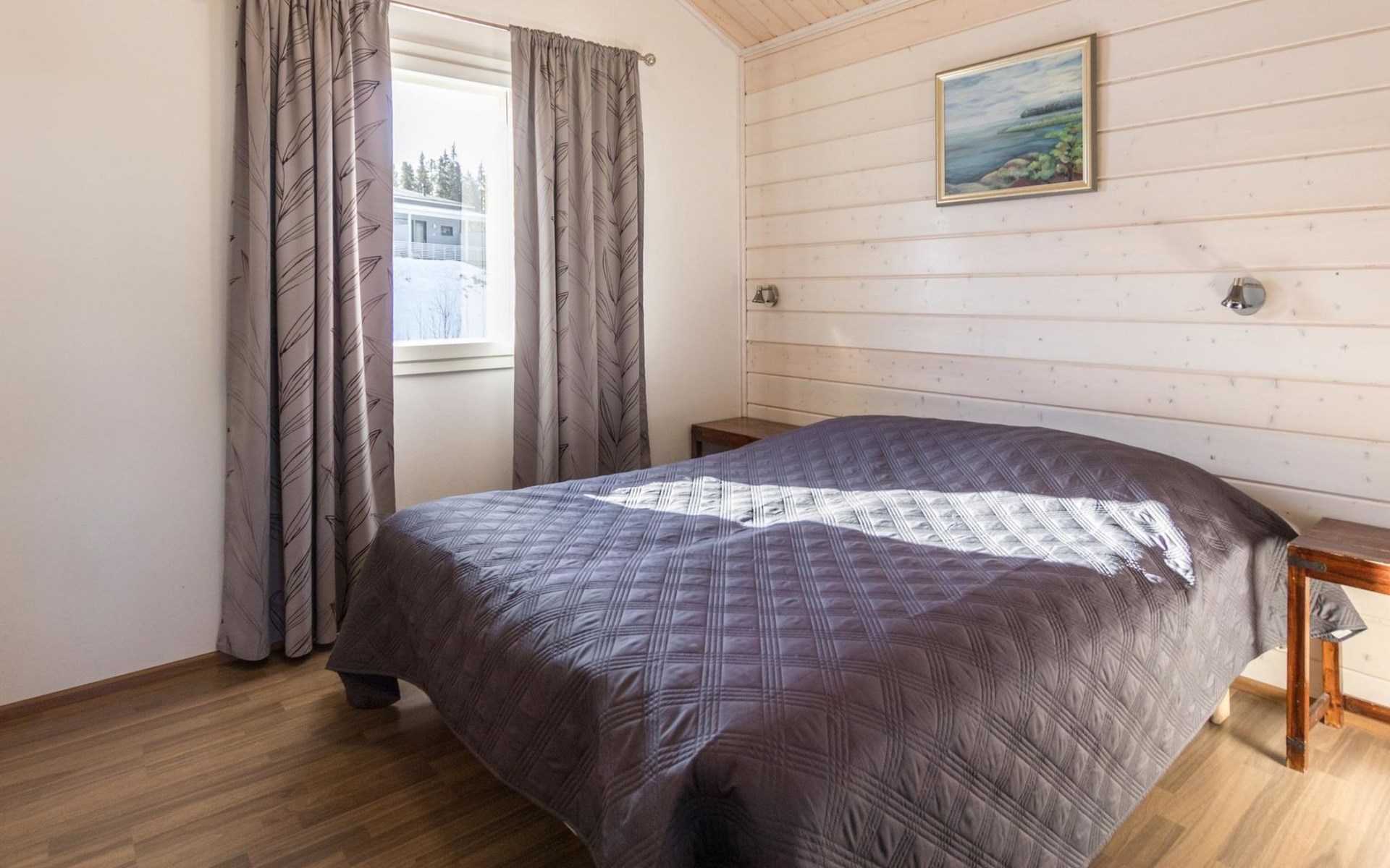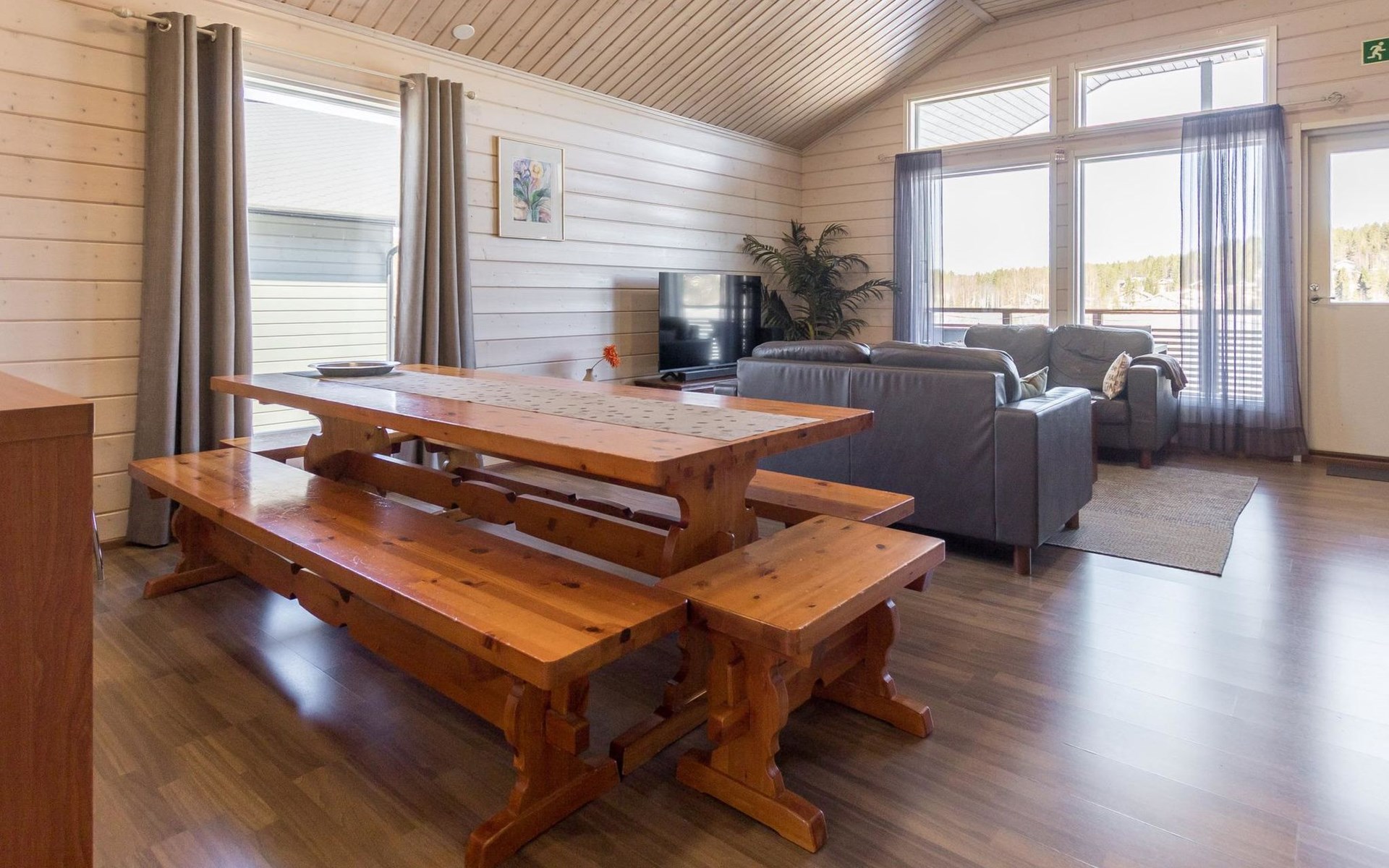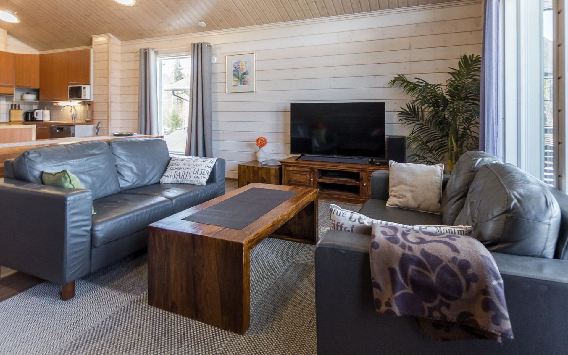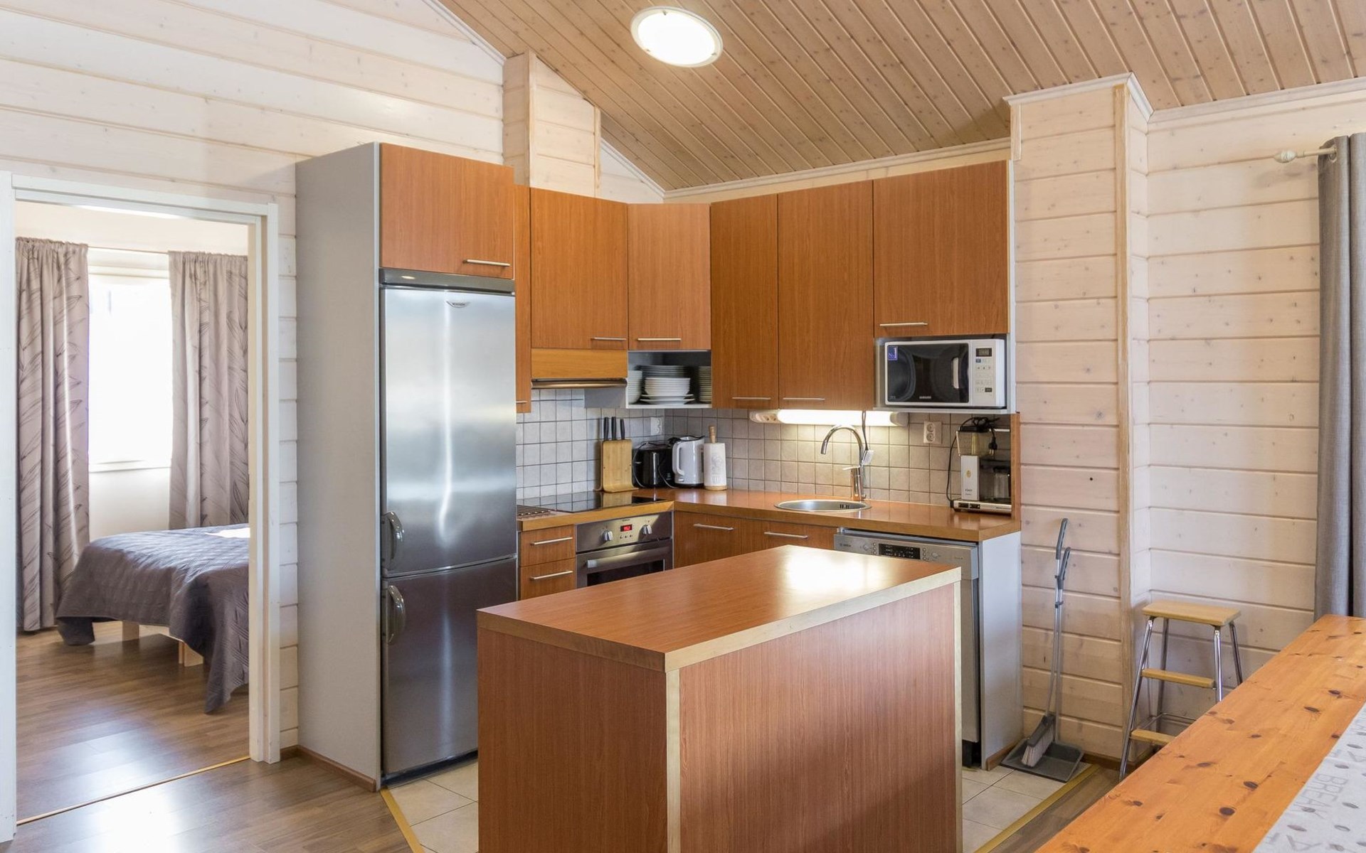 Doppelhaushälfte, im Tourismuszentrum Ukkohalla, Fläche 125 m2, für 10-14 Personen, Baujahr 2009. Räumlichkeiten auf 2 Etagen, im ersten Stock 2 Schlafzimmer, Wohnzimmer, Sauna, Duschbad/WC, Terrasse. Im zweiten Stock Küche, 1 Schlafzimmer, Duschbad/WC, Terrasse. Lagerung, Kamin. Blick auf den See Syväjärvi. 2 Schlafzimmern mit je 2 Betten, Doppelbett in einem Schlafzimmer, Schlafsofa und 2 Zusatzbetten im Wohnzimmer und in der Küche. Der Preis beinhaltet 1 Sack Brennholz, zusätzliches Holz vom Hausmeister (Euro 10/Sack). Ukkohalla: Tourismuszentrum am See Syväjärvi, Informationszentrum, Geschäft, Restaurant, Spa, Pistenzentrum, Schneemobilpisten, Skipisten, Programmservice, Strand (weitere Informationen unter www.ukkohalla.fi). Entfernung zu den Ukkohalla-Diensten 0,1 km. Flughafen Kajaani 86 km, Oulu 170 km, Helsinki 650 km, Bushaltestelle Hyrynsalmi 18 km, Bahnhof Kontiomäki 66 km. Haustiere nicht erlaubt, Blick auf den See Syväjärvi. Das Ferienhaus steht am Anreisetag ab 16.00 Uhr bis 12.00 Uhr am Abreisetag zur Verfügung. Die Endreinigung ist inbegriffen. ZUSÄTZLICHE GEBÜHR FÜR BETTWÄSCHE (€13/PERSON) WELCHE GEBUCHT WERDEN MÜSSEN.