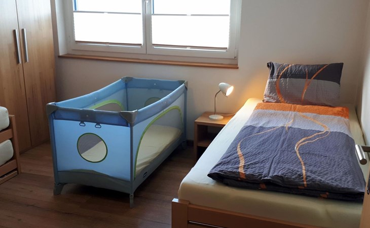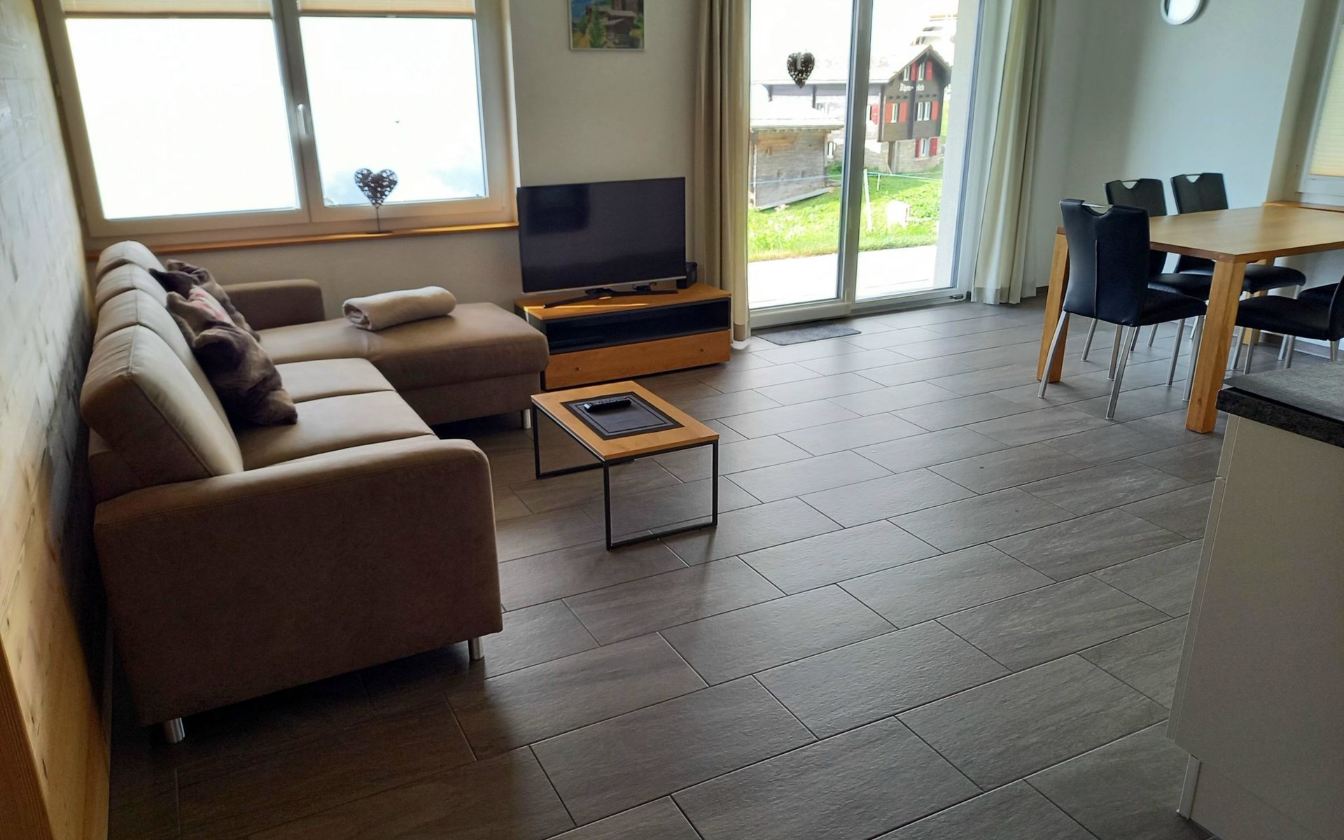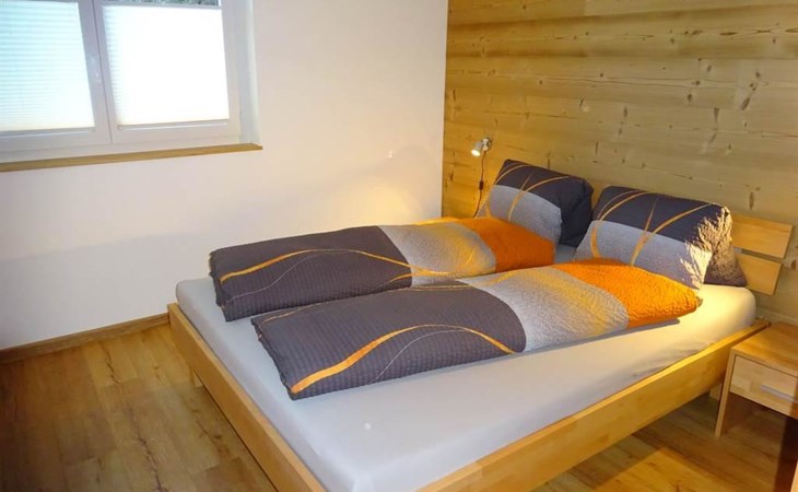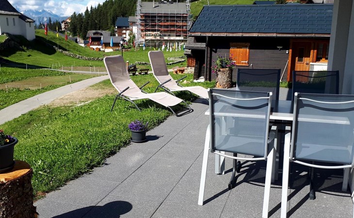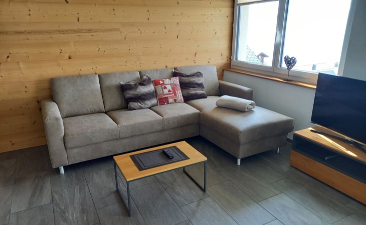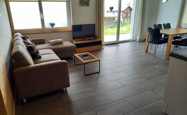 Die 3 1/2 Zimmerwohnung im Erdgeschoss bietet Platz für bis zu fünf Personen. Das Hauptschlafzimmer ist mit einem Doppelbett ausgestattet, während das zweite Schlafzimmer über zwei Einzelbetten sowie ein praktisches Ausziehbett verfügt. Die offene Wohnküche ist hell gestaltet und beinhaltet neben dem Esstisch auch einen Geschirrspüler sowie weitere Küchengeräte für den täglichen Bedarf. Direkt an die Küche schliesst der Wohnbereich mit einem Sofa und einem Fernseher an. Die Nasszelle ist mit einer Dusche, einem Lavabo und einer Toilette ausgestattet. Ein besonderes Highlight ist der nach Süden ausgerichtete Gartensitzplatz, der mit Gartenmöbeln ausgestattet ist und sowohl Sonne als auch Ausblick auf die umliegende Bergwelt bietet.