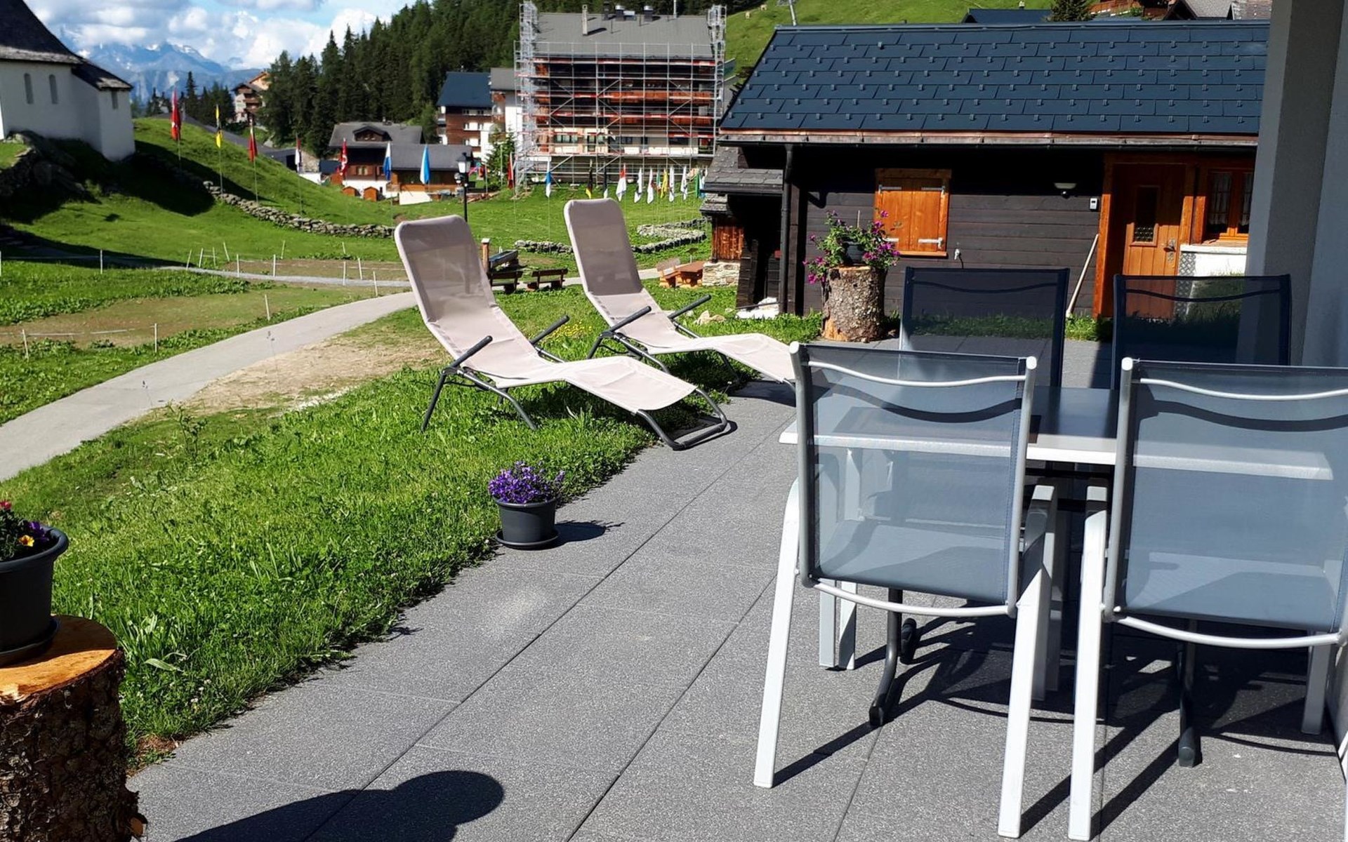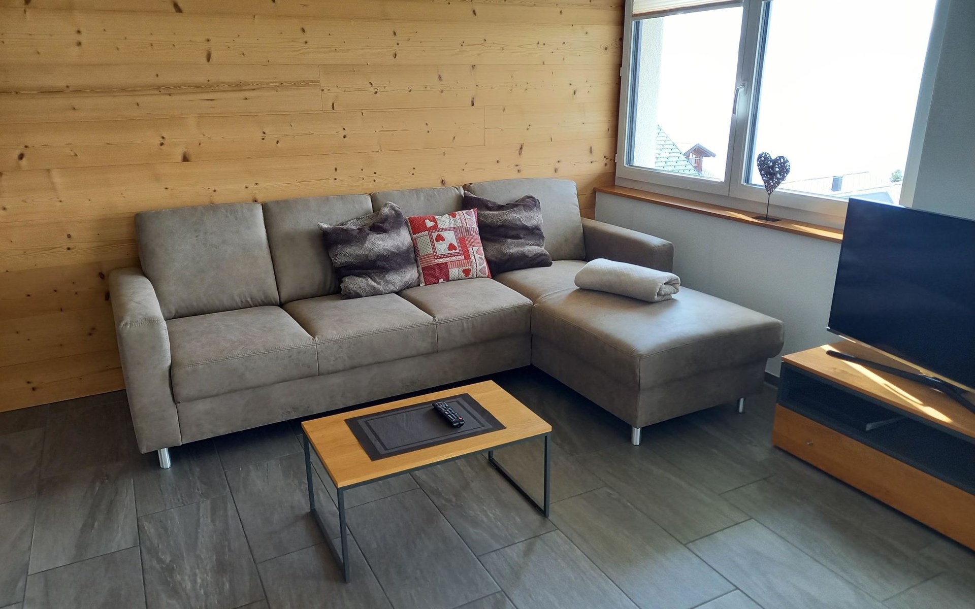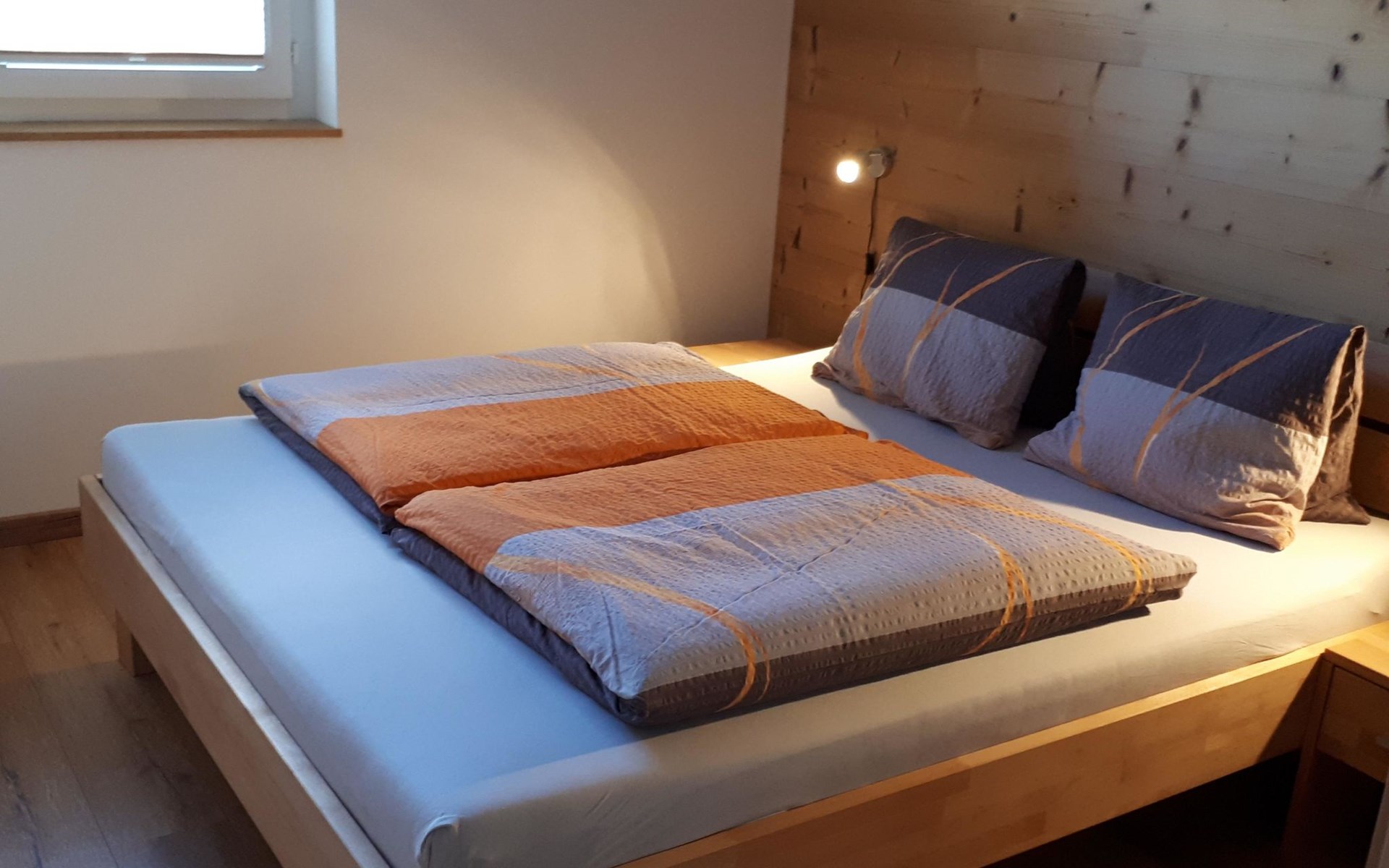 Die 3 1/2 Zimmerwohnung im Erdgeschoss bietet Platz für bis zu fünf Personen. Das Hauptschlafzimmer ist mit einem Doppelbett ausgestattet, während das zweite Schlafzimmer über zwei Einzelbetten sowie ein praktisches Ausziehbett verfügt. Die offene Wohnküche ist hell gestaltet und beinhaltet neben dem Esstisch auch einen Geschirrspüler sowie weitere Küchengeräte für den täglichen Bedarf. Direkt an die Küche schliesst der Wohnbereich mit einem Sofa und einem Fernseher an. Die Nasszelle ist mit einer Dusche, einem Lavabo und einer Toilette ausgestattet. Ein besonderes Highlight ist der nach Süden ausgerichtete Gartensitzplatz, der mit Gartenmöbeln ausgestattet ist und sowohl Sonne als auch Ausblick auf die umliegende Bergwelt bietet.