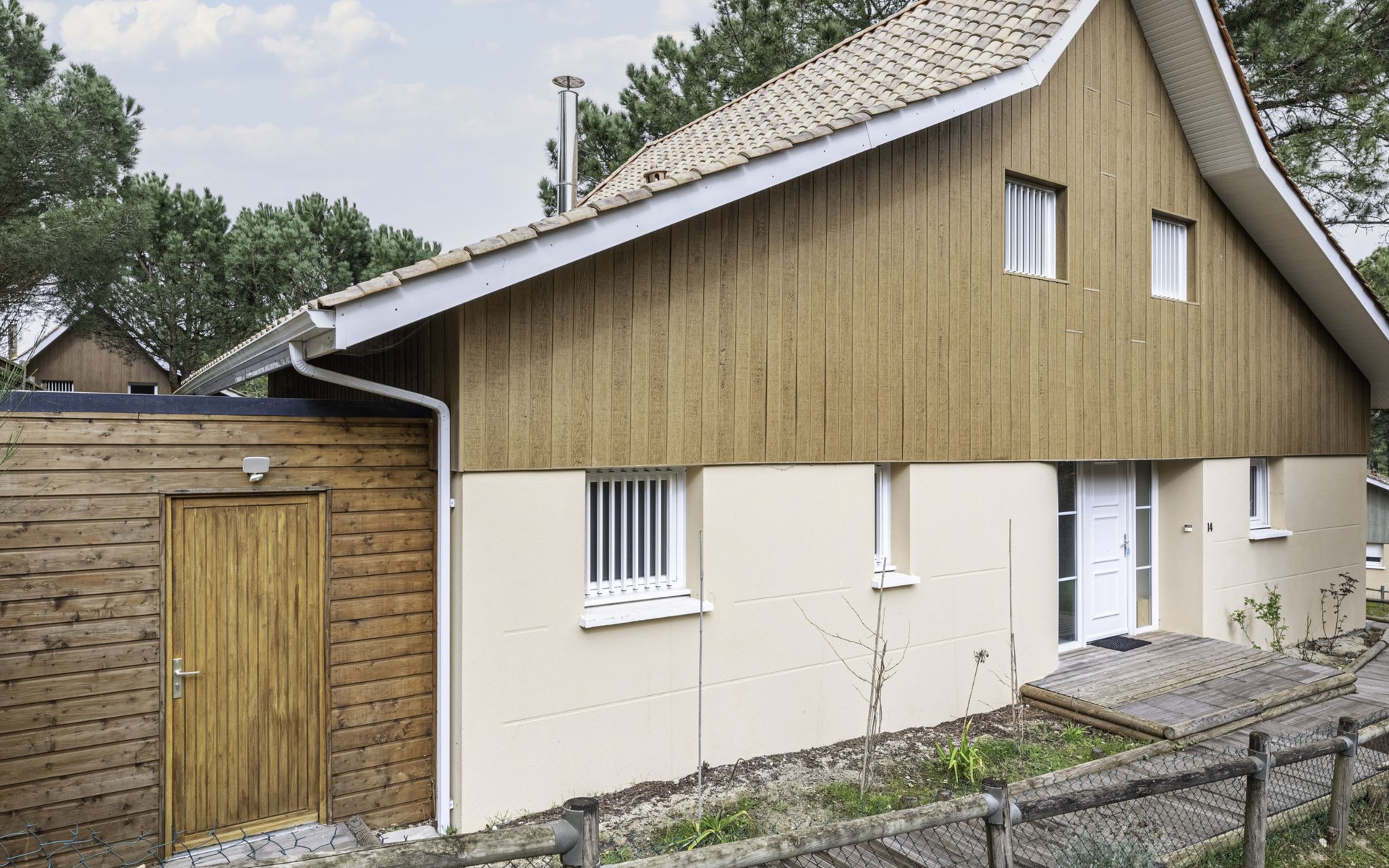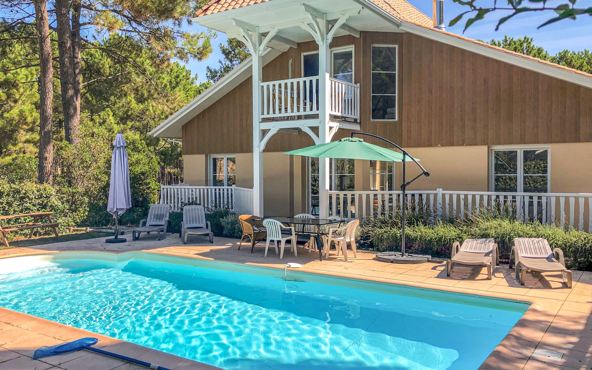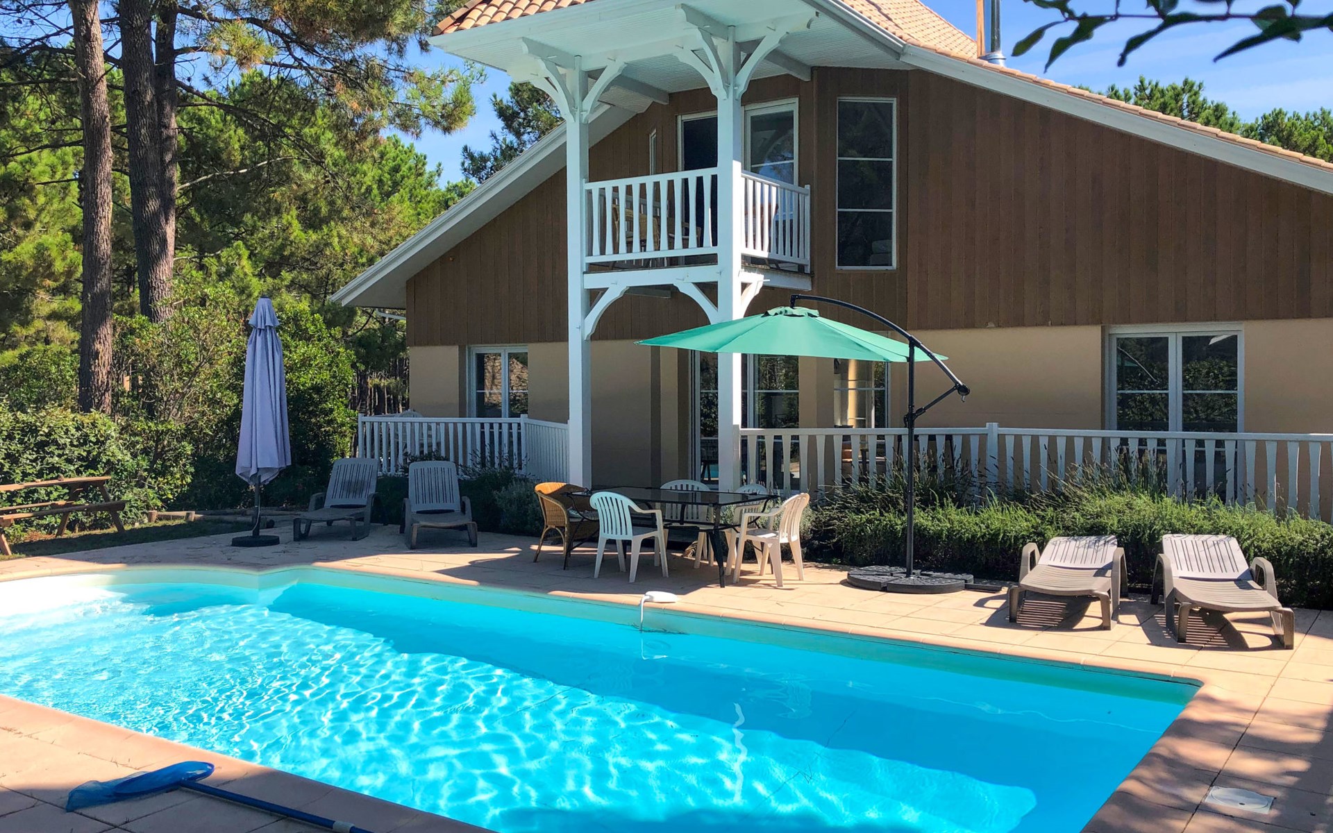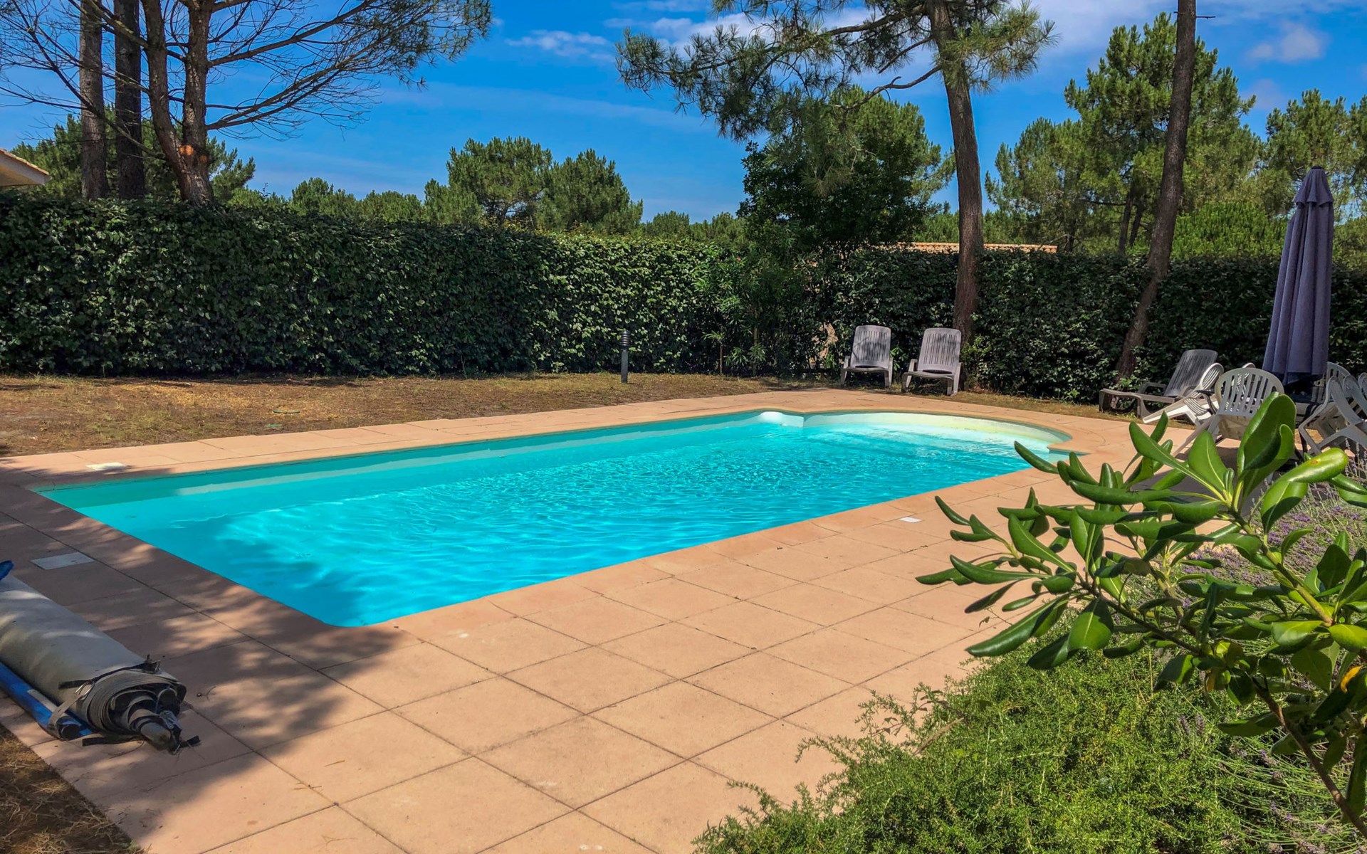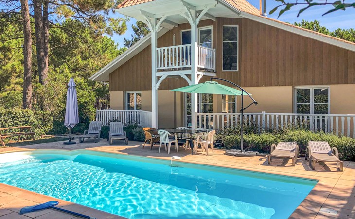 Feriensiedlung "Eden Club". Ausserhalb des Ortes, 2.5 km vom Zentrum, 3 km vom See. Zur Alleinbenutzung: Garten 500 m2 (eingezäunt) mit Rasen, Schwimmbad (4 x 8 m, 50 - 220 cm tief, saisonale Verfügbarkeit: 01.Jun. - 30.Sep.). Parkplatz beim Haus in 10 m. Einkaufsgeschäft 2.5 km, Supermarkt 11 km, Restaurant 250 m, Bushaltestelle "Marie Curie" 2.2 km, Sandstrand 2.5 km, 3 km. Golfplatz (9 Loch) 500 m, Tennis, Tennishalle 750 m, Reitstall 100 m. Nahe gelegene Sehenswürdigkeiten: Parcours Aventure 250 m, Golf international Lacanau 2.5 km.