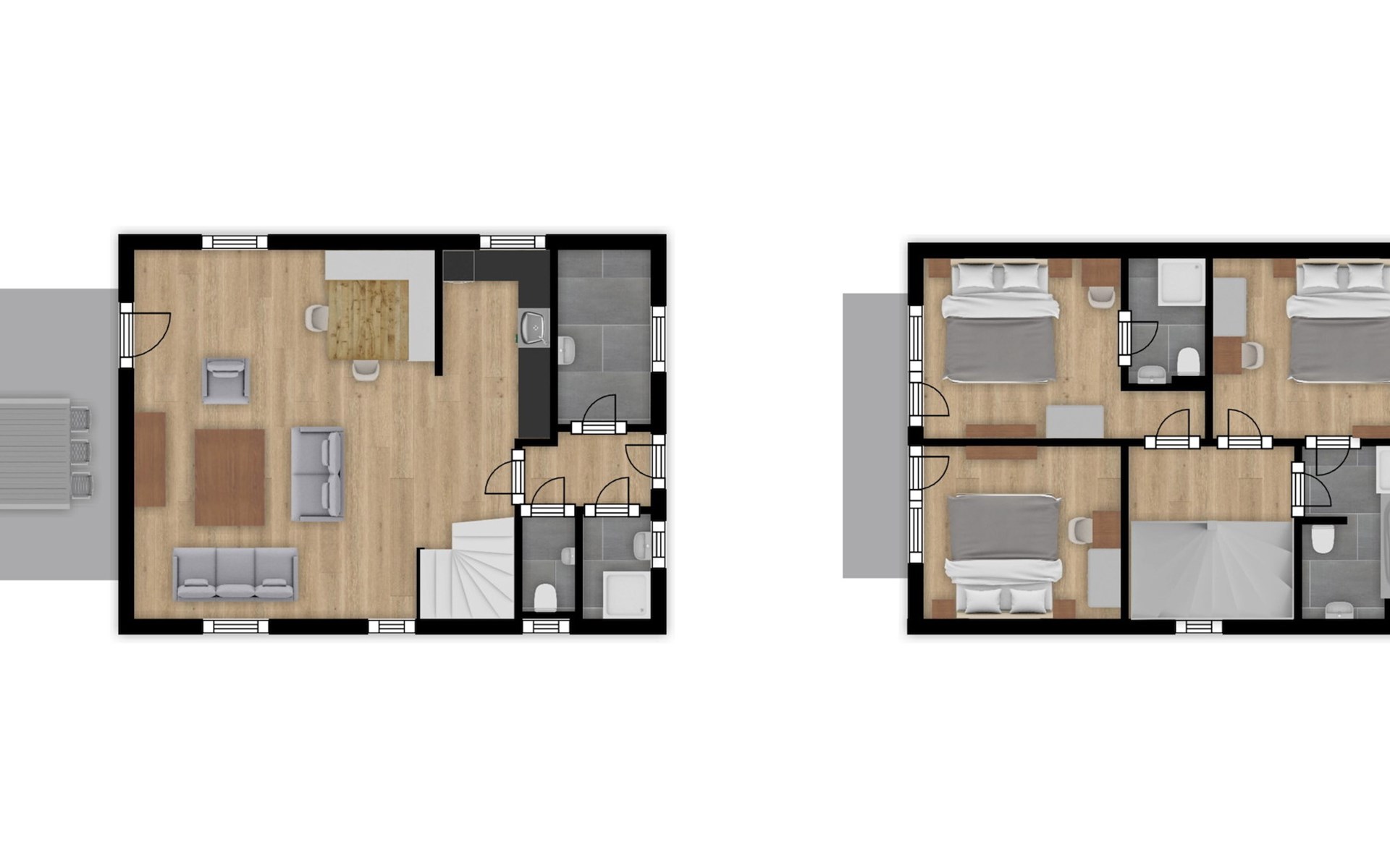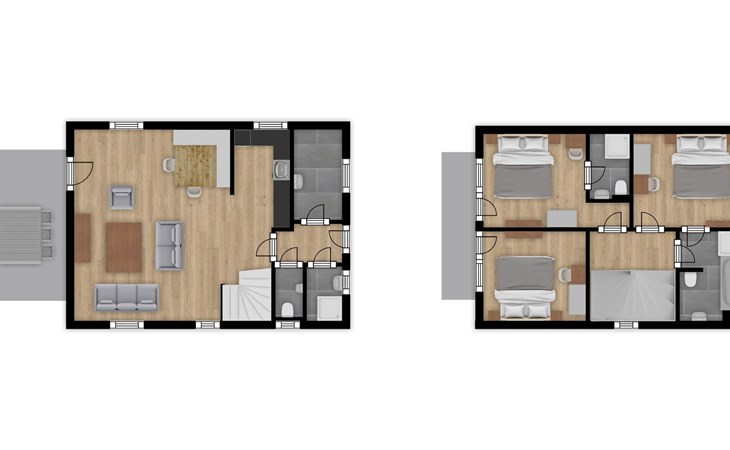 Das Chalet verfügt in der ersten Etage über 3 Schlafzimmer mit jeweils 2 Einzelbetten. Eines der Schlafzimmer verfügt über einen Fernseher.Dieses Chalet hat auch 3 Badezimmer, alle mit Dusche, Waschbecken und Toilette ausgestattet. In einem Badezimmer gibt es eine Badewanne. Es gibt darüber hinaus auch eine separate Toilette. Sie haben einen Balkon, der von 2 Schlafzimmern aus zugänglich ist.