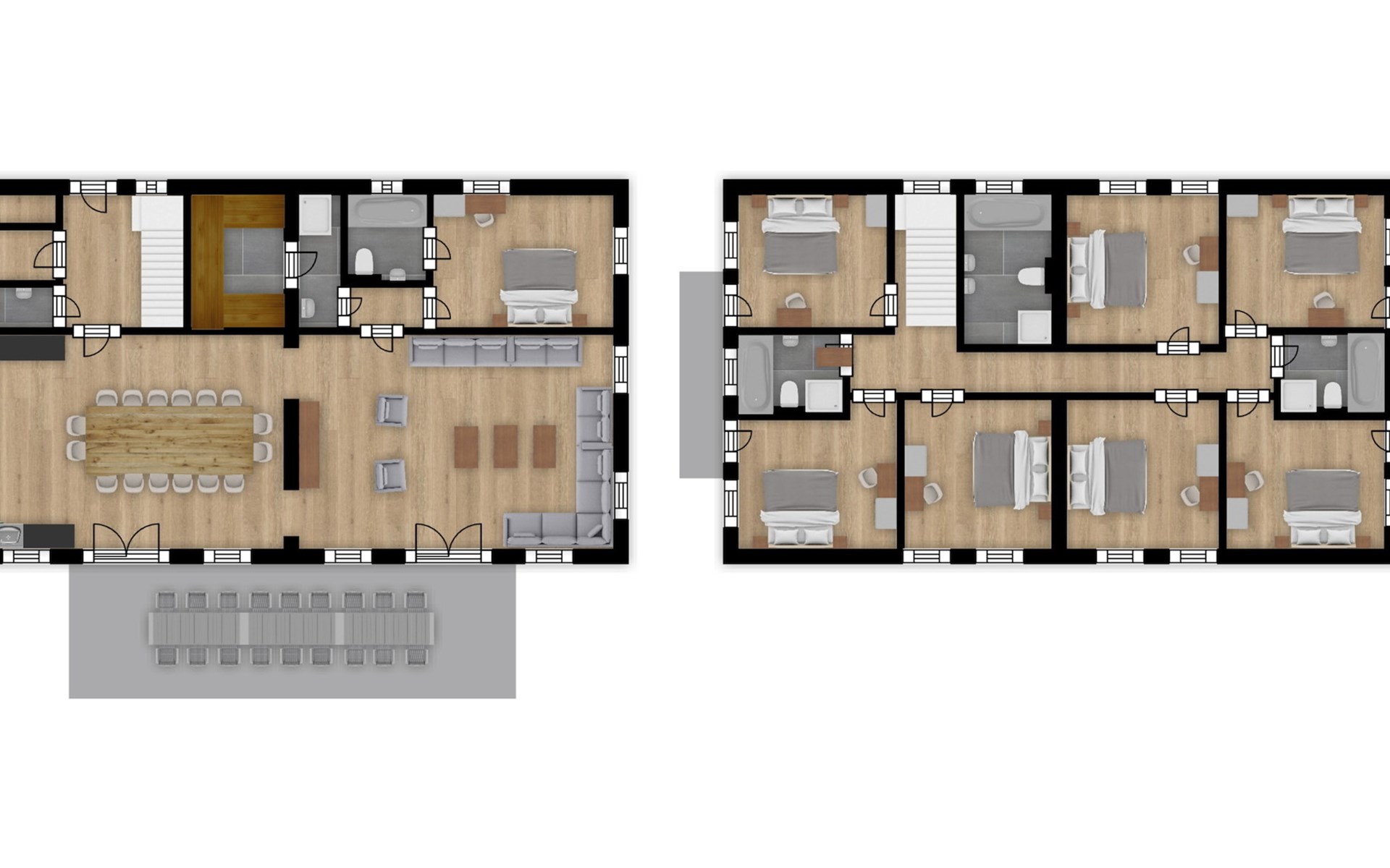 In der ersten Etage gibt es 7 Schlafzimmer, die jeweils mit 2 Einzelbetten ausgestattet sind. Es gibt 3 Badezimmer mit Badewanne, Dusche, Waschbecken und Toilette. Auf beiden Seiten des Hauses gibt es einen Balkon, auf dem man draußen sitzen kann.