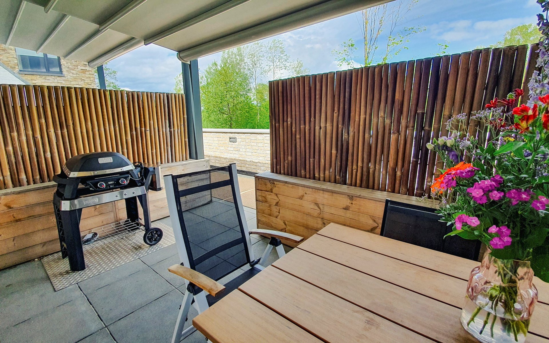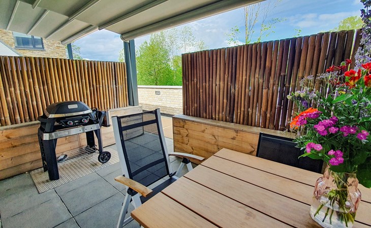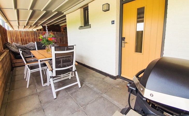 Die Ferienwohnung hat ein gemütliches Wohnzimmer und eine offene Küche mit Luxusgeräten. Auf dieser Etage gibt es auch ein Schlafzimmer mit 2 Einzelbetten. Das En-Suite Badezimmer hat eine eine Dusche und ein Waschbecken. Außerdem gibt es eine separate Toilette. Das Schlafzimmer bietet einen direkten Zugang zum überdachten Außenbereich mit Heizung und einem Elektrogrill, auf dem Sie leckere Gerichte zubereiten können.