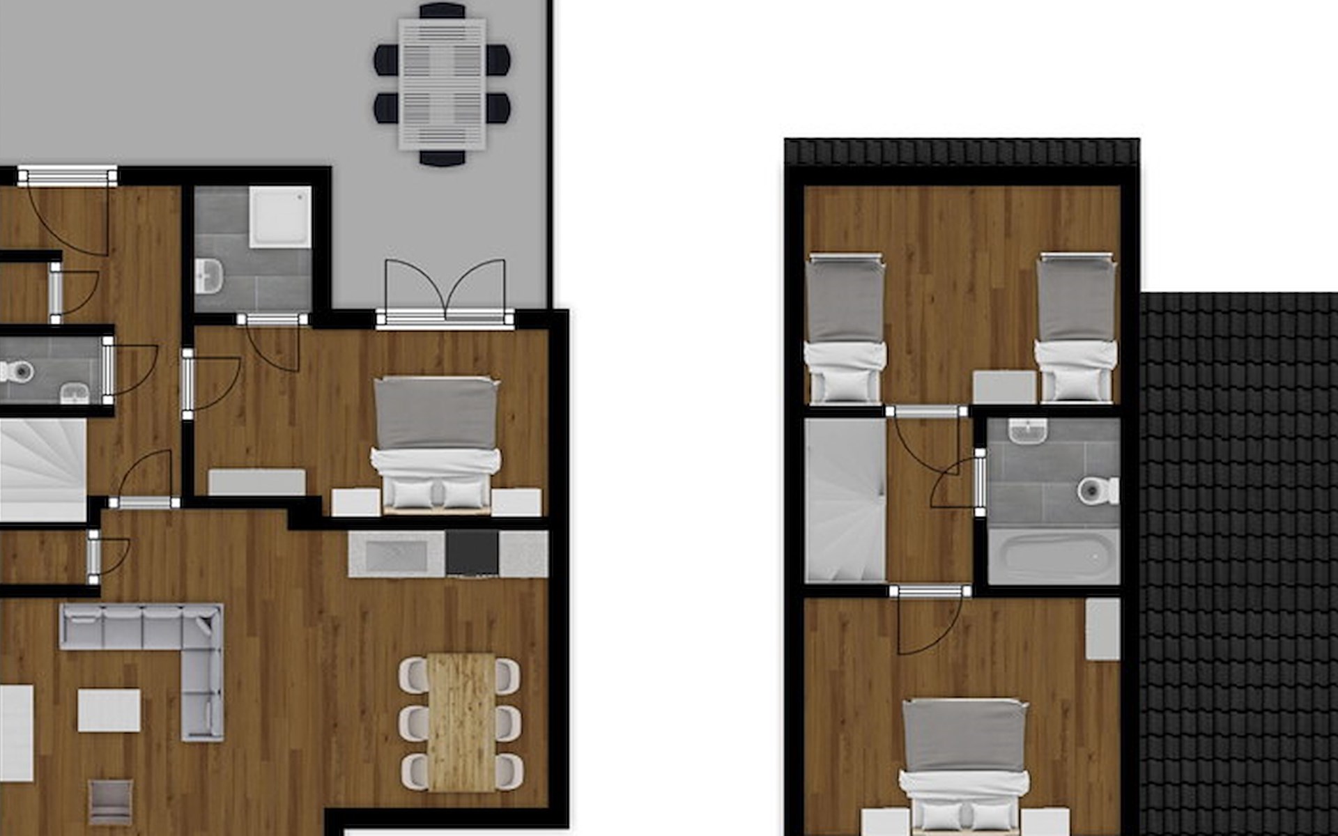 In der oberen Etage gibt es 2 Schlafzimmer. Beide Schlafzimmer haben 2 Einzelbetten. Das Badezimmer hat eine Badewanne oder eine Dusche, eine Toilette und ein Waschbecken.