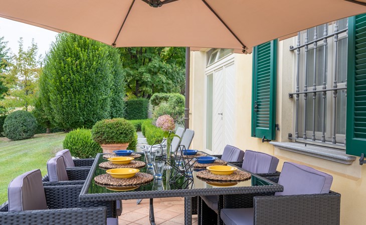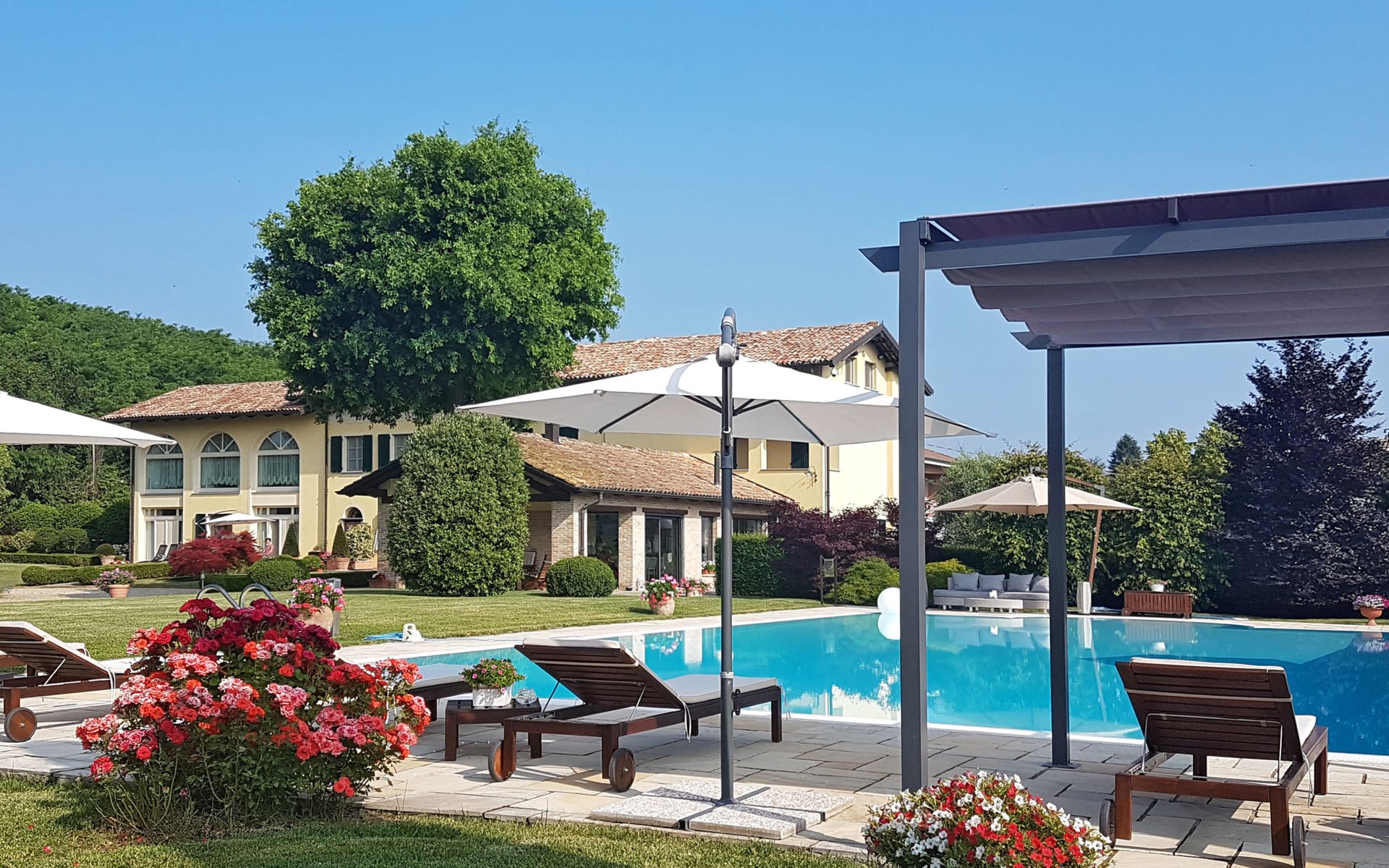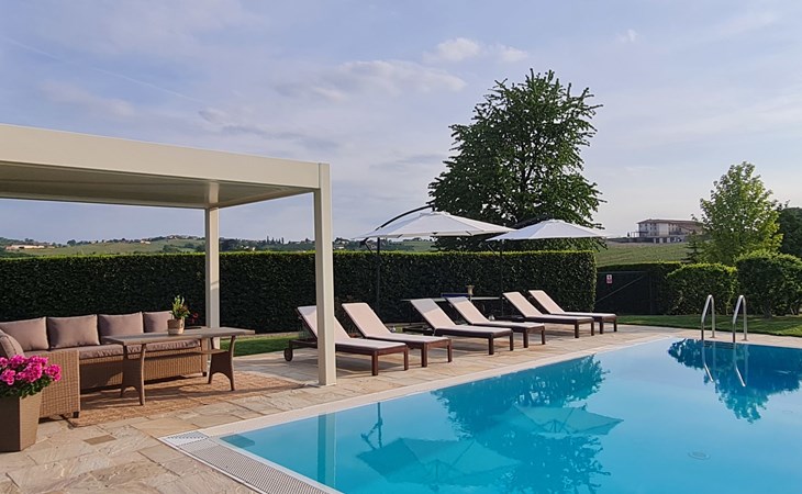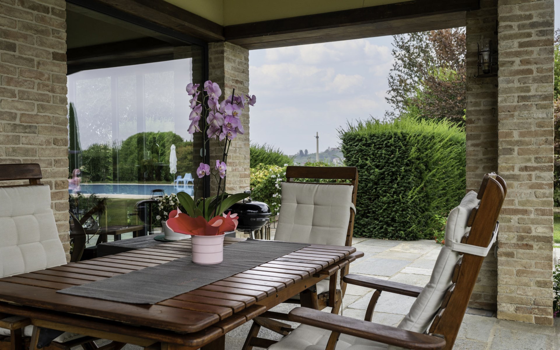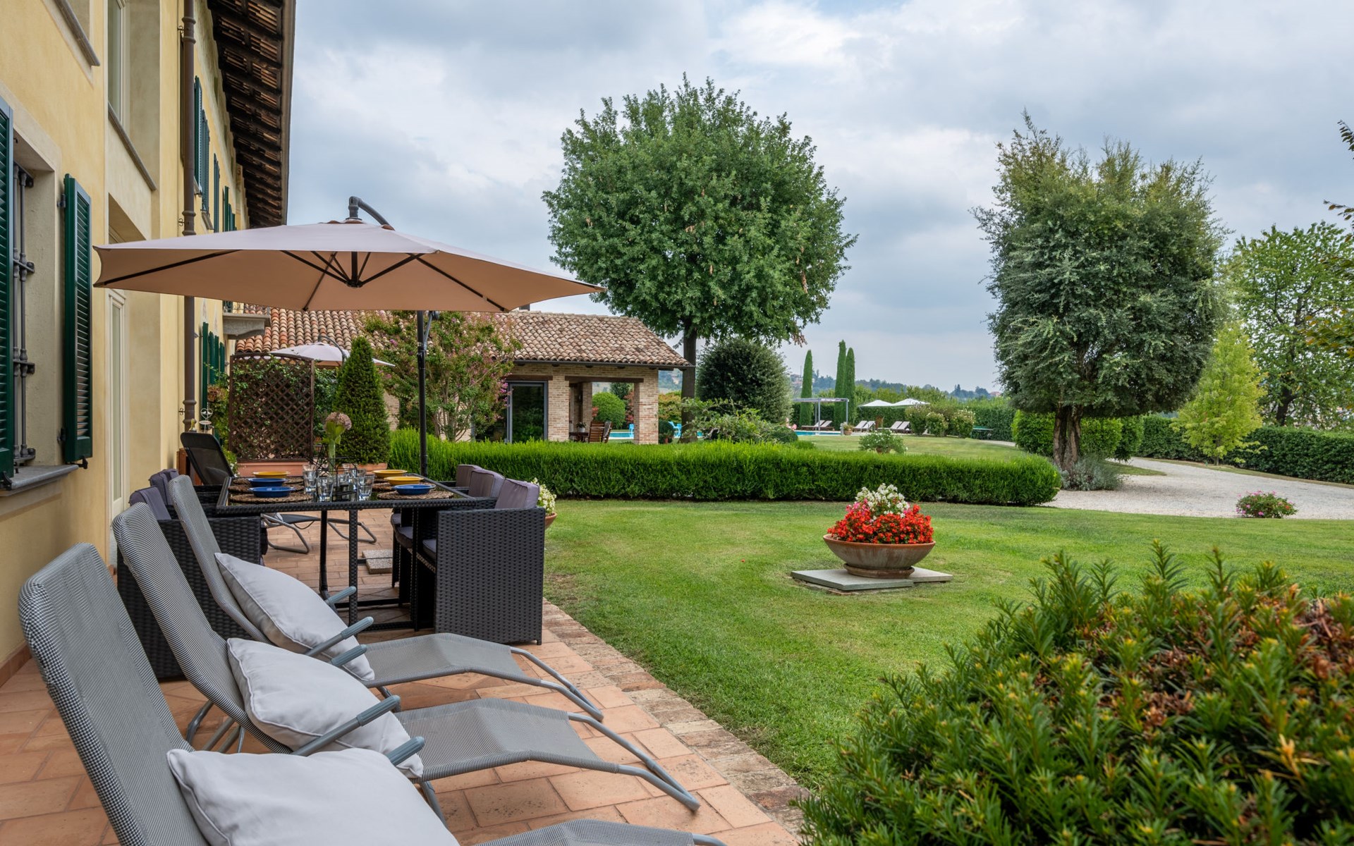 Sehr komfortables Landhaus "Villa Carlotta", auf 3 Stockwerken, einseitig angebaut. 1.4 km vom Zentrum von Costigliole d'Asti, am Ortsrand, 15 km vom Zentrum von Asti, 20 km vom Zentrum von Alba, alleinstehende, sonnige, erhöhte Lage. Zur Mitbenutzung: Grundstück 7'000 m2 (eingezäunt), gepflegter Garten mit Rasen und Bäumen. Zur Alleinbenutzung: Schwimmbad (18 x 9 m, 110 - 220 cm tief, saisonale Verfügbarkeit: 05.Apr. - 15.Okt.) mit Salzelektrolyse-Reinigungssystem. Aussendusche, Poolpflege durch den Besitzer/Gärtner. Im Hause: Fitnessraum. Parkplatz beim Haus auf dem Grundstück. Supermarkt 700 m, Bushaltestelle 3.5 km, Bahnstation "Asti" 15 km. Besitzer wohnt in separatem Hausteil.