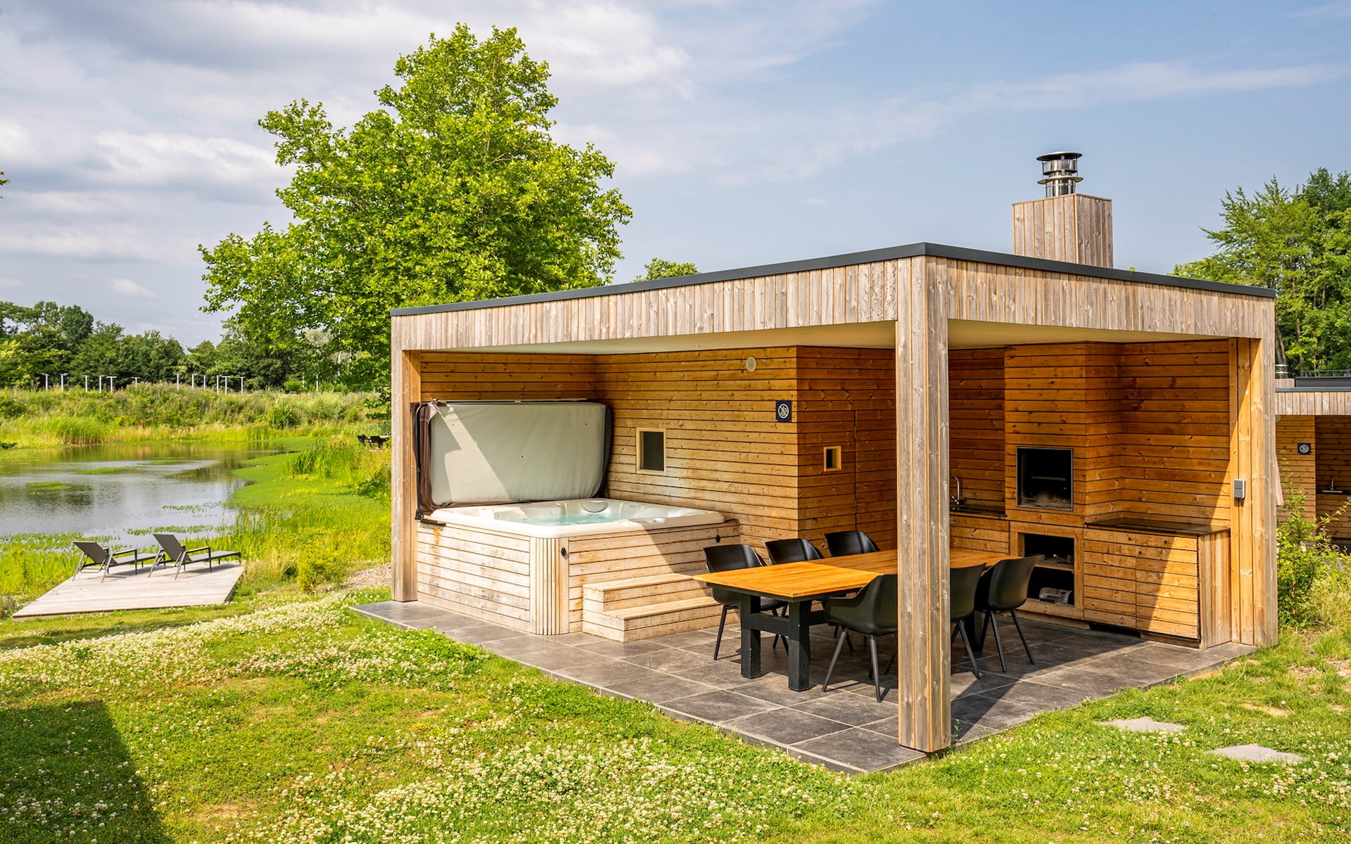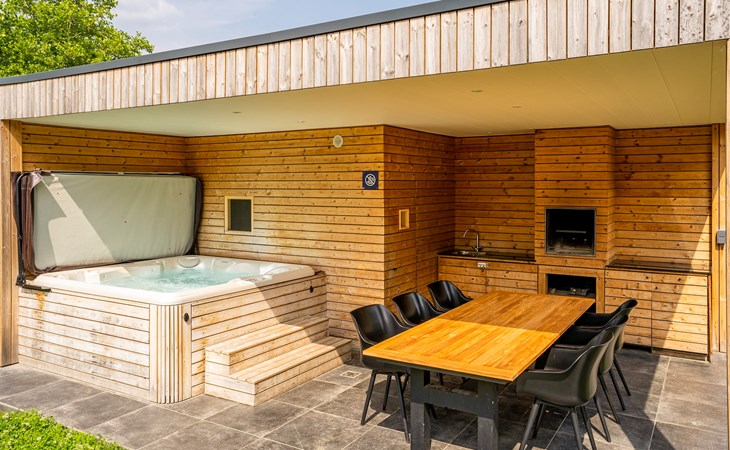 Vom Wohnzimmer aus erreichen Sie über die französischen Gartentüren die möblierte Terrasse mit lauschigem Außenkamin. Der große Garten verfügt außerdem über einen eigenen Außen-Wellnessbereich mit Jacuzzi, Sauna und Außendusche, wo Sie sich in einer prächtigen Umgebung herrlich entspannen können. In der überdachten Außenküche mit Essecke können Sie Ihre Gäste mit selbst zubereiteten Köstlichkeiten verwöhnen.
