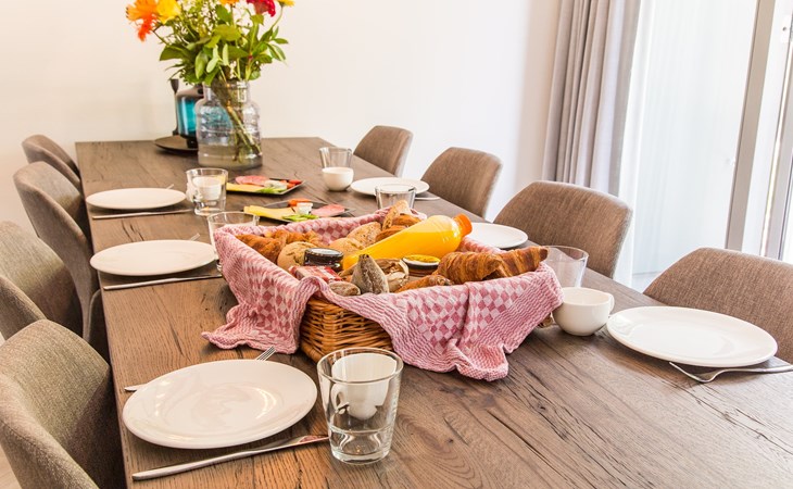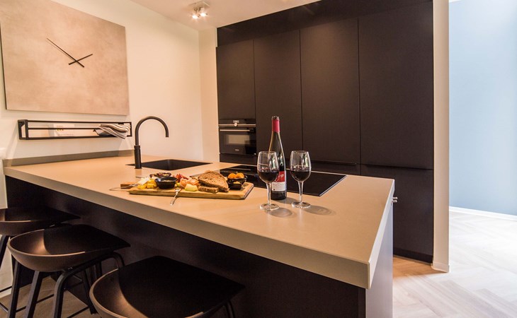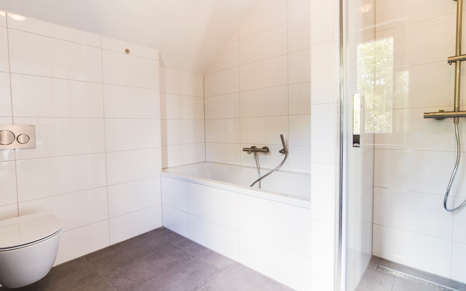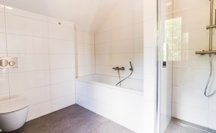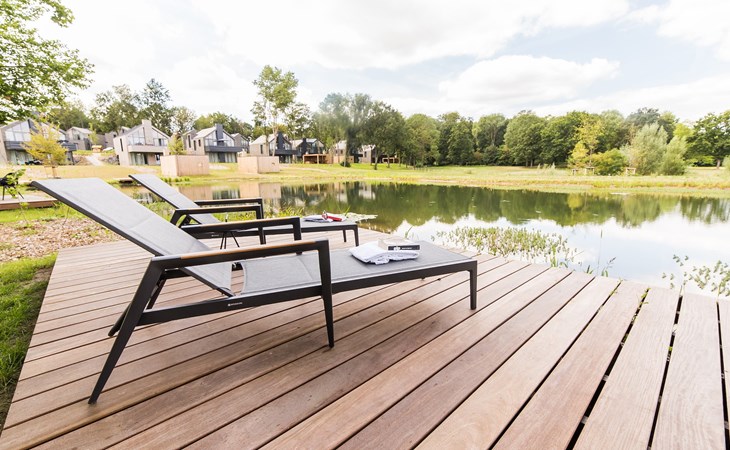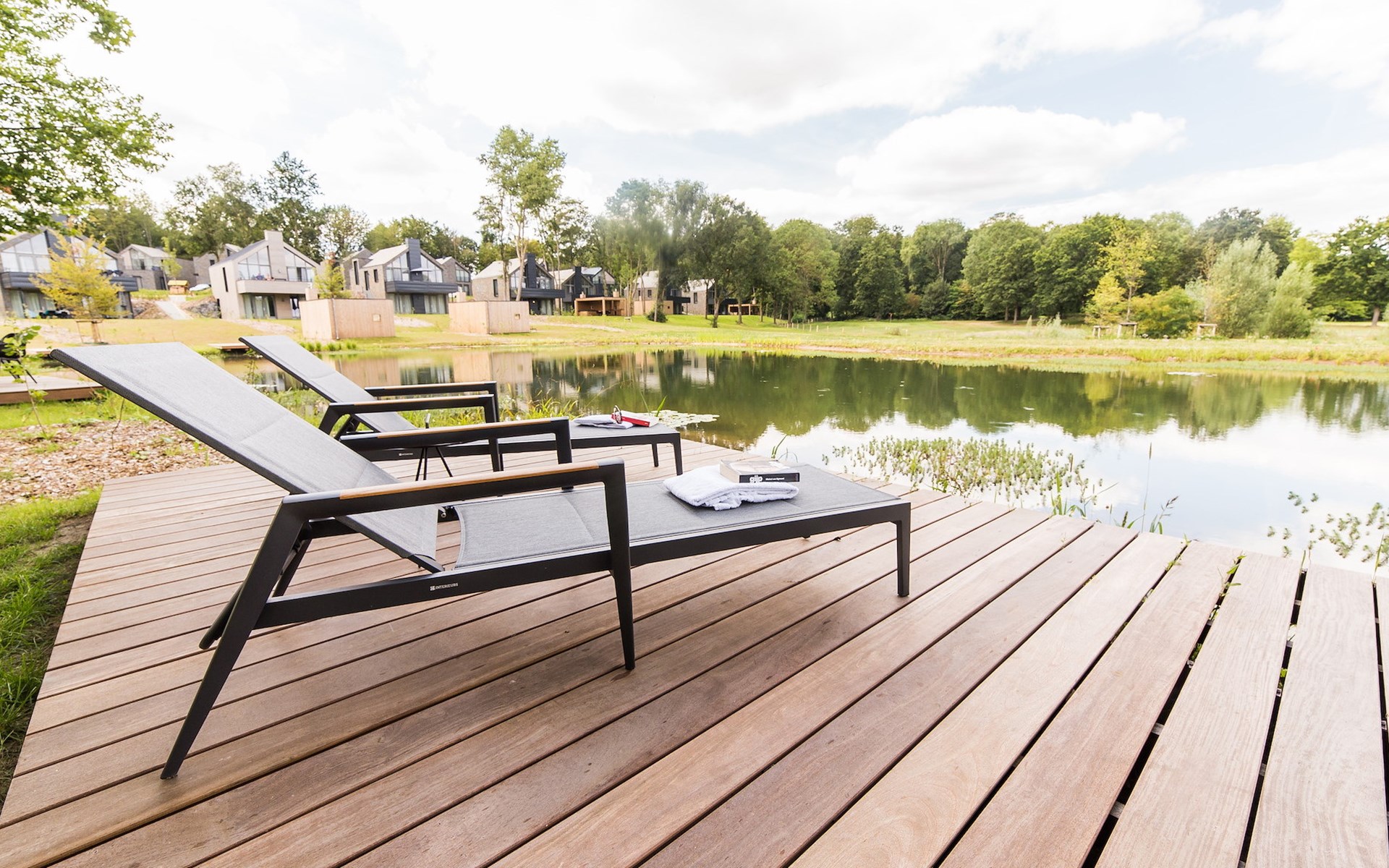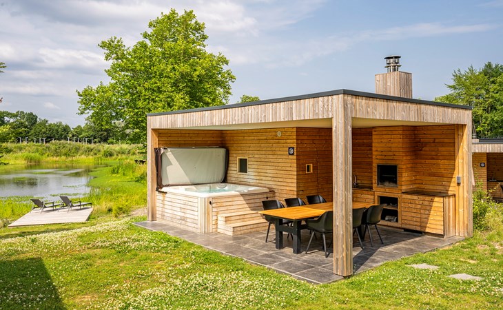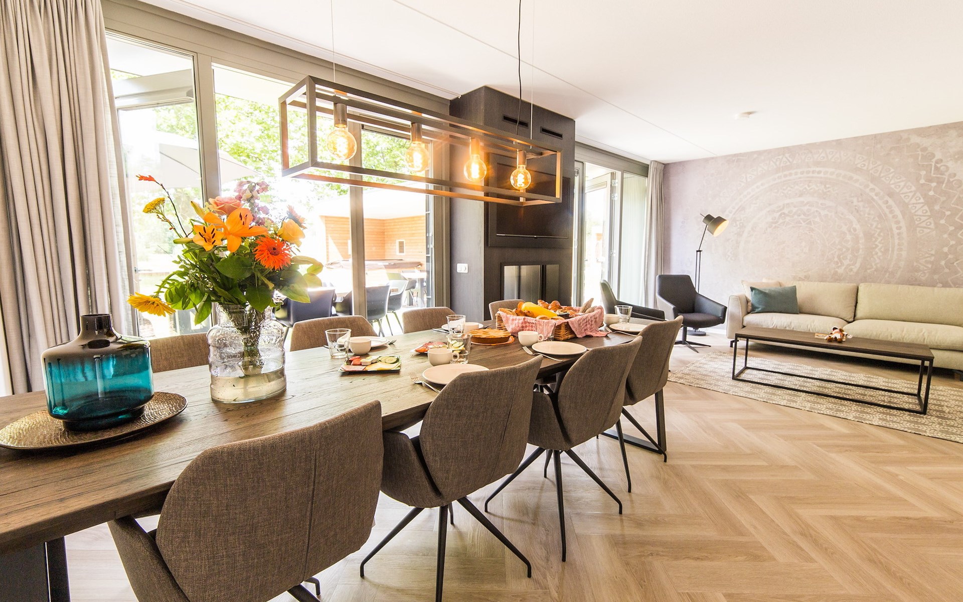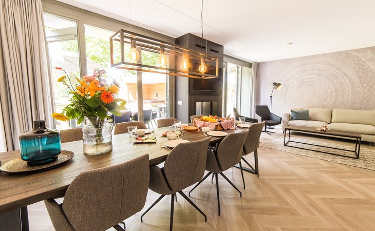 Nachdem Sie Ihr Auto auf einem der zwei Parkplätze neben der Villa geparkt haben, gelangen Sie durch den Eingang in das großzügige Wohnzimmer. Das Wohnzimmer verfügt über eine stimmungsvolle Sitzecke mit Fernseher und offenem Kamin. Durch die meterhohe Glasfassade an der Rückseite der Villa haben Sie innen viel Tageslicht und eine Aussicht auf das Wasser hinten der Villa. Sie verfügen über eine offene Luxusküche mit Kochinsel und Essecke. Küchengeräte, darunter ein Geschirrspüler, eine Mikrowellenofen und ein Induktionsherd, sind selbstverständlich vorhanden.