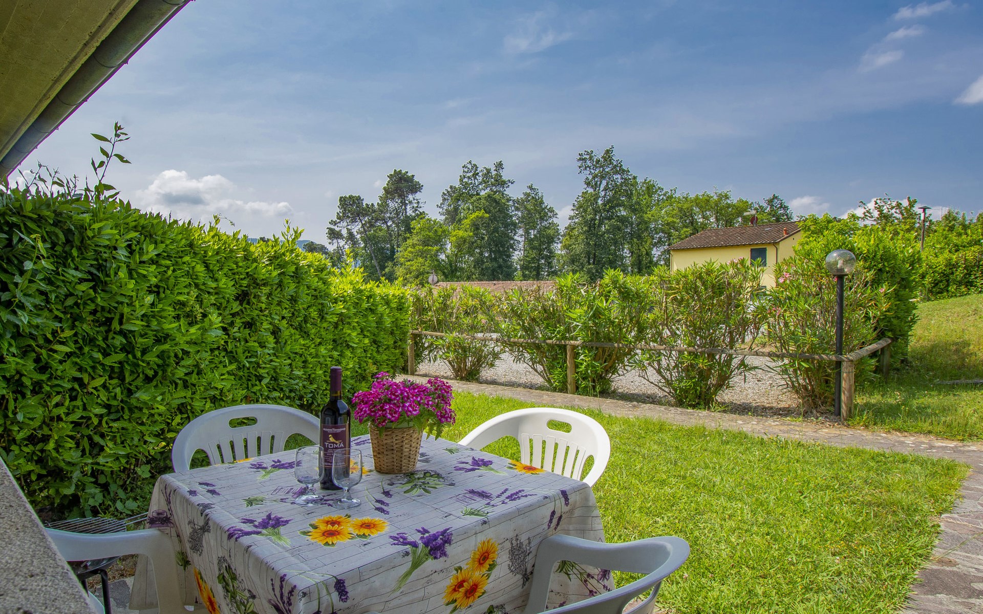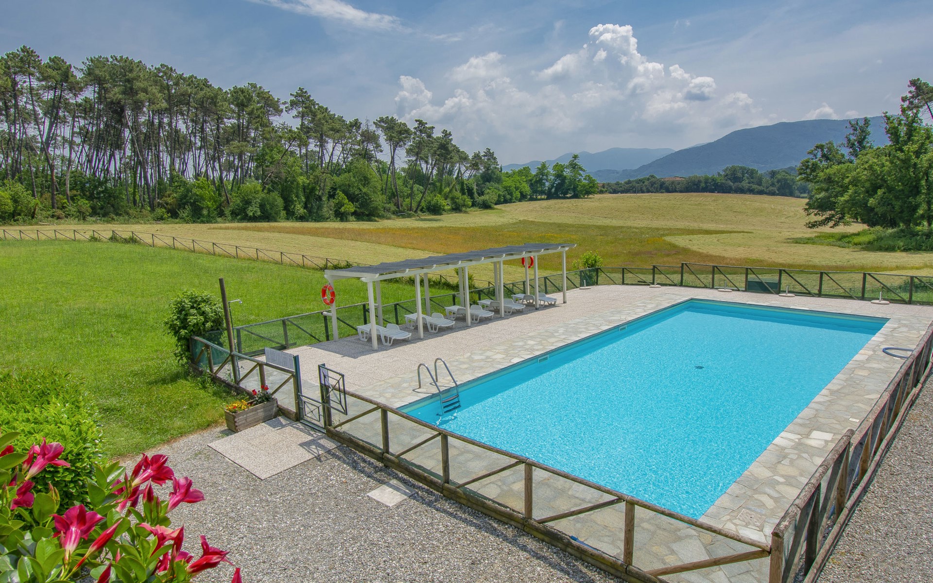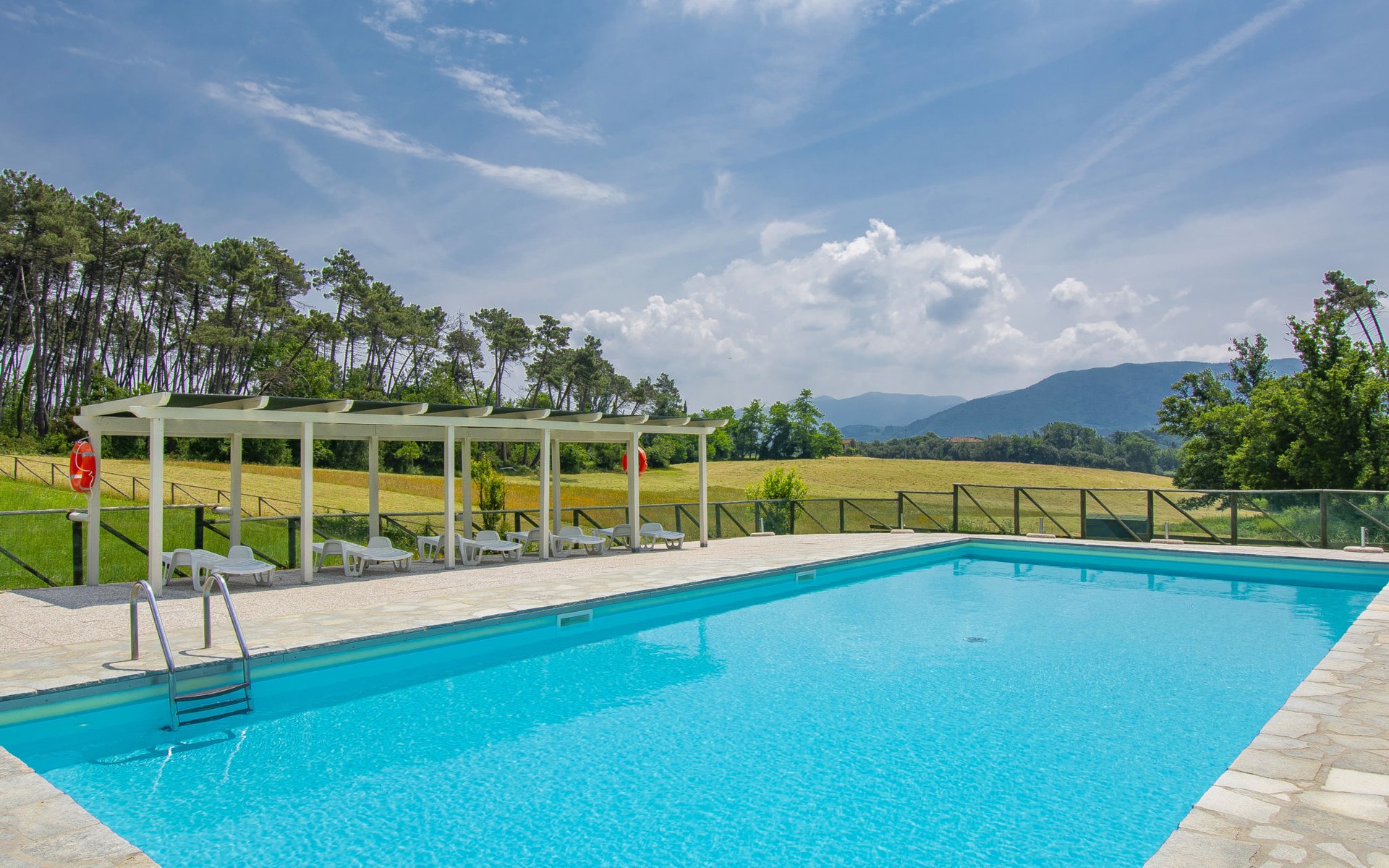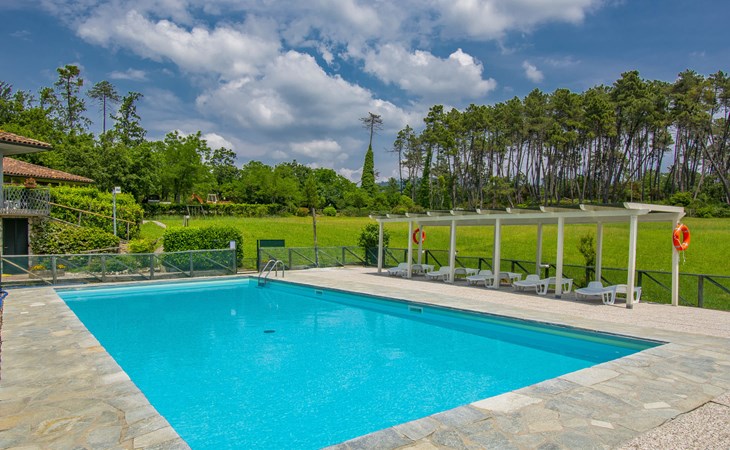 Farneta 8 km von Lucca: Kinderfreundliche, gemütliche Residenz "I Pini", umgeben von Bäumen und Wiesen. 23 Wohnungen in der Residenz. 1.5 km vom Zentrum von Farneta, am Ortsrand, 8 km vom Zentrum von Lucca, 22 km vom Zentrum von Pisa, 26 km vom Meer, im Grünen. Zur Mitbenutzung: Grundstück 20'000 m2, terrassierter Garten mit Pflanzen und Bäumen, Wiese, Schwimmbad eingezäunt (14 x 6 m, saisonale Verfügbarkeit: 15.Mai. - 30.Sep.). Aussendusche, Tischtennis, Laube, Kinderspielplatz. Zur Alleinbenutzung: Garten (nicht eingezäunt). In der Anlage: Empfang, Tischtennis, Tischfussball, Alarmanlage, Waschmaschine (zur Mitbenutzung, extra). Parkplatz auf dem Grundstück. Supermarkt 5 km, Bushaltestelle 350 m, Bahnstation "Lucca" 8.5 km, Sandstrand "Lido di Camaiore" 26 km. Golfplatz (18 Loch) 25 km. Nahe gelegene Sehenswürdigkeiten: Forte dei Marmi 42 km, Firenze 100 km. Bitte beachten: In dieser Anlage zusätzlich mietbar: 22 Häuser.