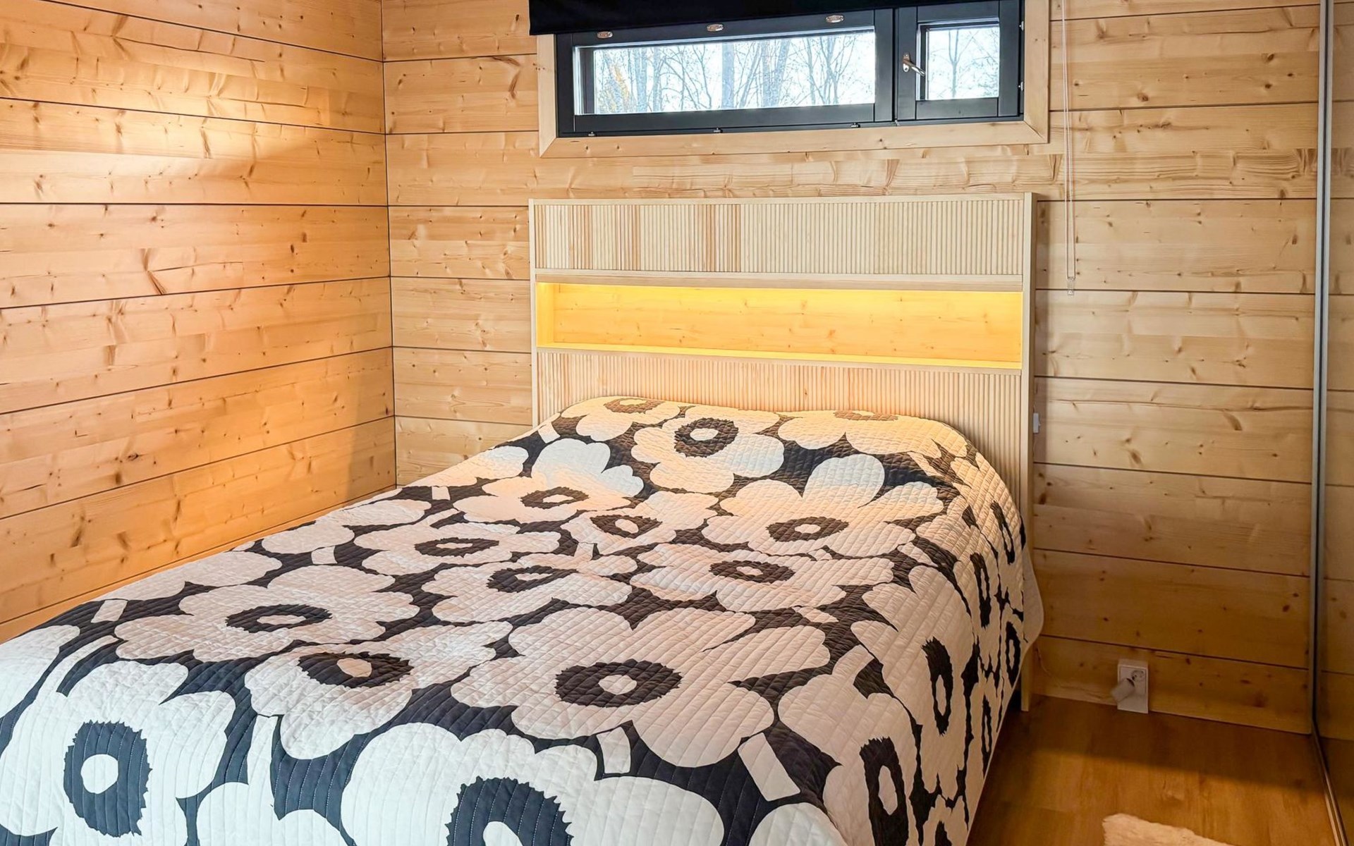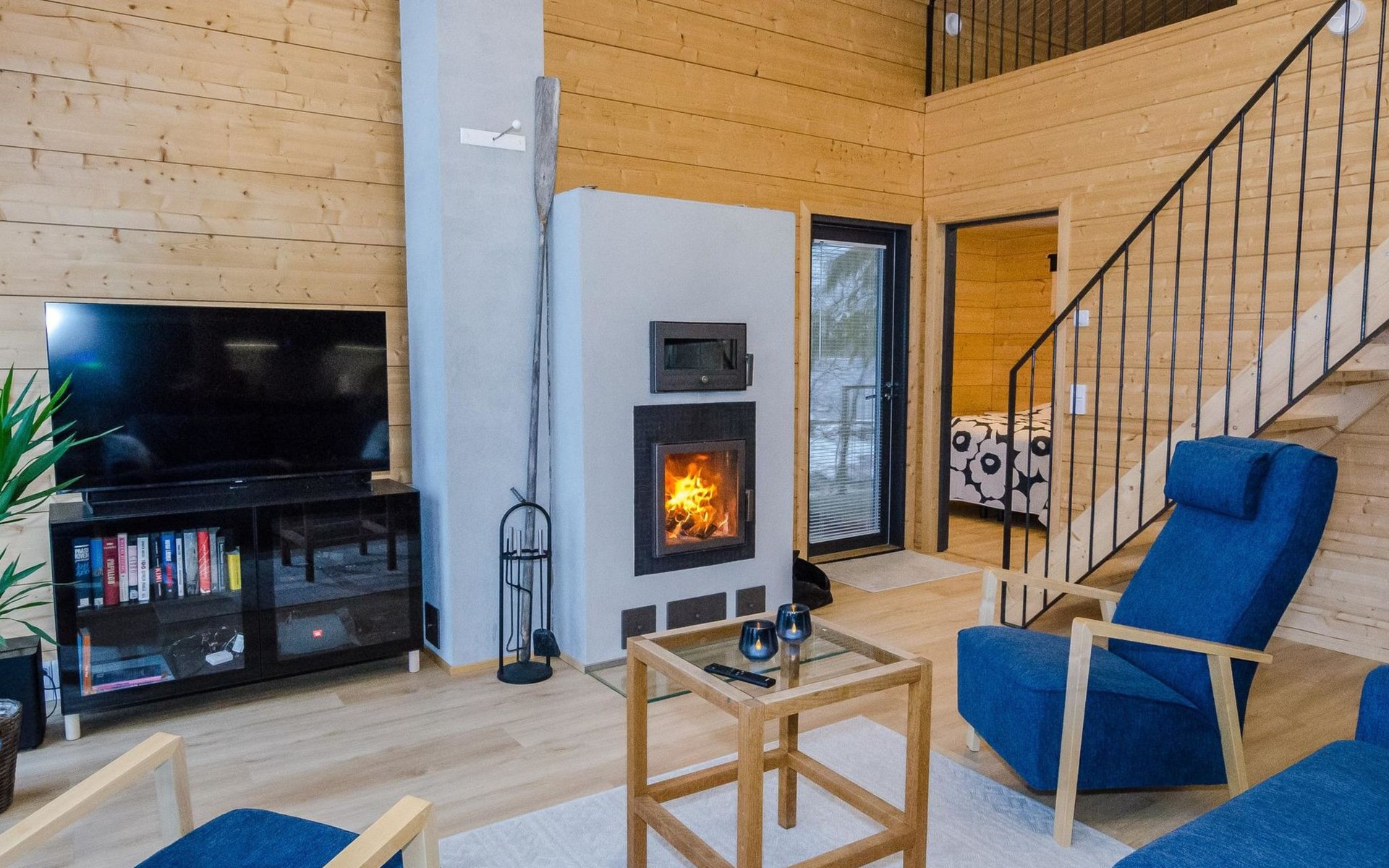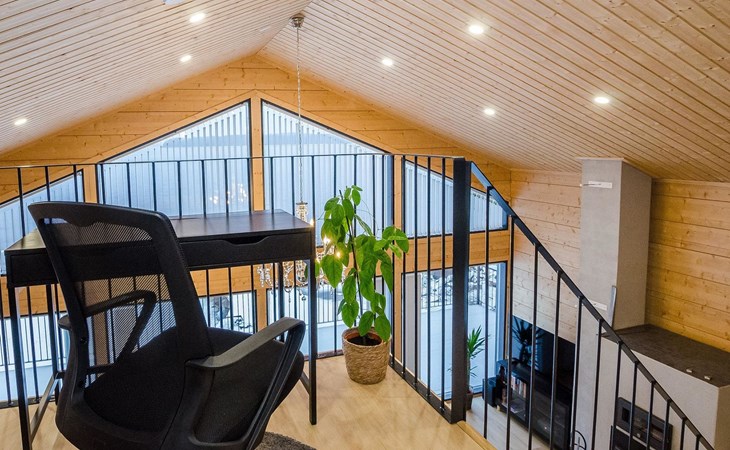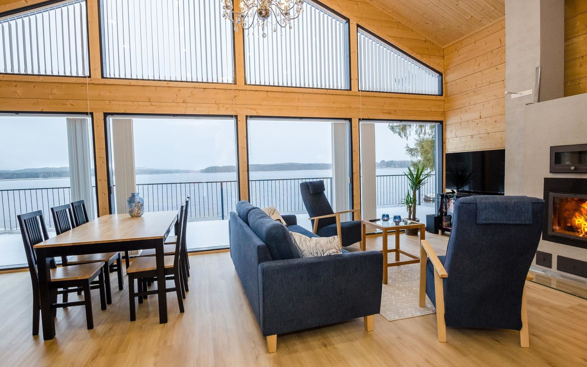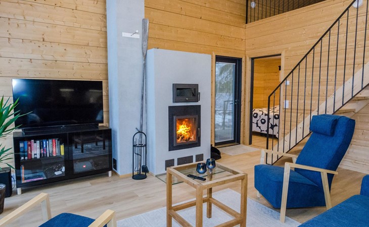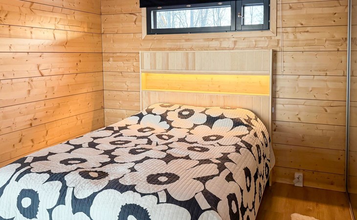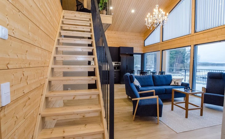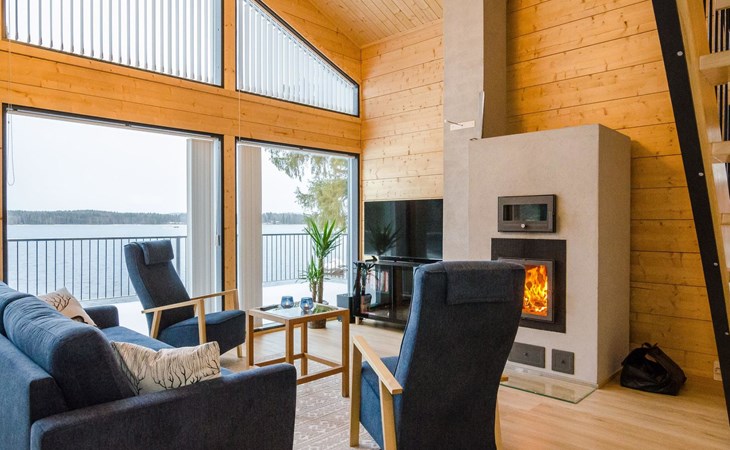Completed in 2024, this laminated log cabin features a living room/kitchen, a bedroom with a double bed, a loft with four beds, and a remote working station with a scenic view. The wood-heated sauna has a large panoramic window facing the lake. There is also a washroom with a laundry area, a separate WC, and a spacious terrace on three sides of the house with garden furniture and a gas grill available in summer.