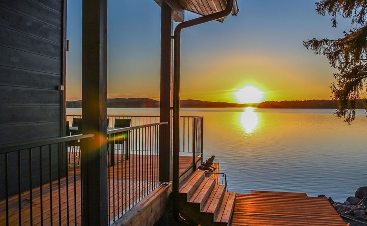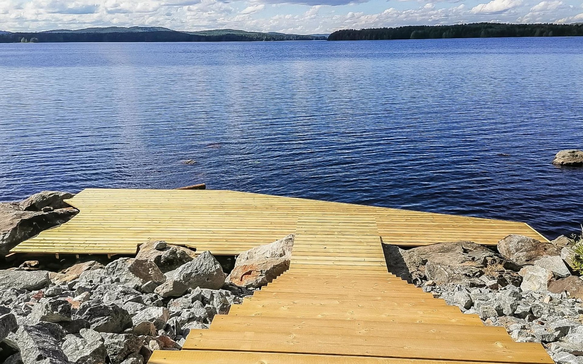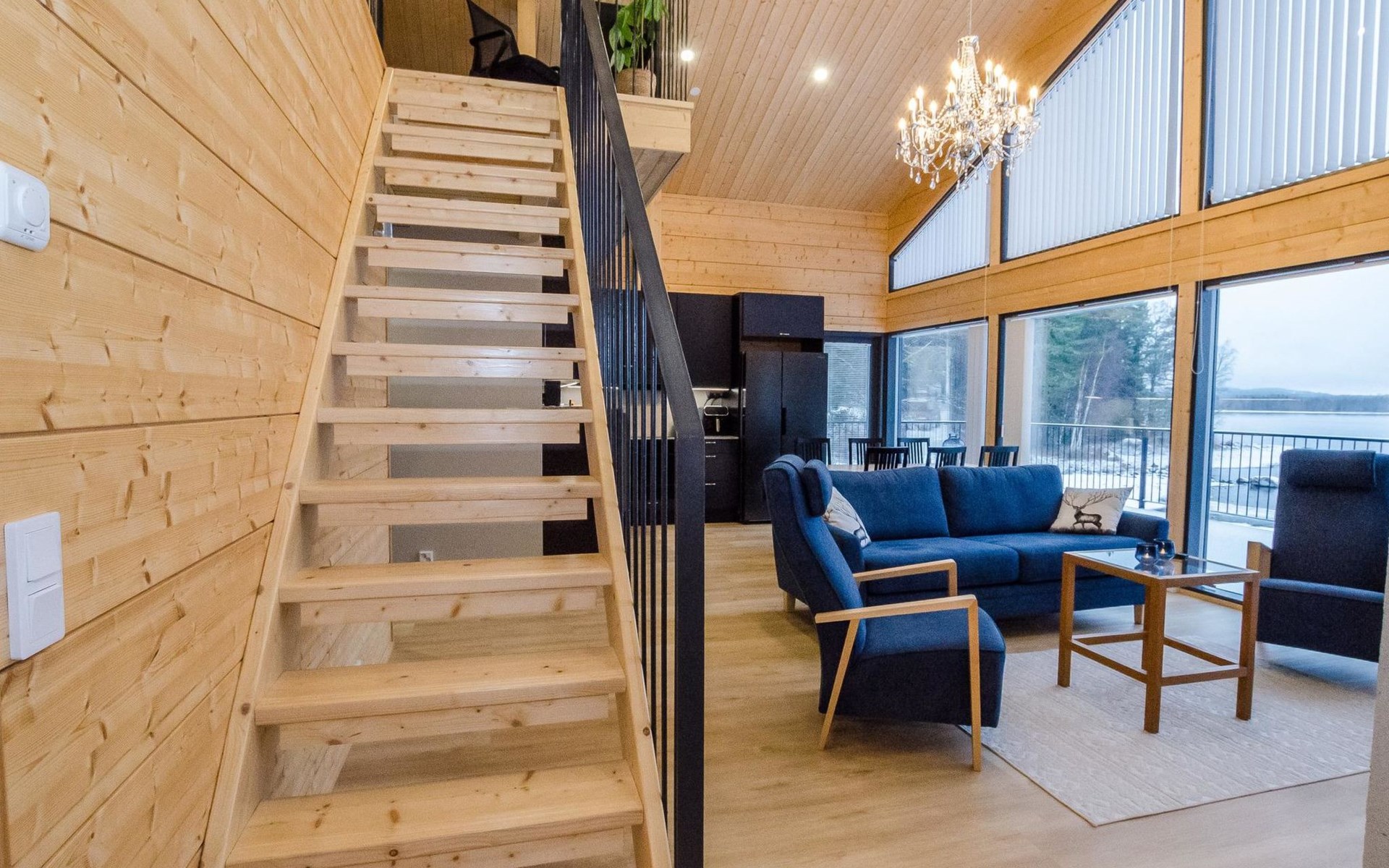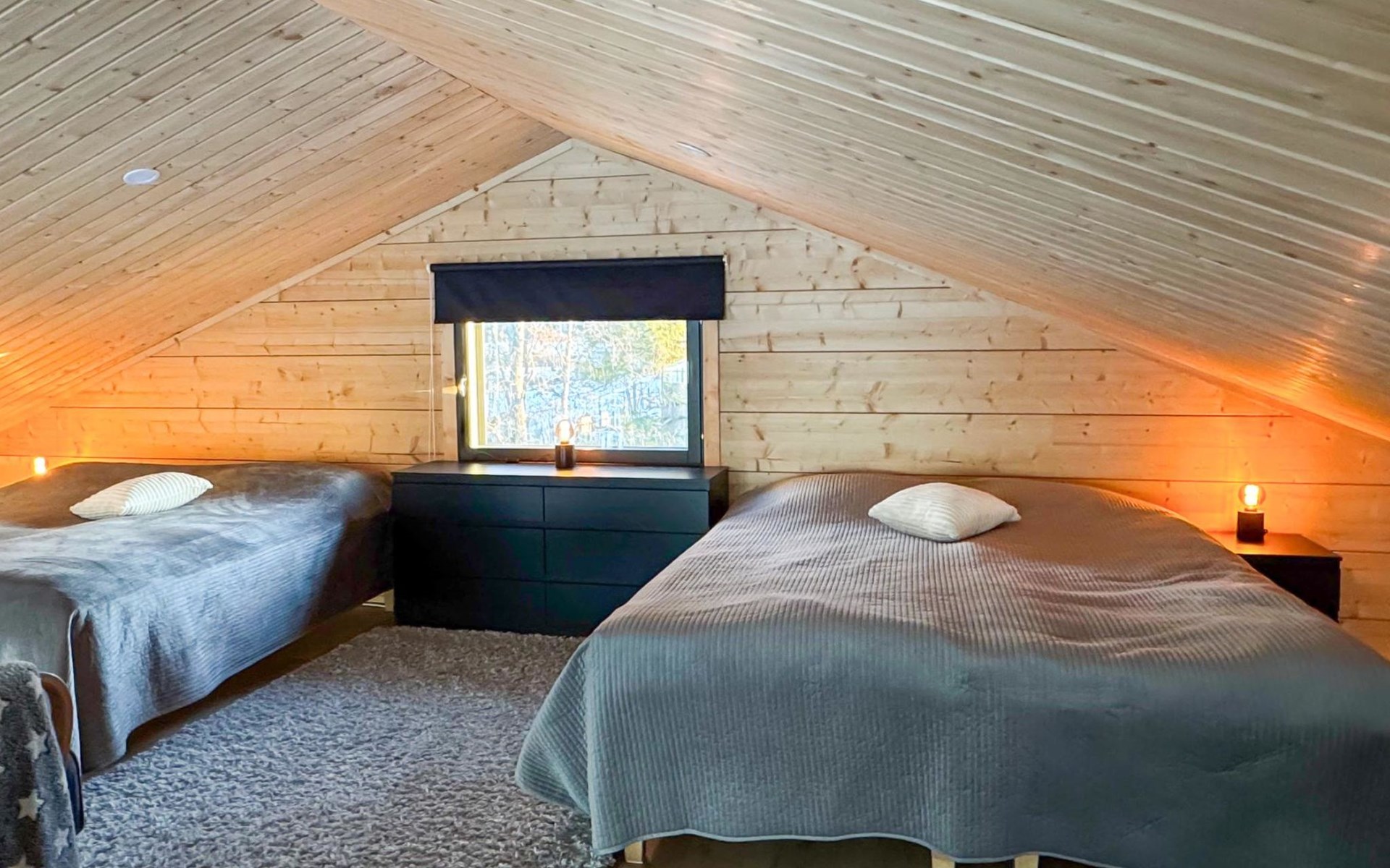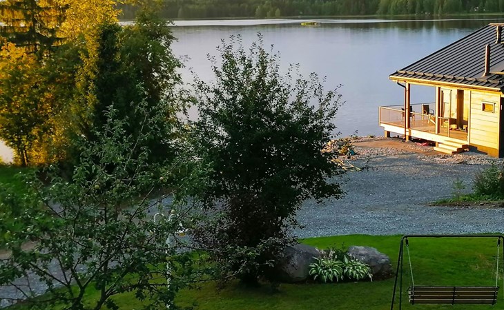 Completed in 2024, this laminated log cabin features a living room/kitchen, a bedroom with a double bed, a loft with four beds, and a remote working station with a scenic view. The wood-heated sauna has a large panoramic window facing the lake. There is also a washroom with a laundry area, a separate WC, and a spacious terrace on three sides of the house with garden furniture and a gas grill available in summer.
