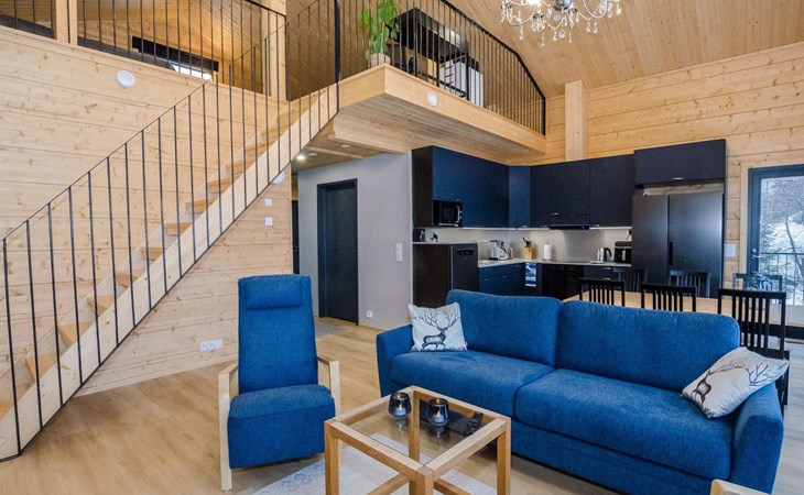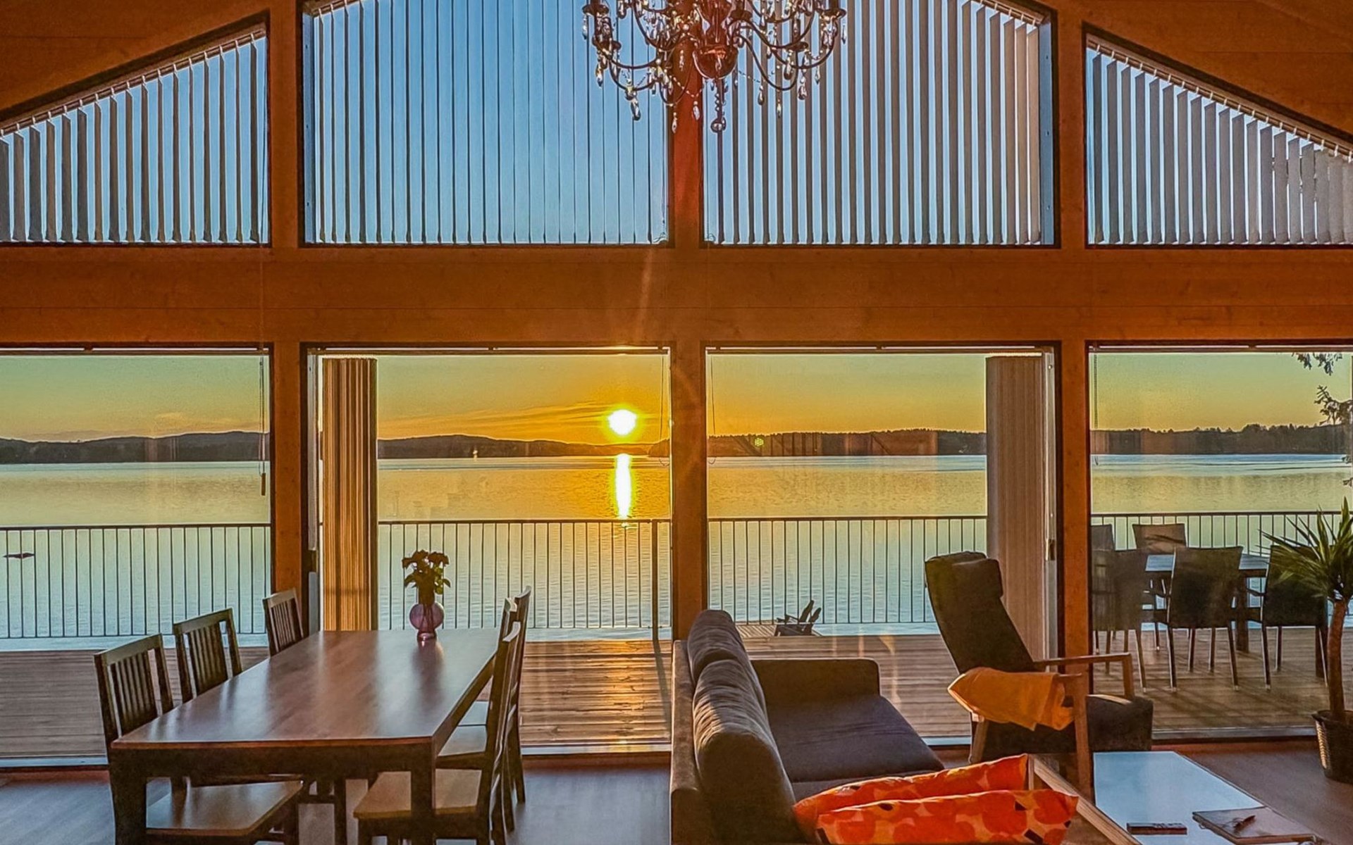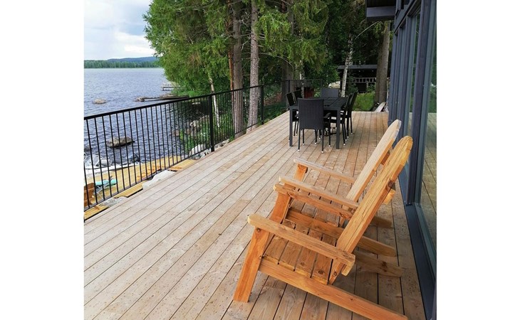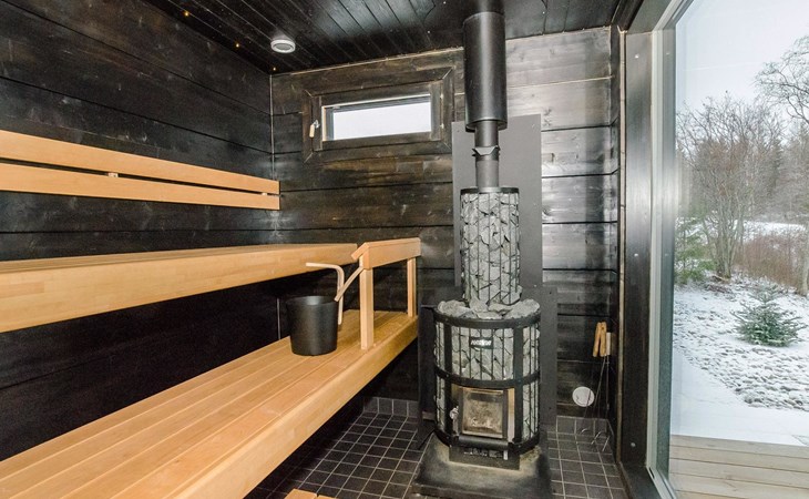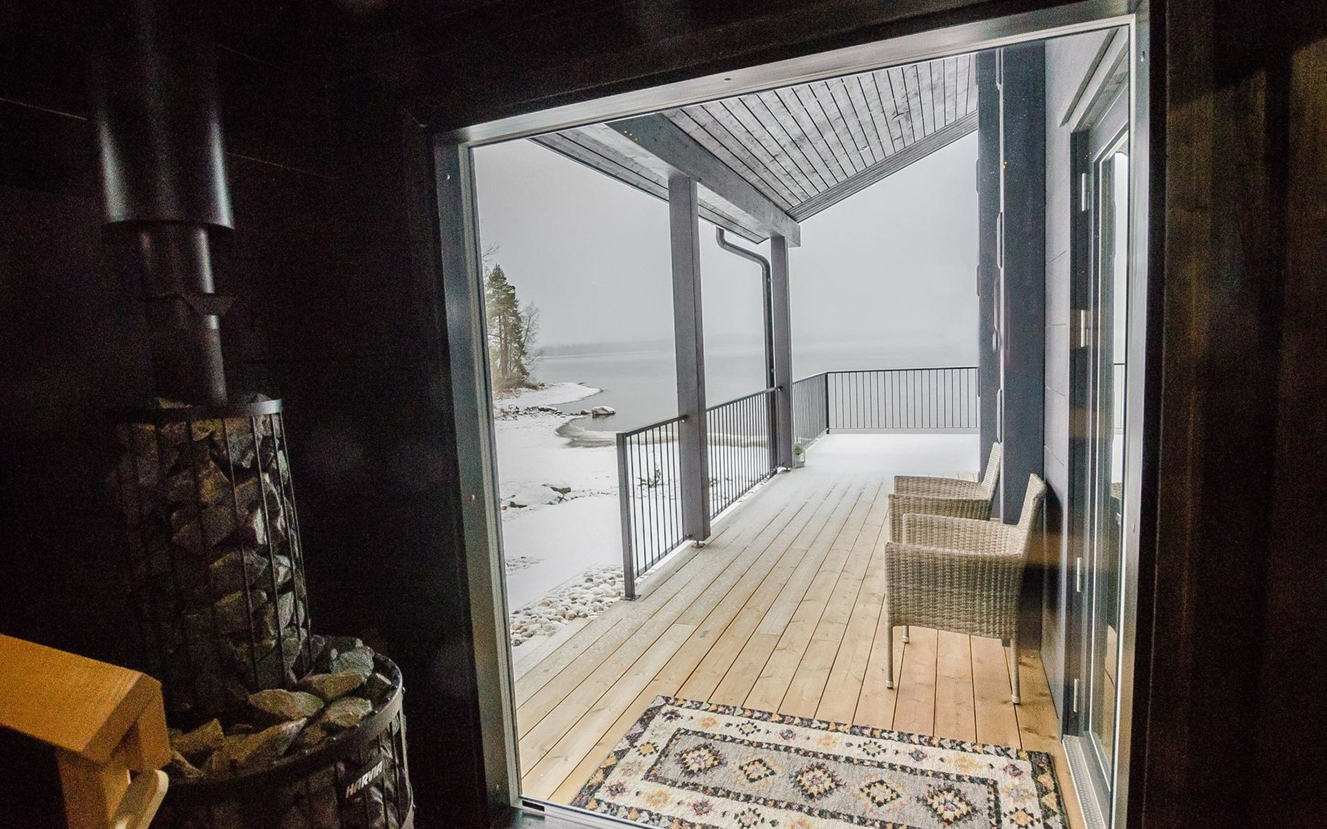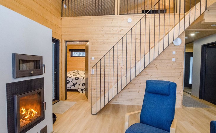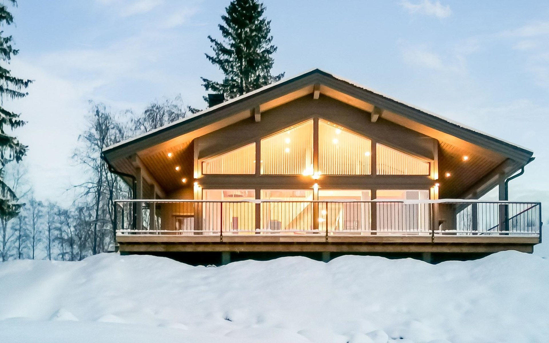 Completed in 2024, this laminated log cabin features a living room/kitchen, a bedroom with a double bed, a loft with four beds, and a remote working station with a scenic view. The wood-heated sauna has a large panoramic window facing the lake. There is also a washroom with a laundry area, a separate WC, and a spacious terrace on three sides of the house with garden furniture and a gas grill available in summer.