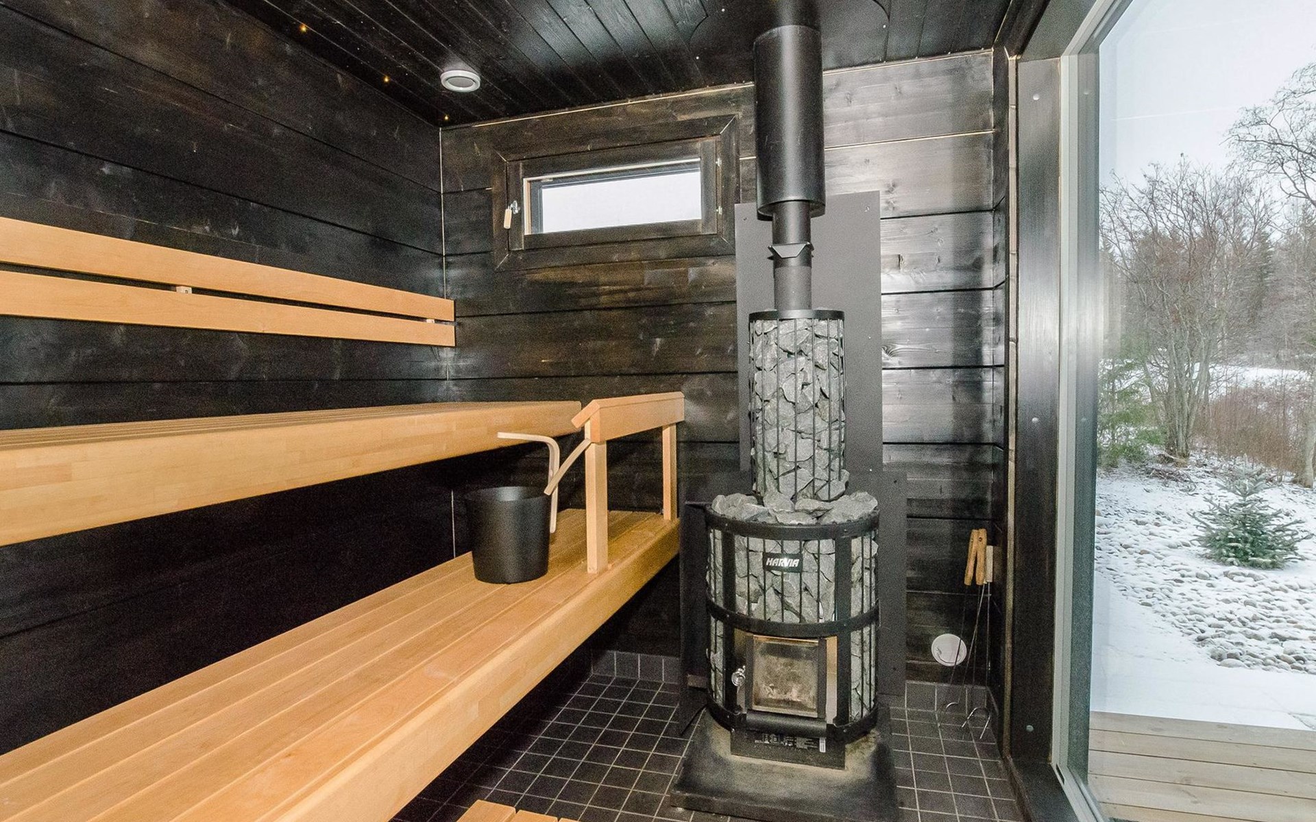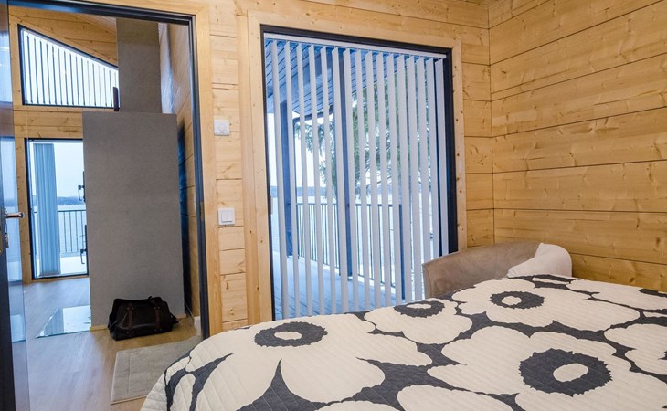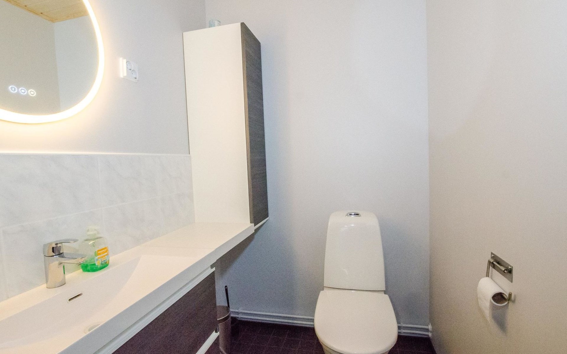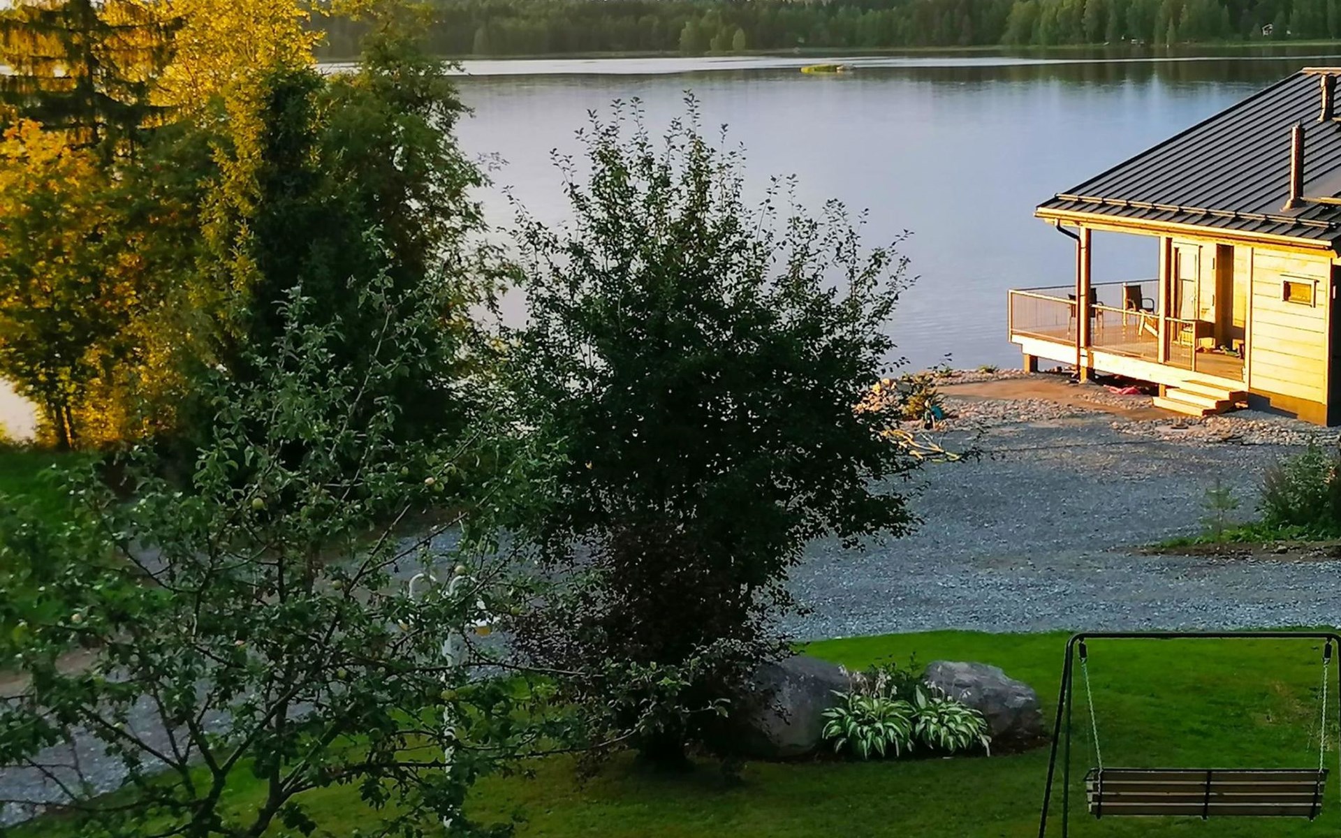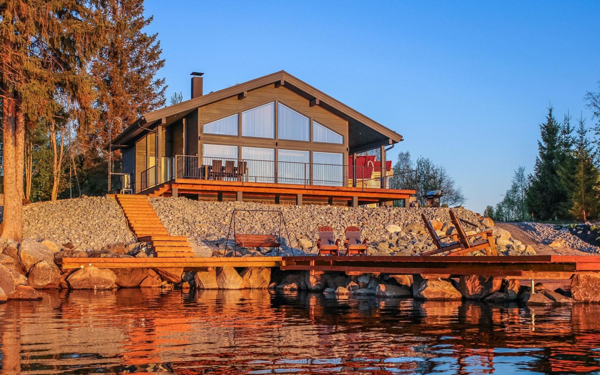 Completed in 2024, this laminated log cabin features a living room/kitchen, a bedroom with a double bed, a loft with four beds, and a remote working station with a scenic view. The wood-heated sauna has a large panoramic window facing the lake. There is also a washroom with a laundry area, a separate WC, and a spacious terrace on three sides of the house with garden furniture and a gas grill available in summer.