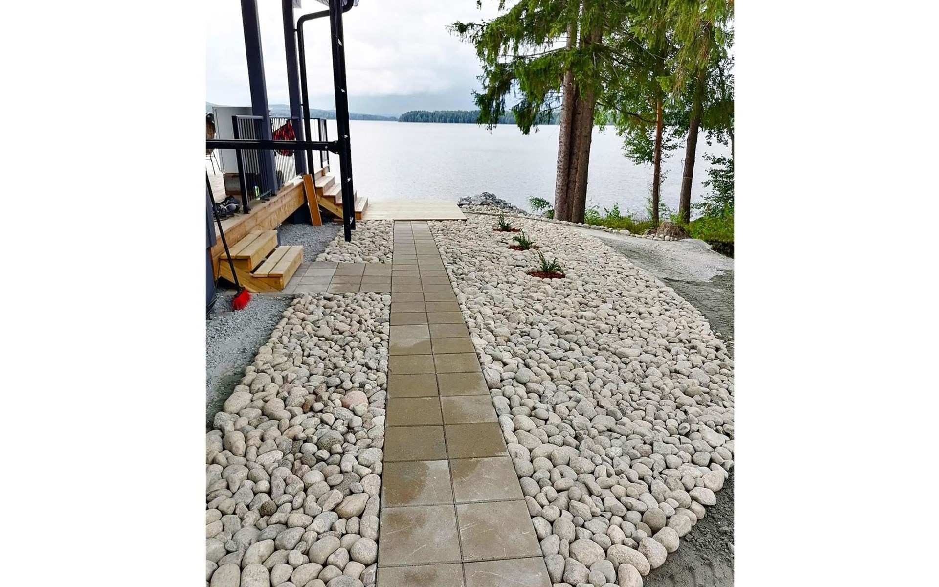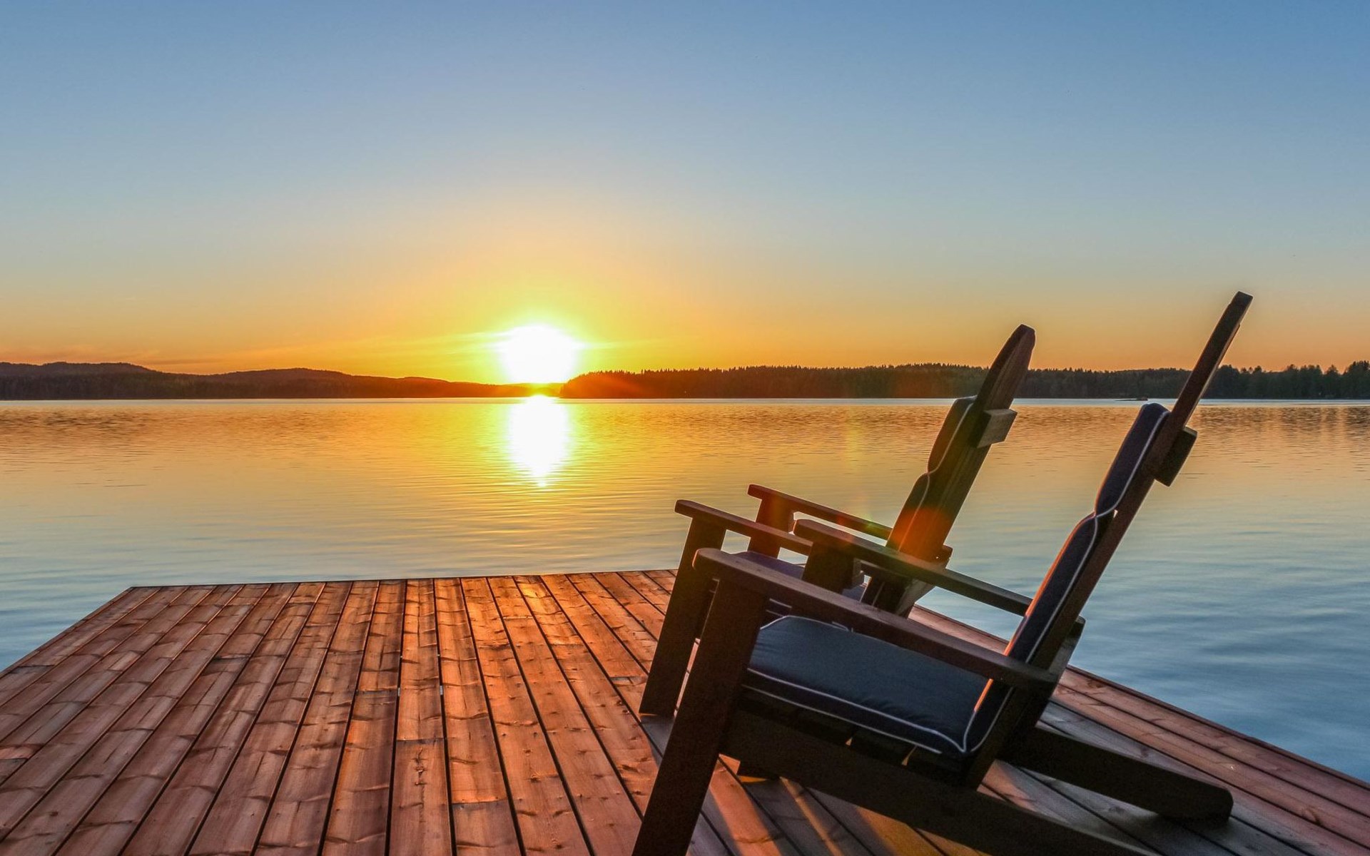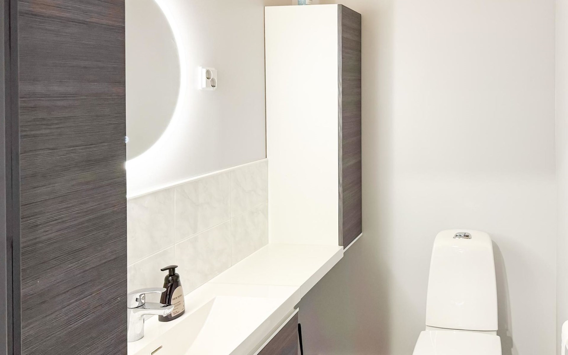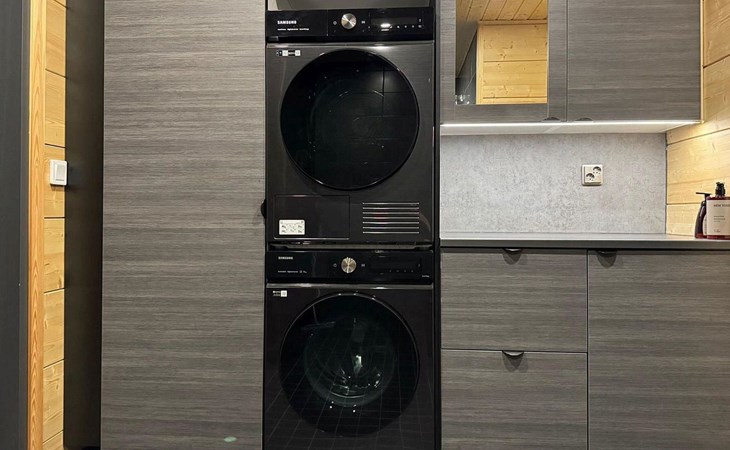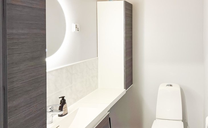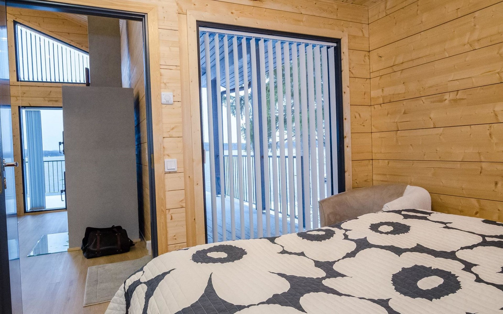 Completed in 2024, this laminated log cabin features a living room/kitchen, a bedroom with a double bed, a loft with four beds, and a remote working station with a scenic view. The wood-heated sauna has a large panoramic window facing the lake. There is also a washroom with a laundry area, a separate WC, and a spacious terrace on three sides of the house with garden furniture and a gas grill available in summer.