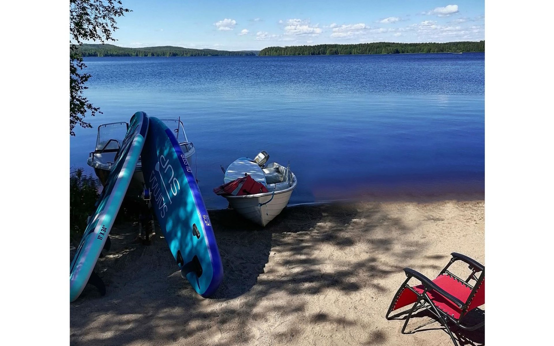 The cabin is equipped with broadband internet and a TV with a Soundbar audio system. A canoe is included in the rental, and two SUP boards are available for rent from the owner. Fishing gear is provided, including rods, ice fishing rods, and an ice drill. Bicycles are available for use during summer.