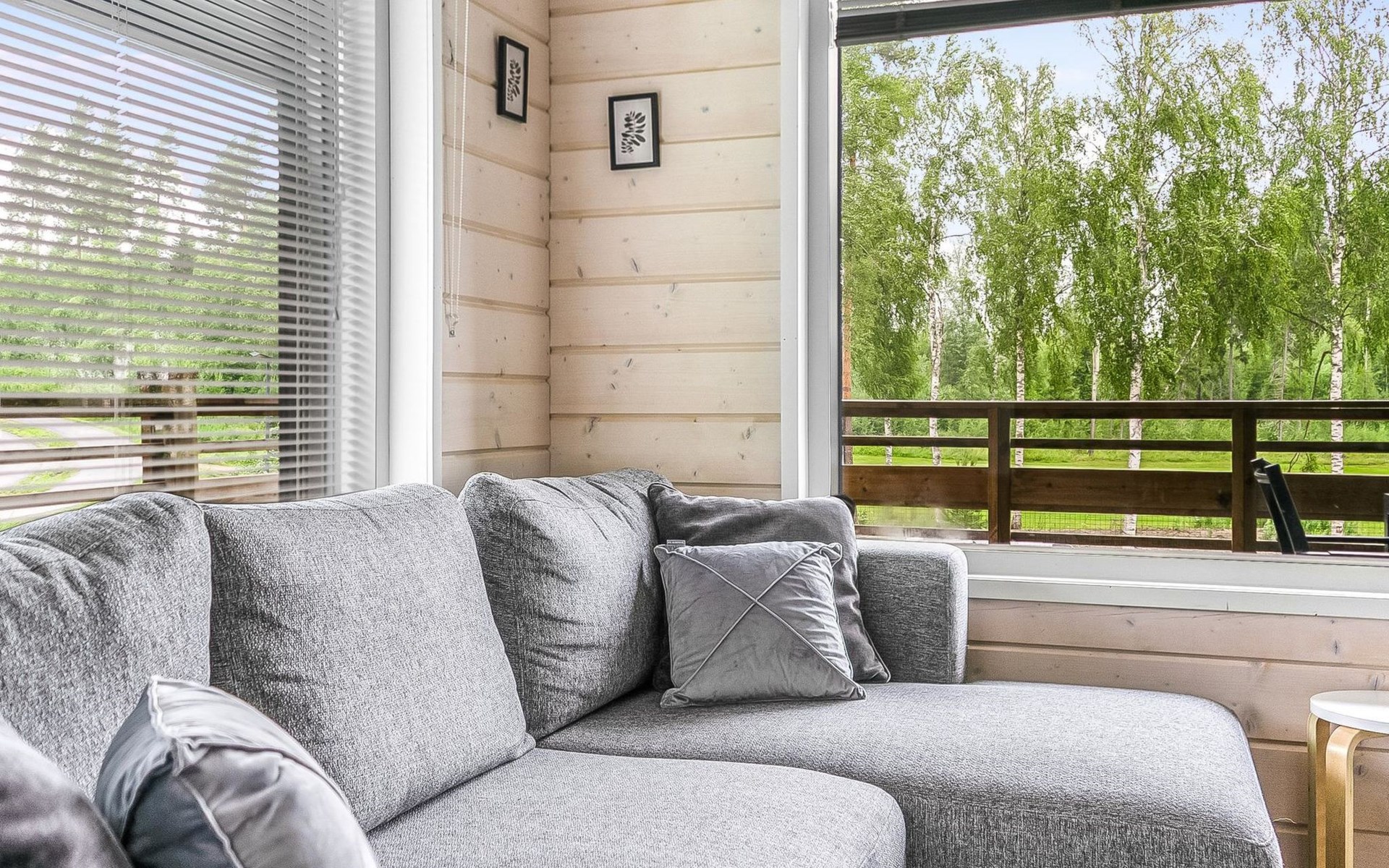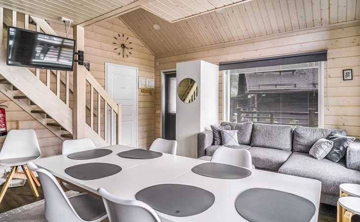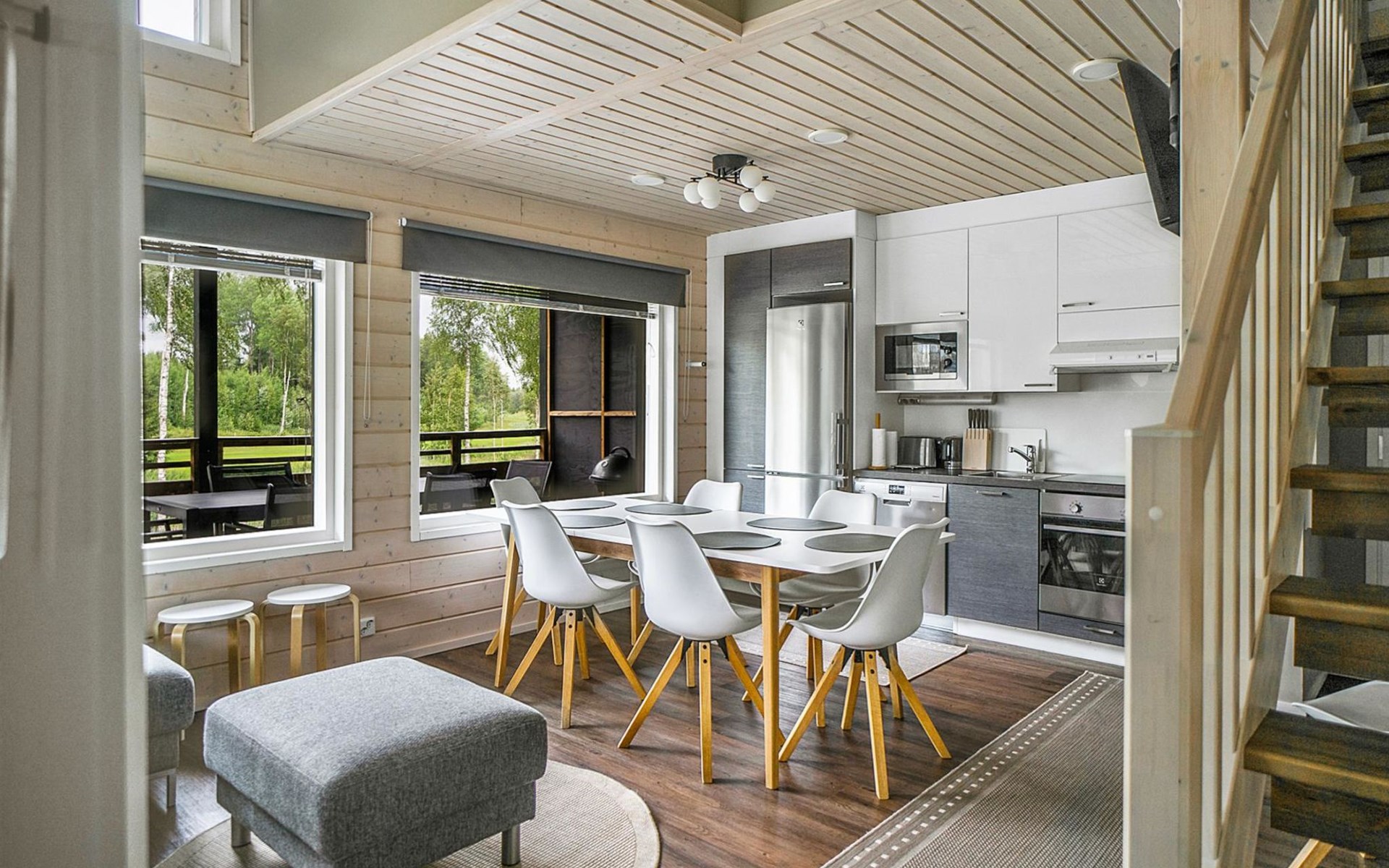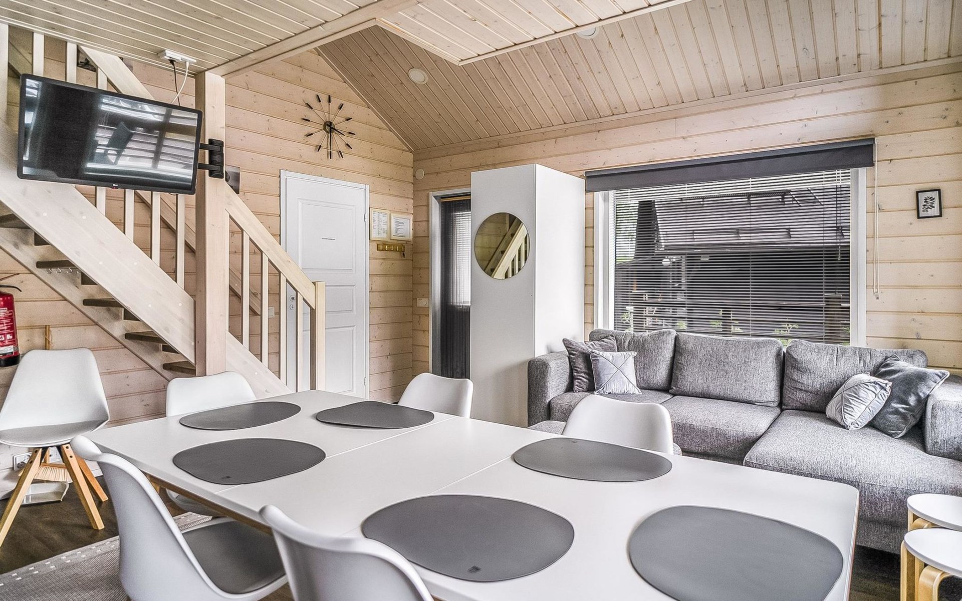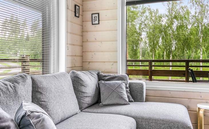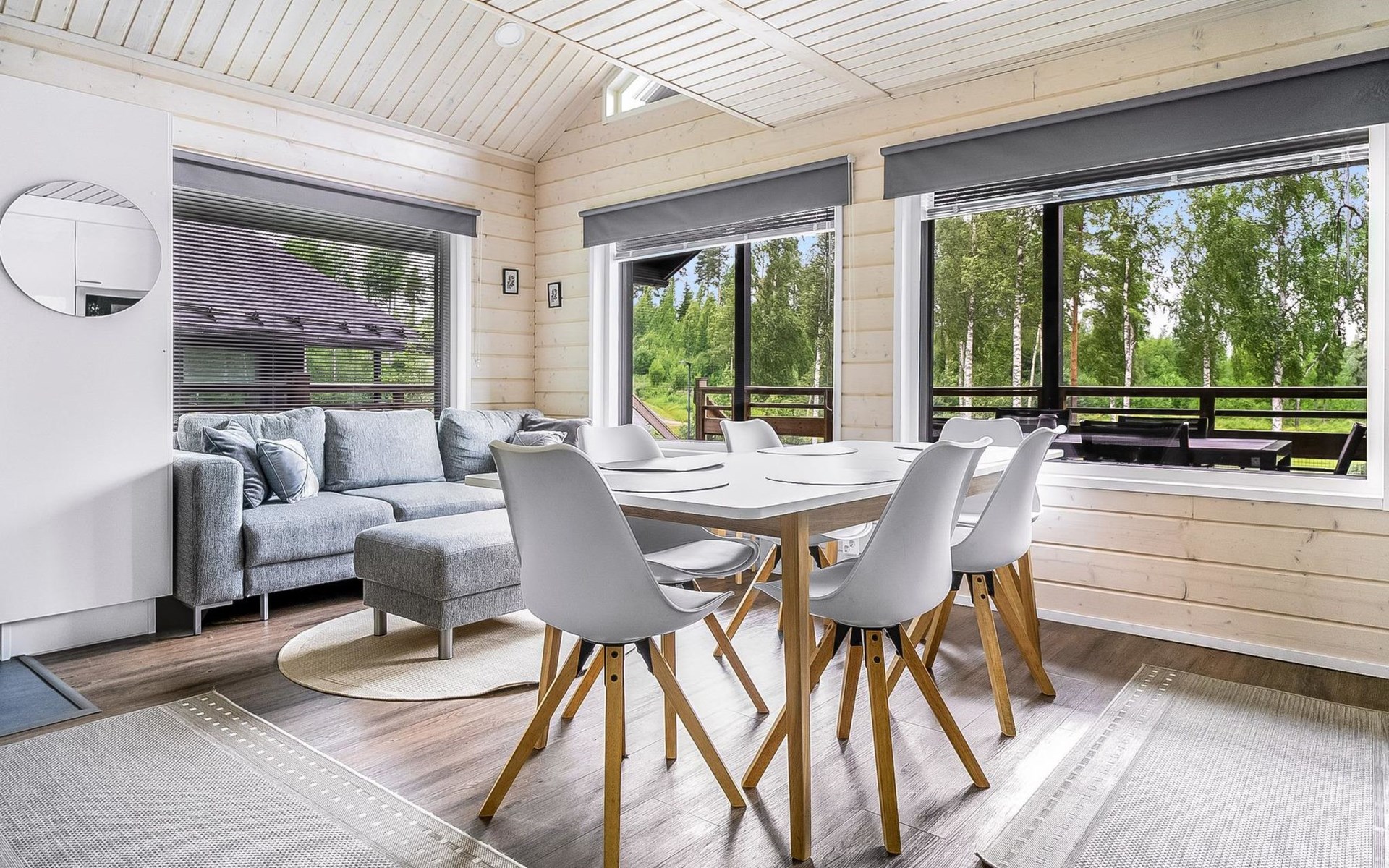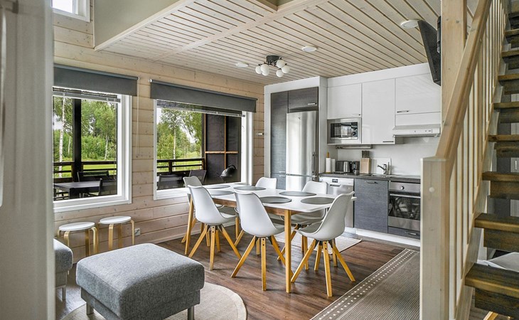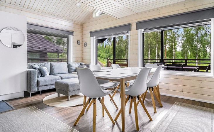 Log-built semi-detached apartment (2019). On the ground floor of the high-quality furnished apartment, there is a living room with a sofa bed (spread out 140x205 cm) and a kitchen with a spacious dining table for six people.